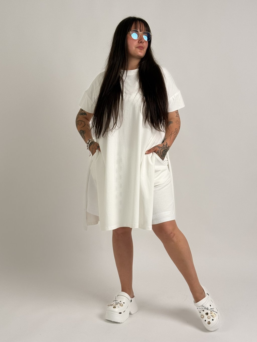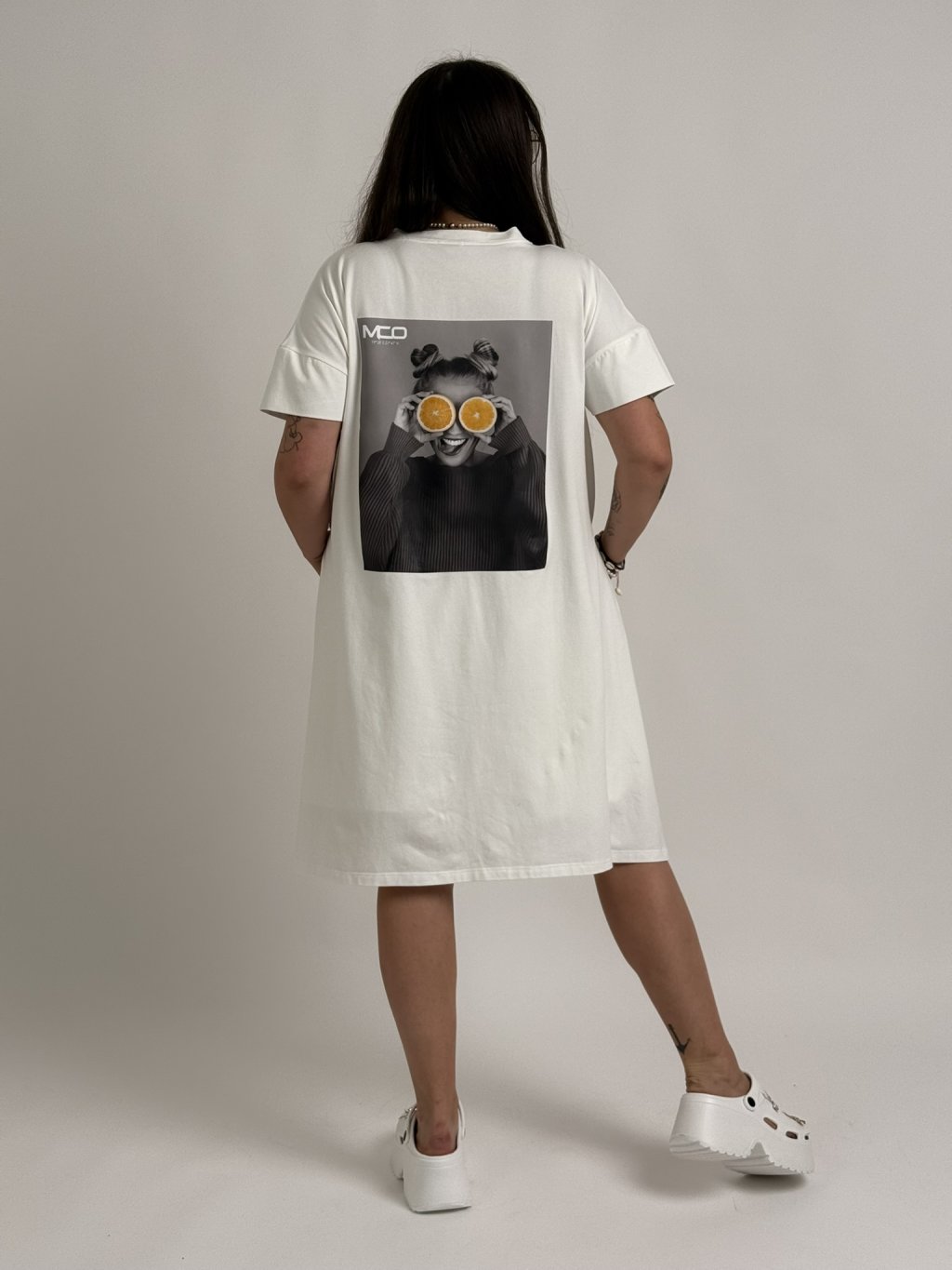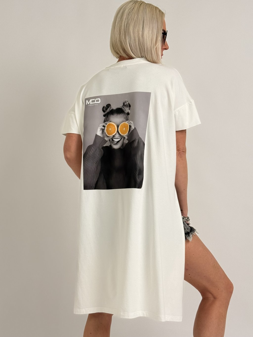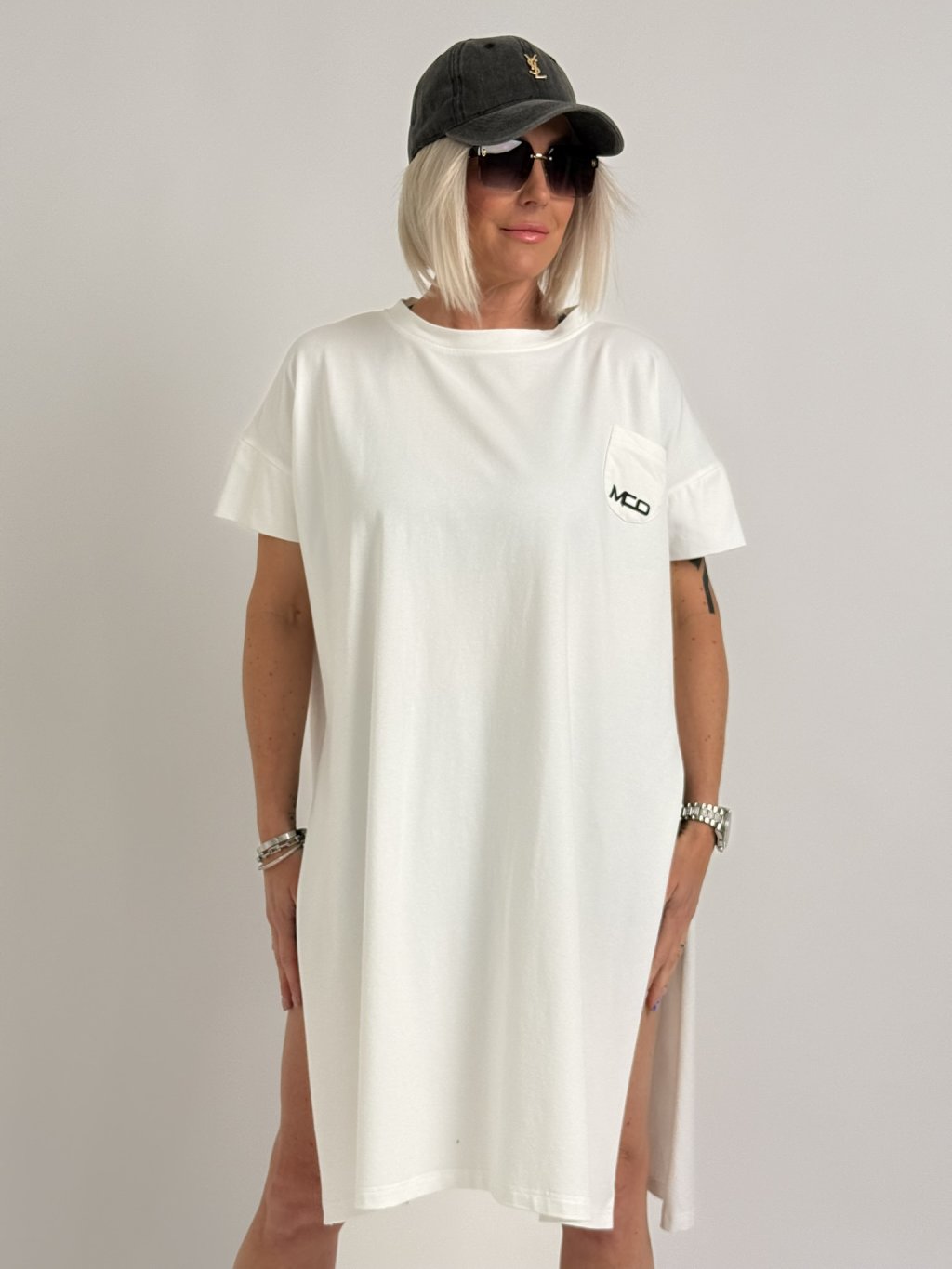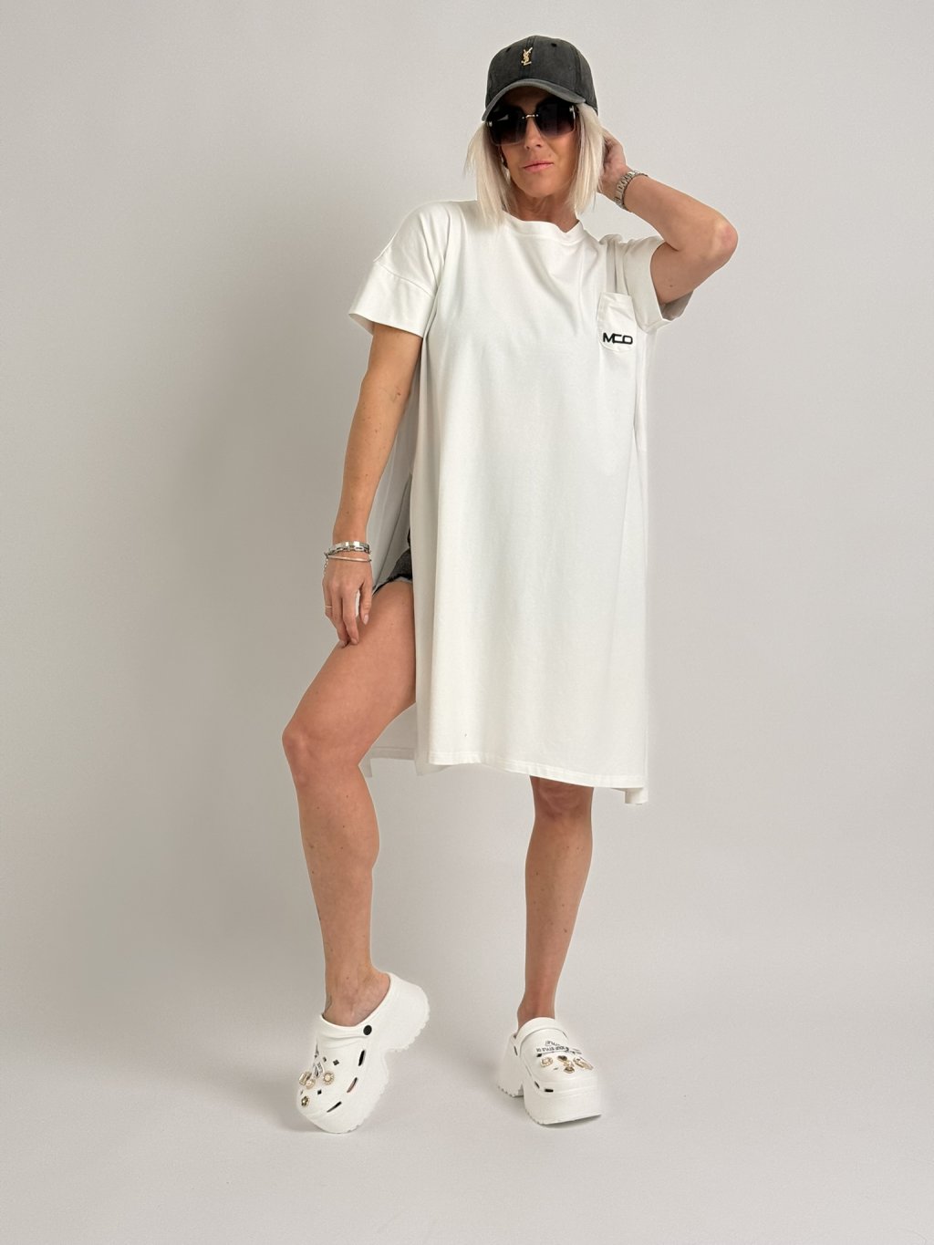 Jednoduchá bavlnená tunika nadrozmernej veľkosti s bočnými rozparkami, potlačou na chrbte a vreckom vpredu.