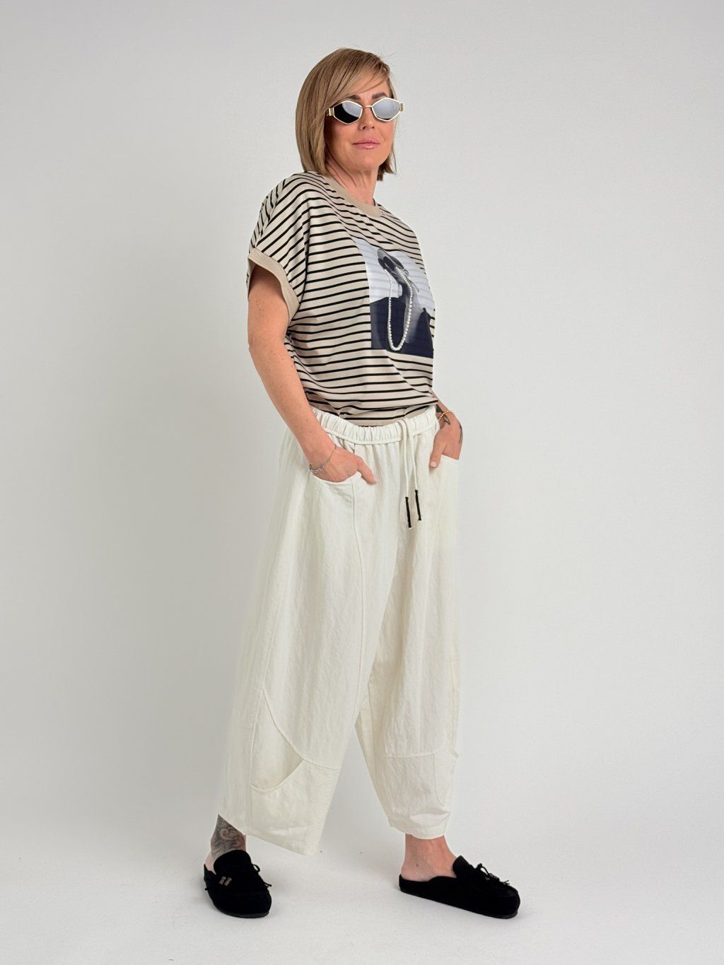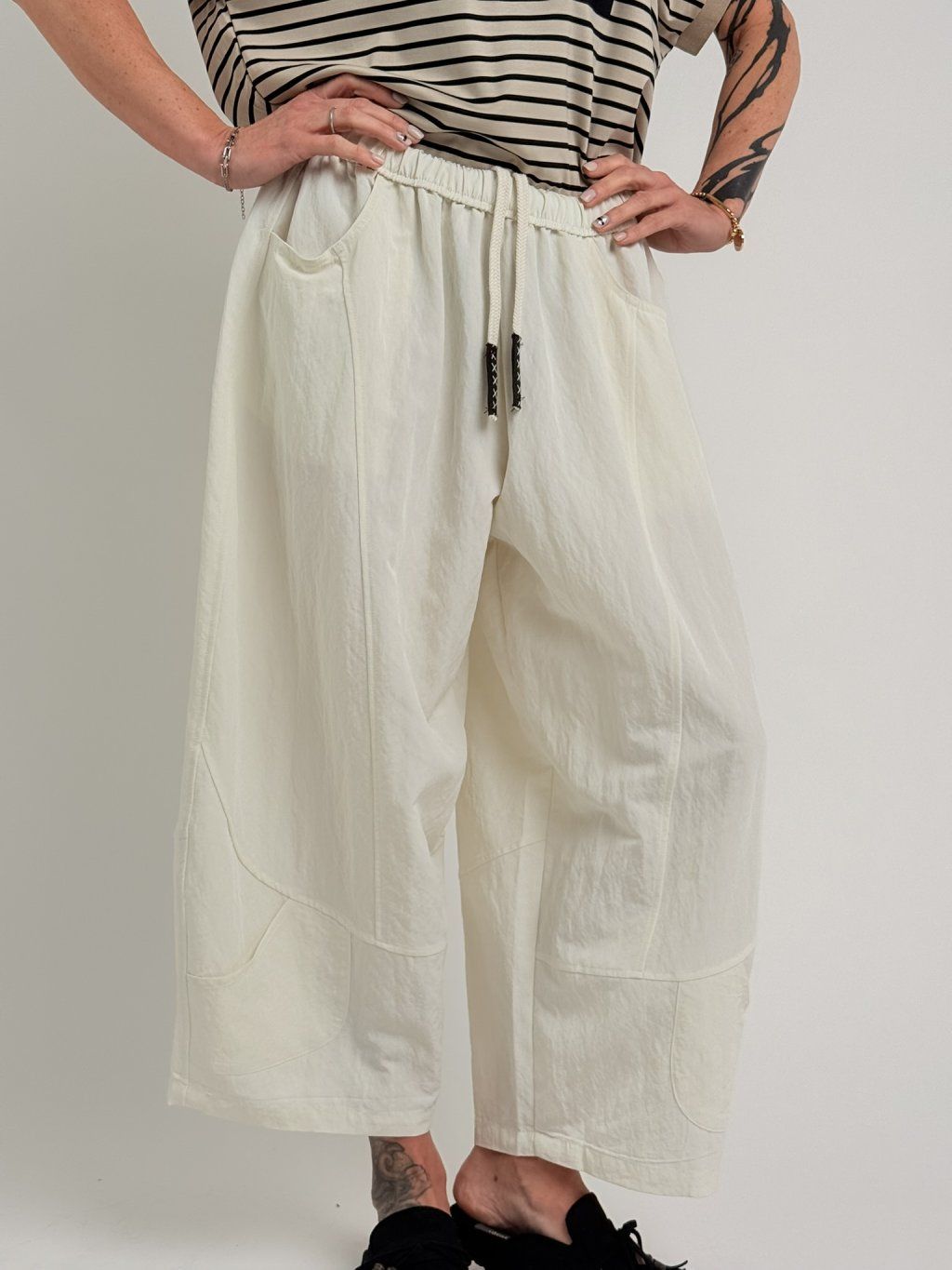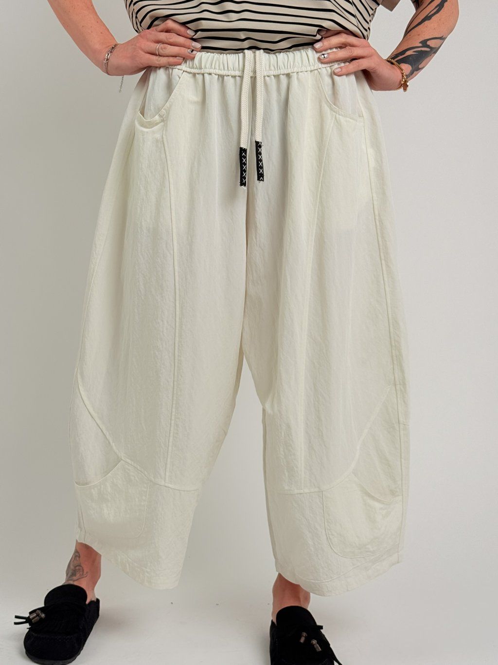 Nohavice balónového strihu s elastickým pásom, štepovaním a ozdobným baggym na nohaviciach. Super strih a materiál.