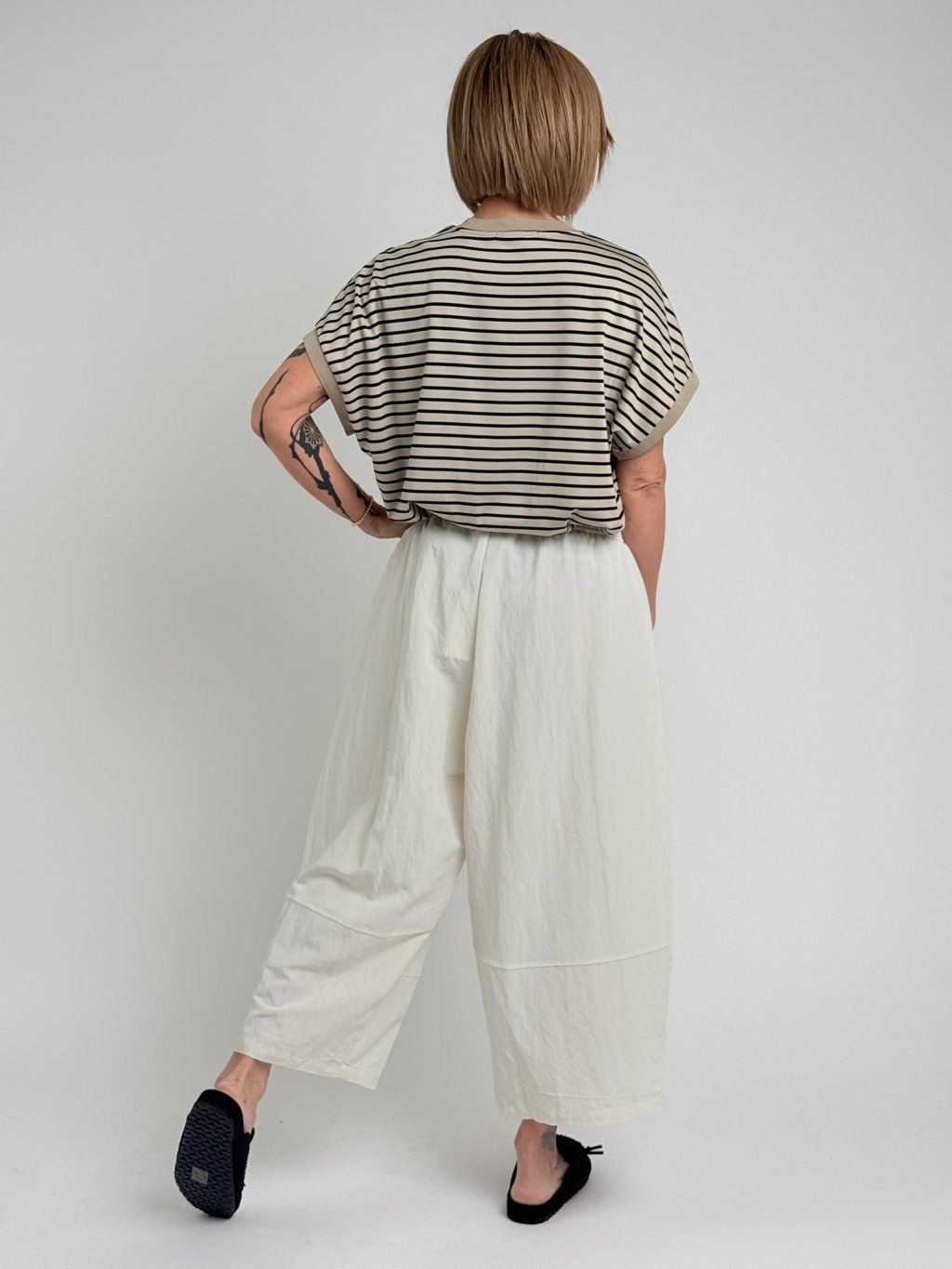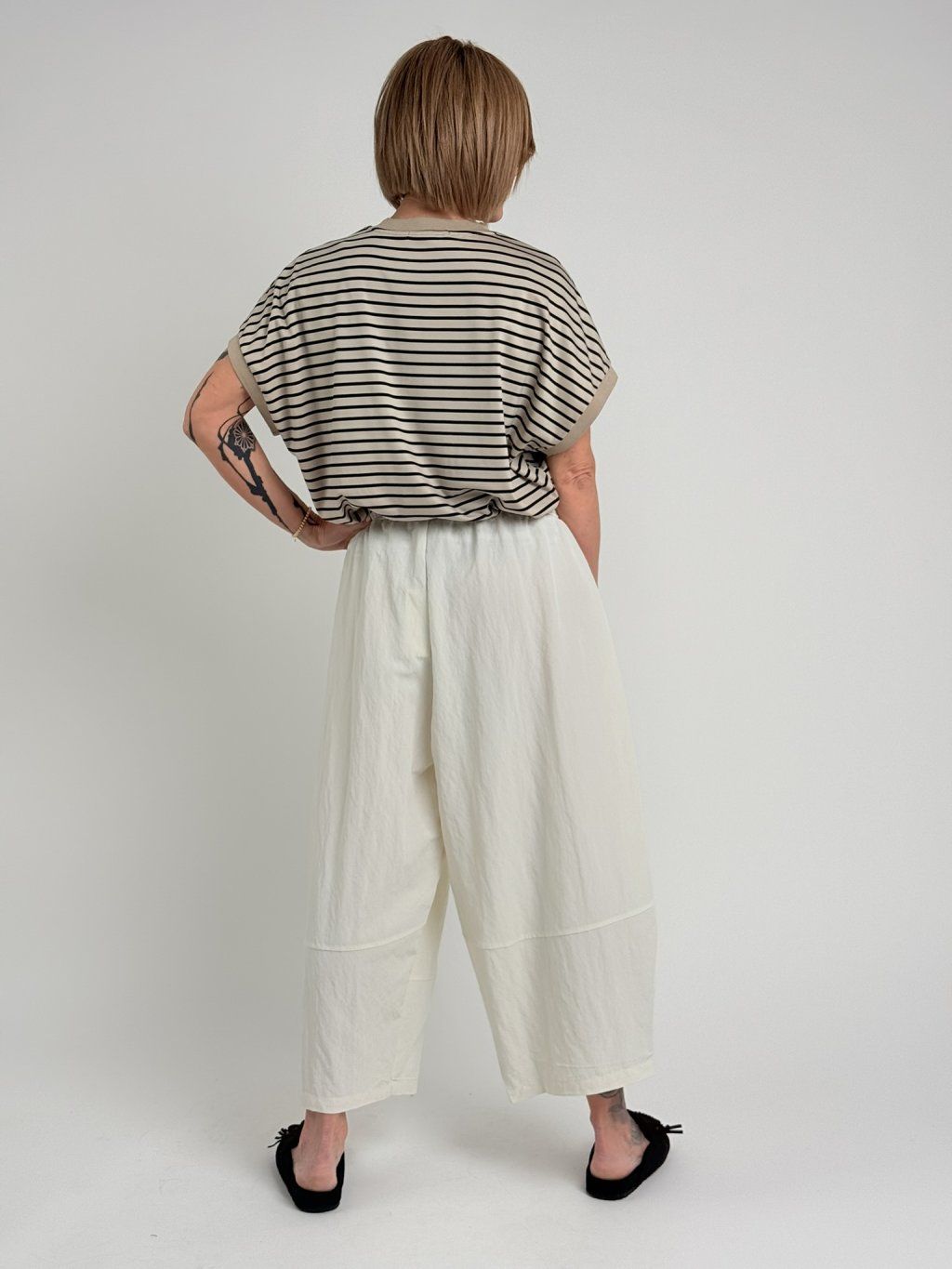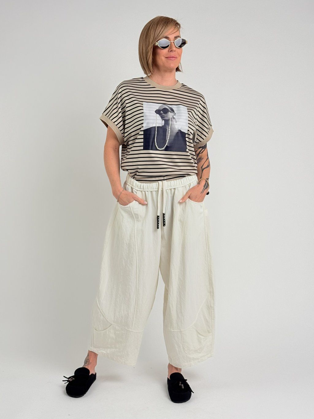 Nohavice balónového strihu s elastickým pásom, štepovaním a ozdobným baggym na nohaviciach. Super strih a materiál.