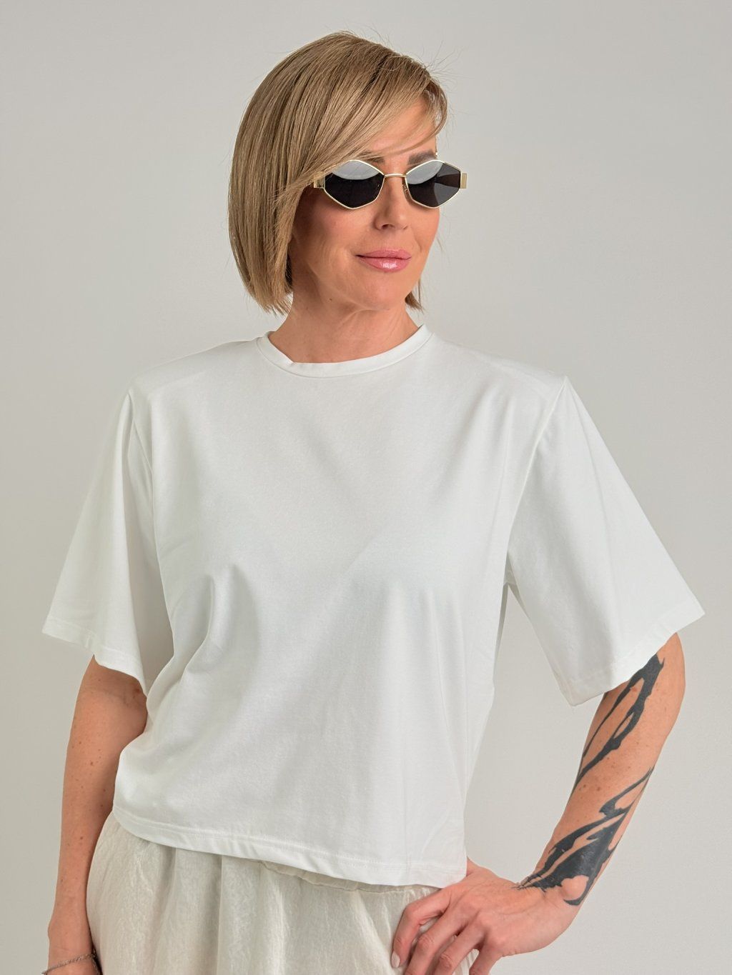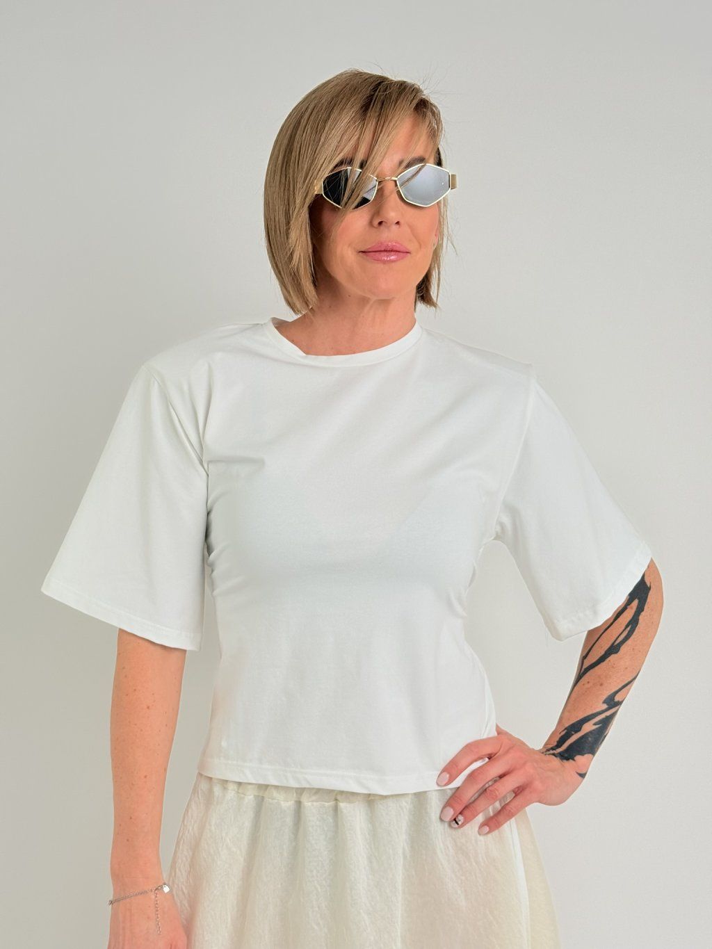 Dokonalá košeľa s rukávmi po lakte, ramennými vypchávkami, nariaseným chrbtom a opaskom na vnútornej strane, ktorý zmenšuje šírku.