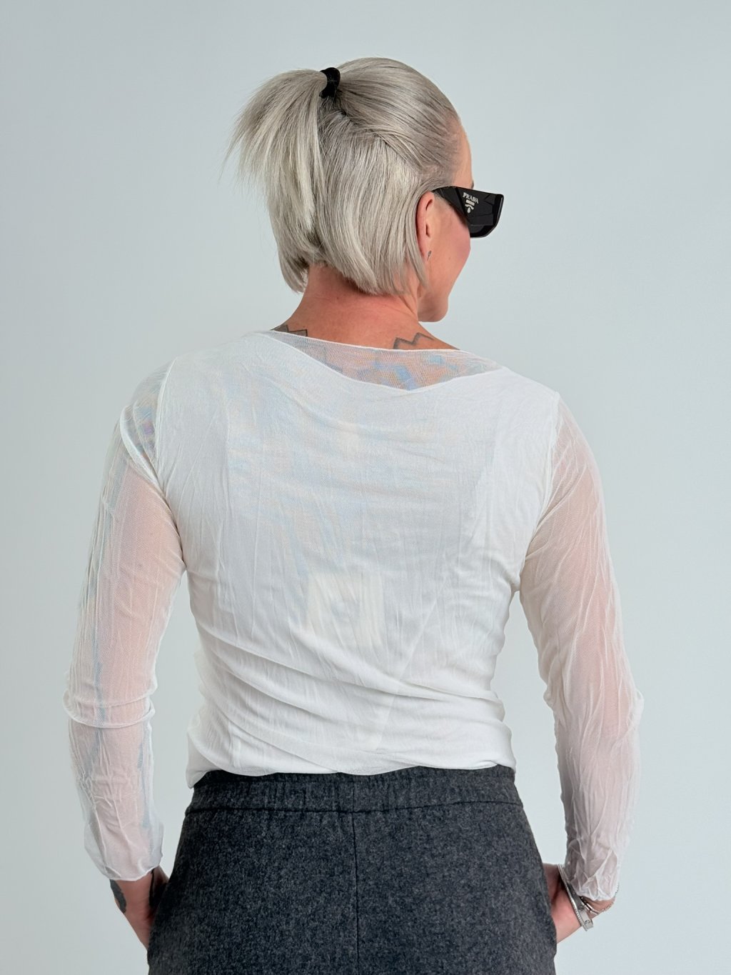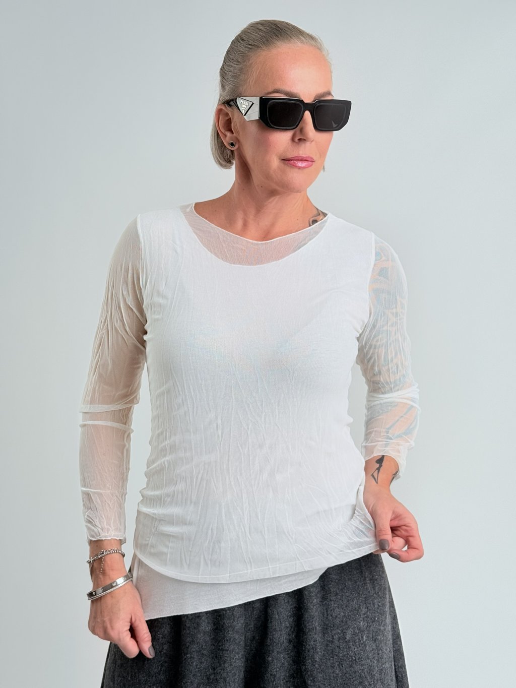 Krásna, elastická šifónová košeľa s vnútorným tielkom, dlhými rukávmi a lodičkovým výstrihom.