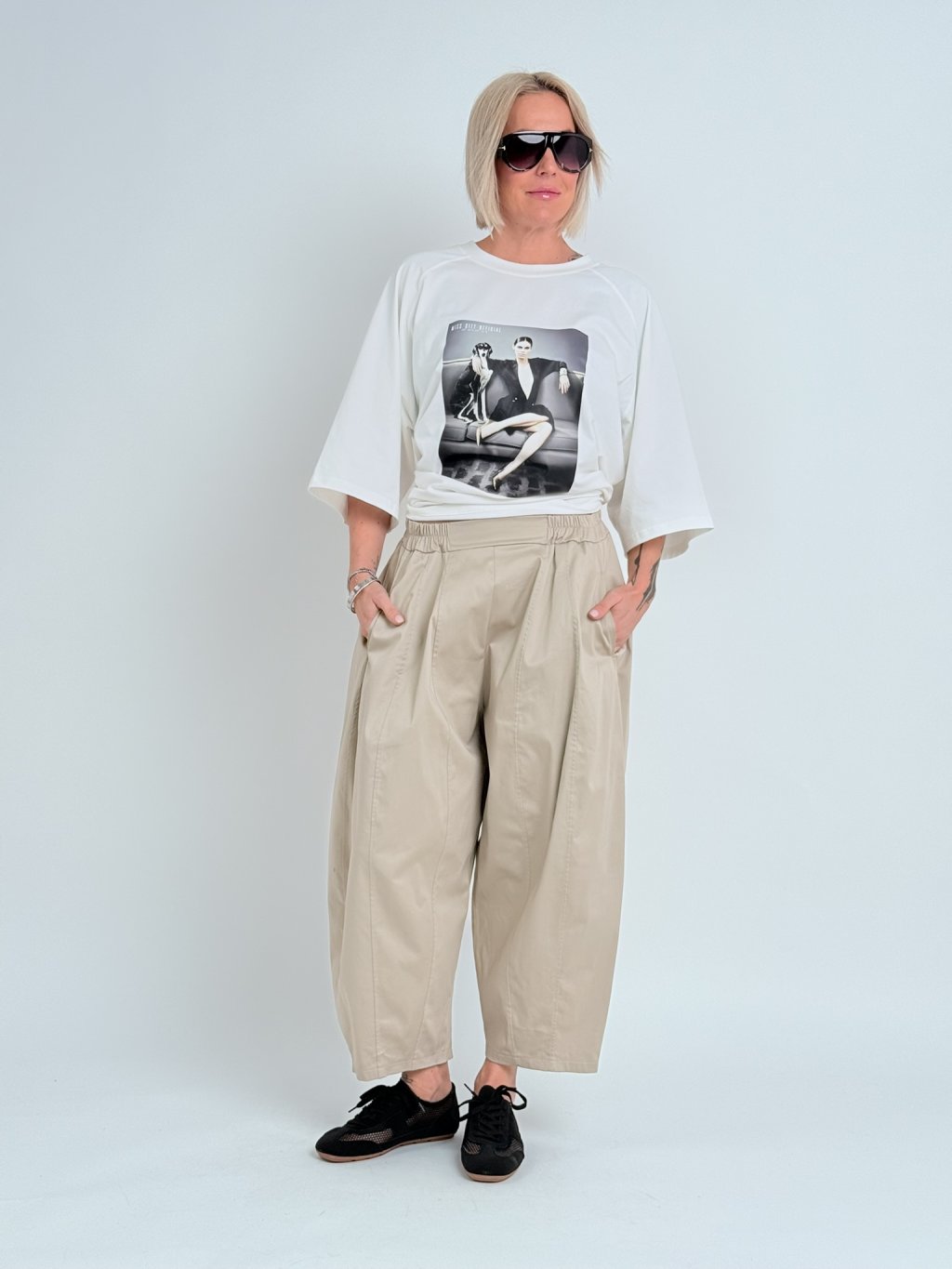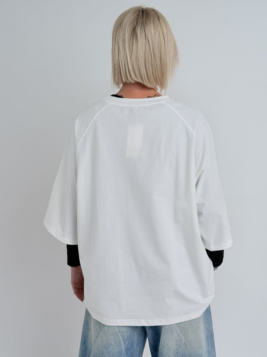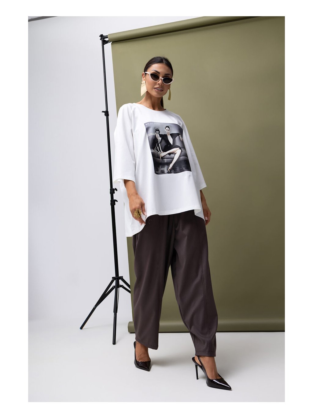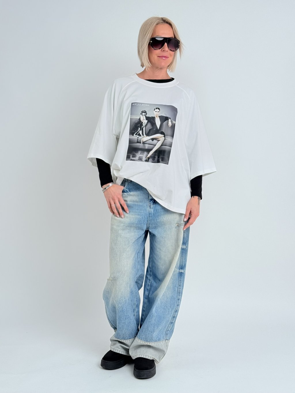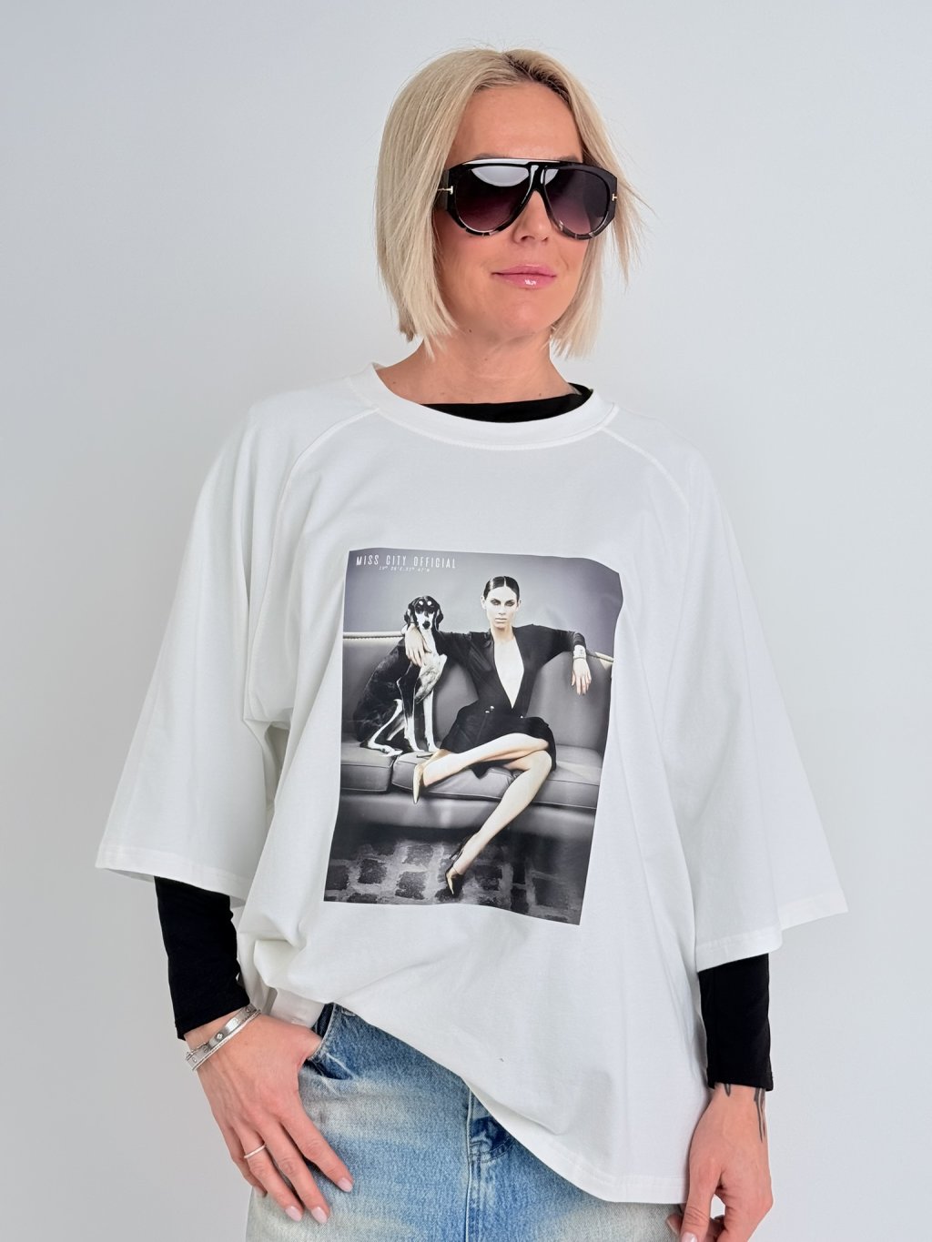 Parádne, nadrozmerné, dlhšie tričko s okrúhlym výstrihom, rukávmi po lakte a obrázkom na prednej strane.