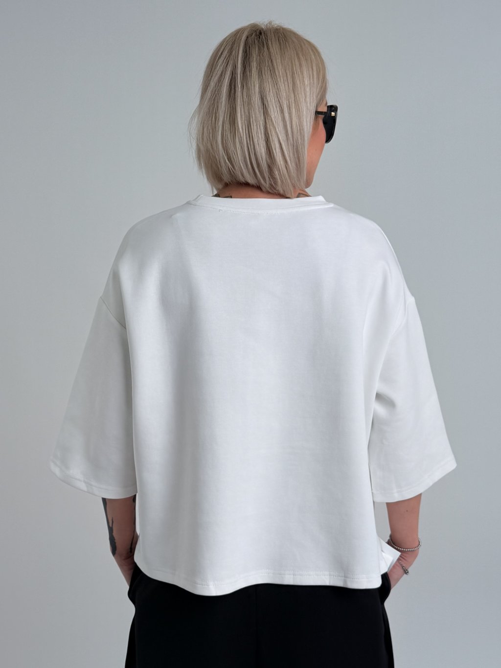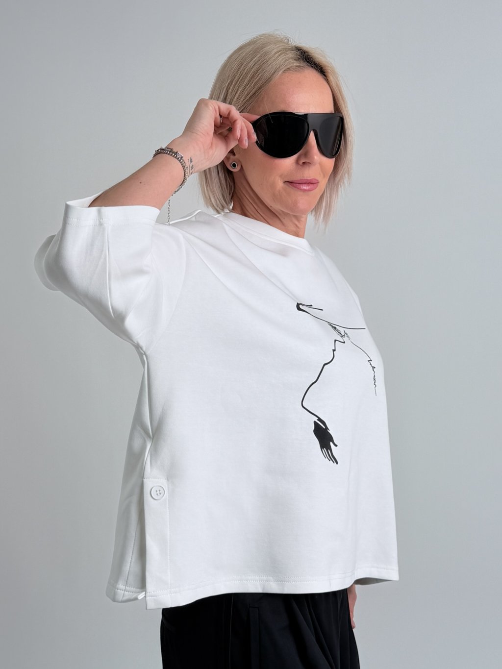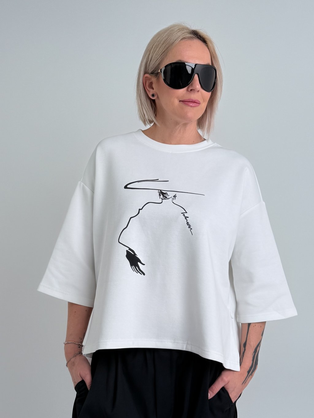 Voľnejšie, dlhšie tričko s okrúhlym výstrihom, rukávmi v dĺžke po lakeť, bočnými rozparky a siluetou na prednej strane.