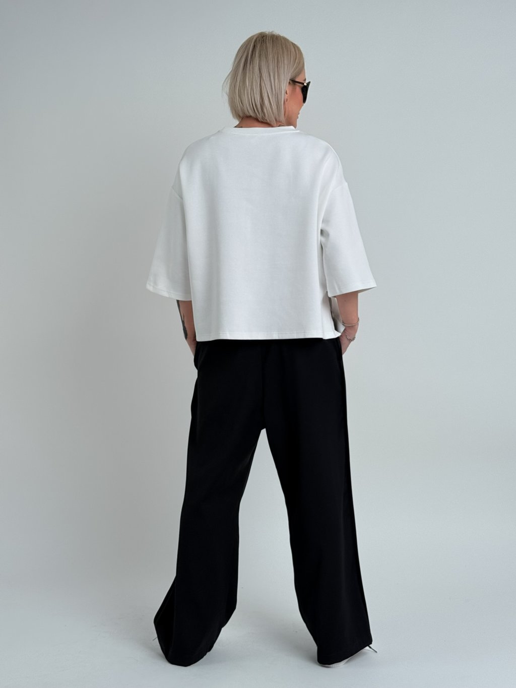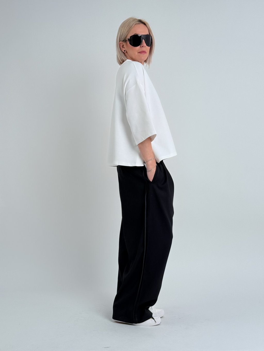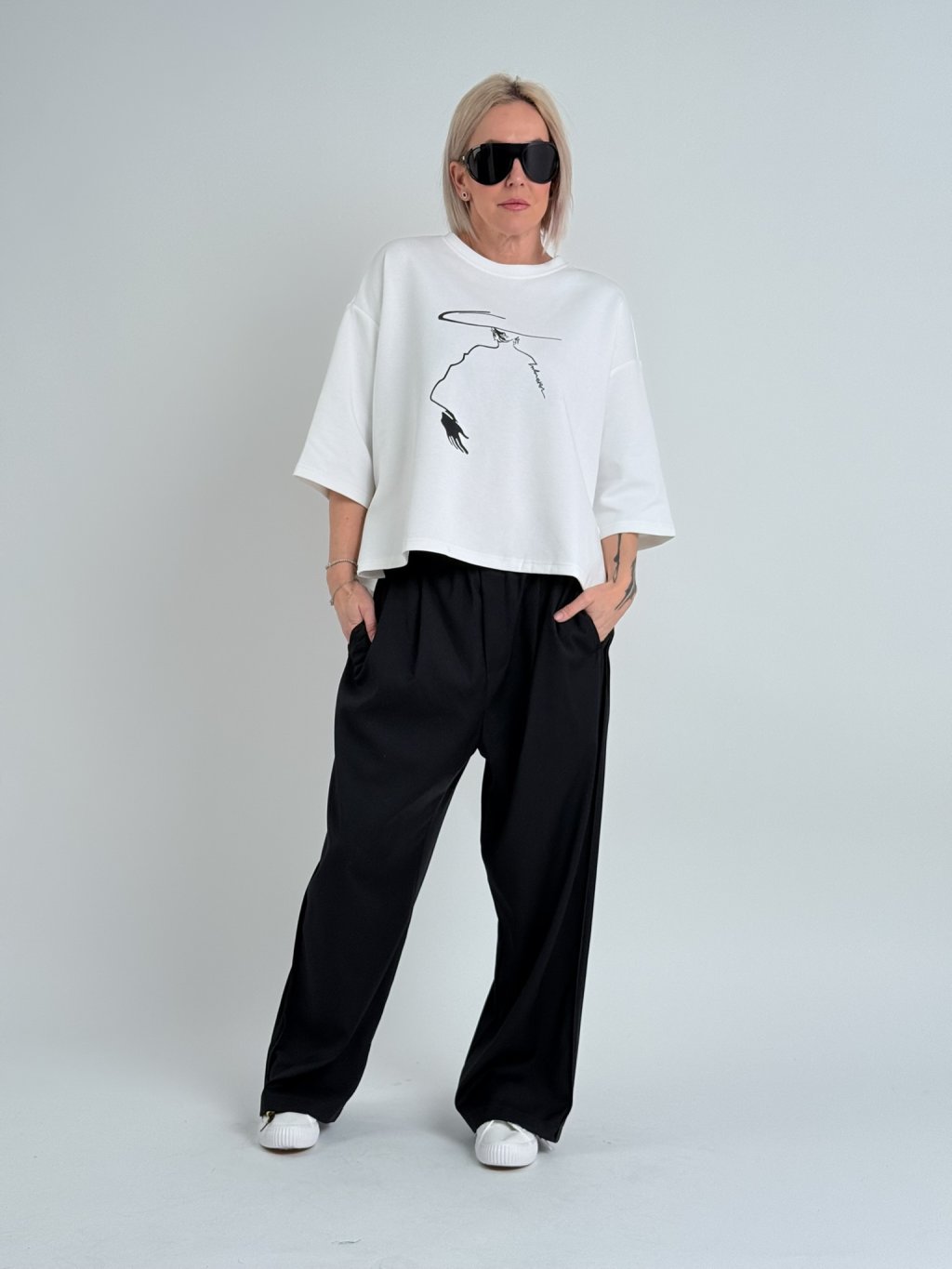 Voľnejšie, dlhšie tričko s okrúhlym výstrihom, rukávmi v dĺžke po lakeť, bočnými rozparky a siluetou na prednej strane.