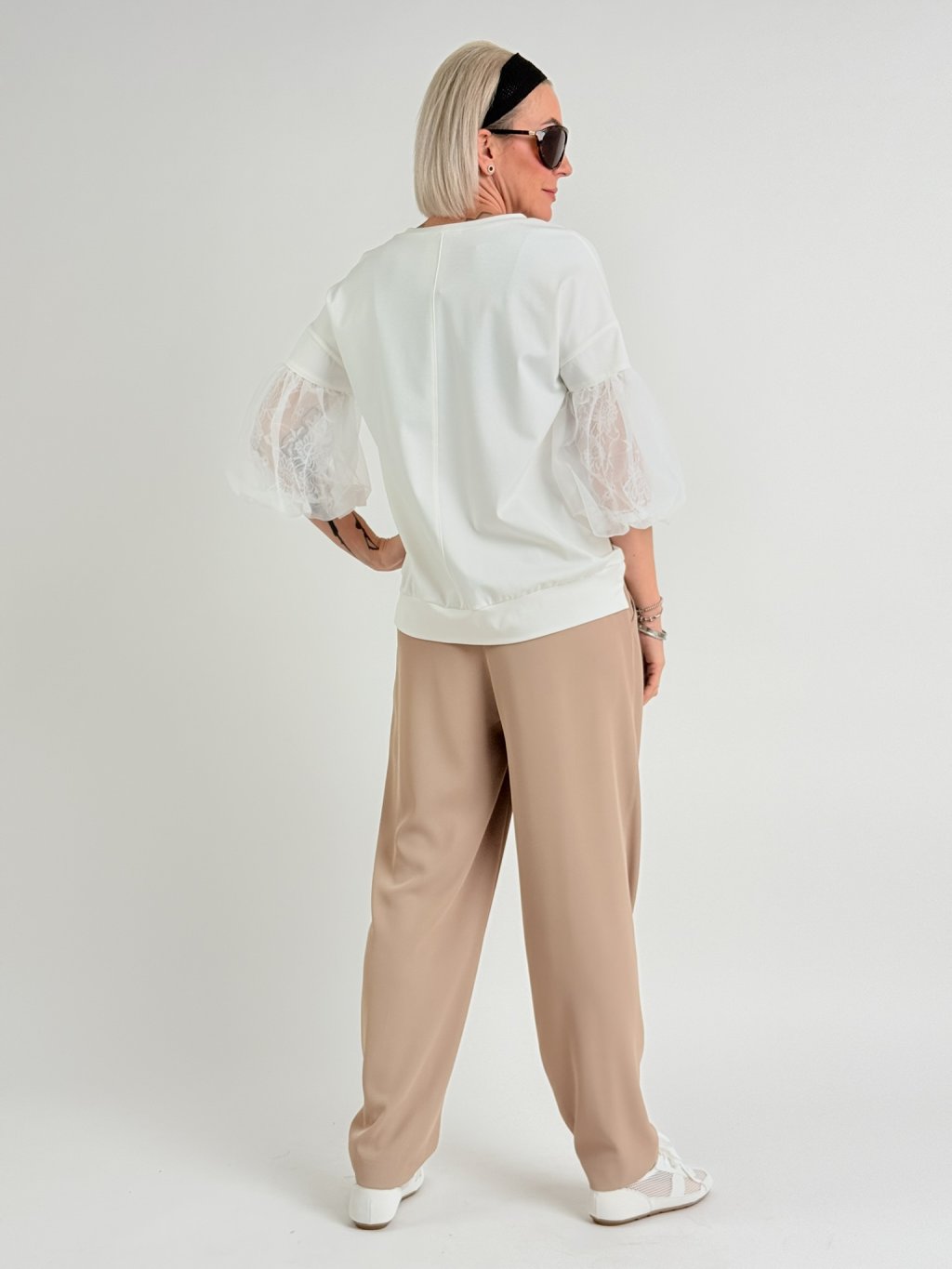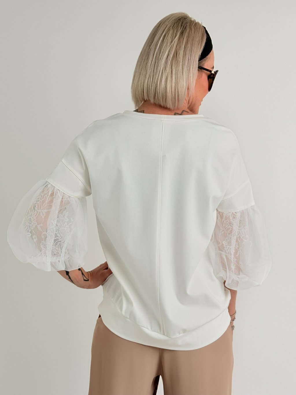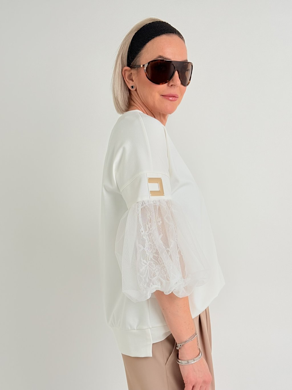 Luxusný top s mierne predĺženým zadným dielom, 3/4 tylovými balónovými rukávmi, podšitý čipkou. Predná časť je zdobená zlatom.