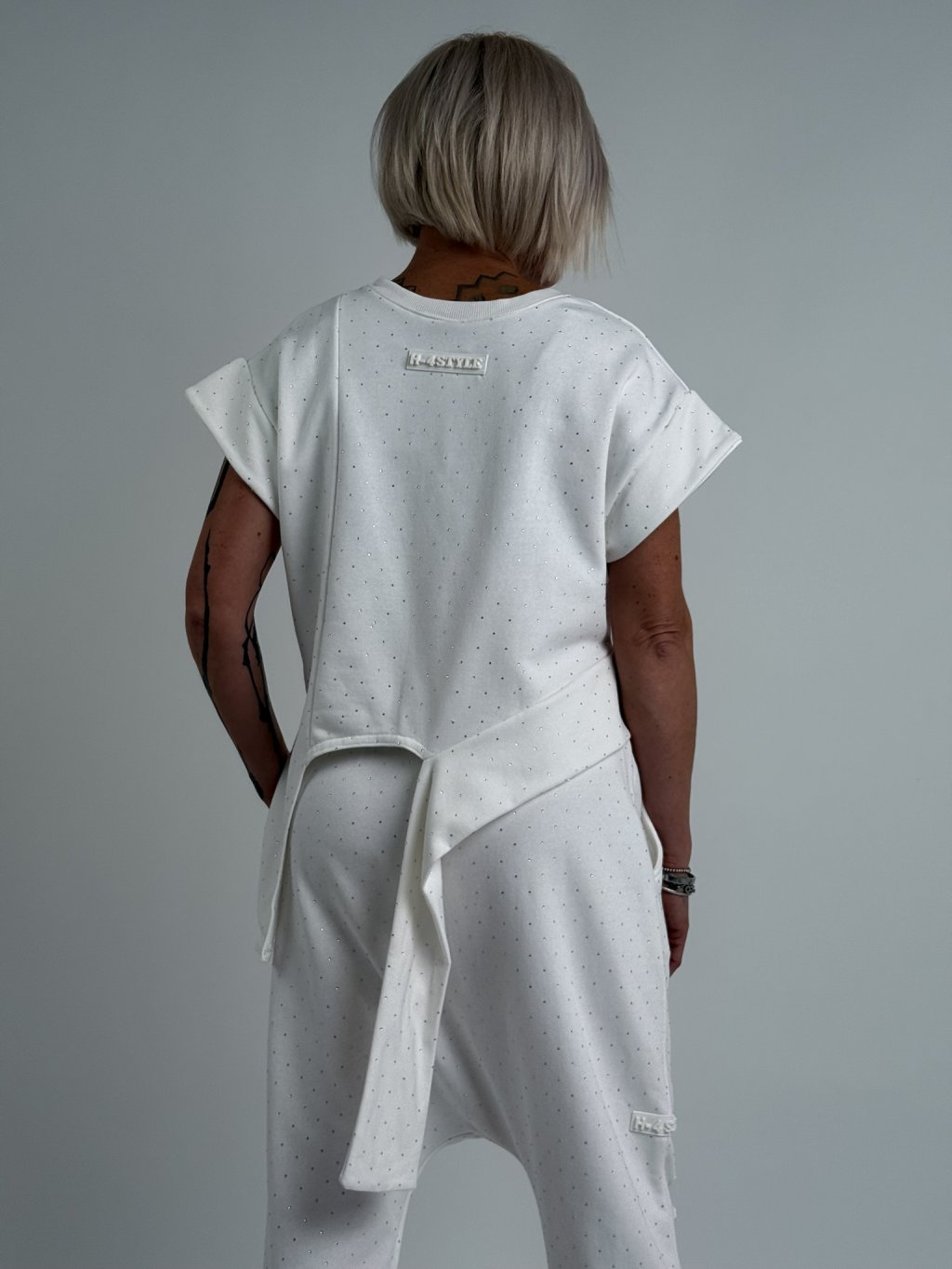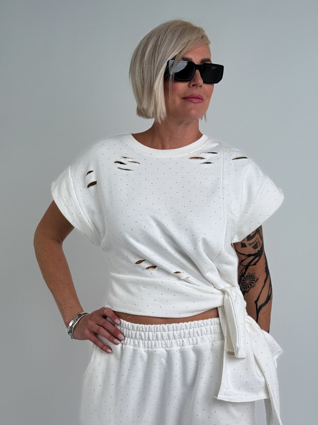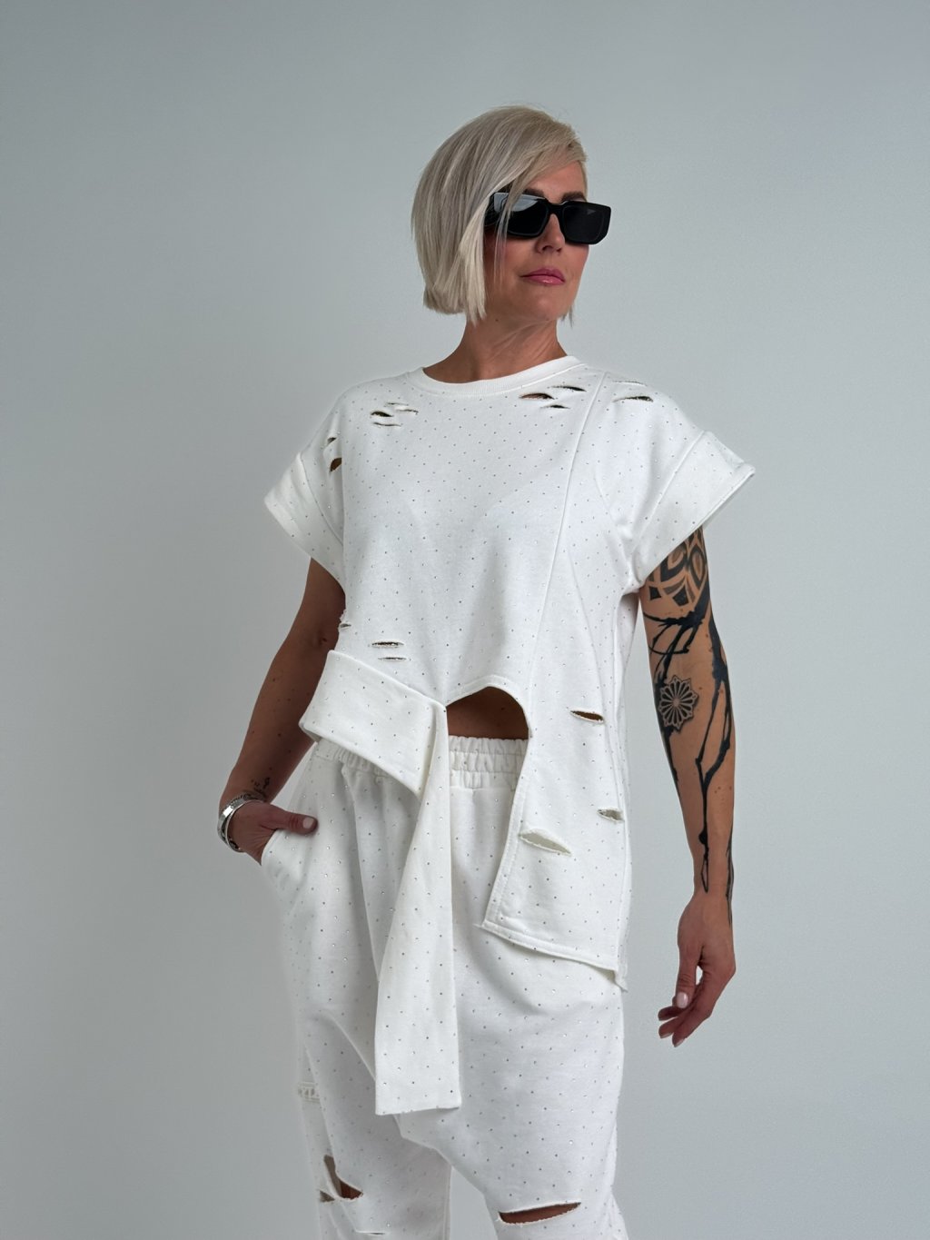 Super, asymetrický top so spadnutými rukávmi, zaujímavo riešený spodný okraj topu. Celý top je zdobený výrezmi a malými kamienkami.