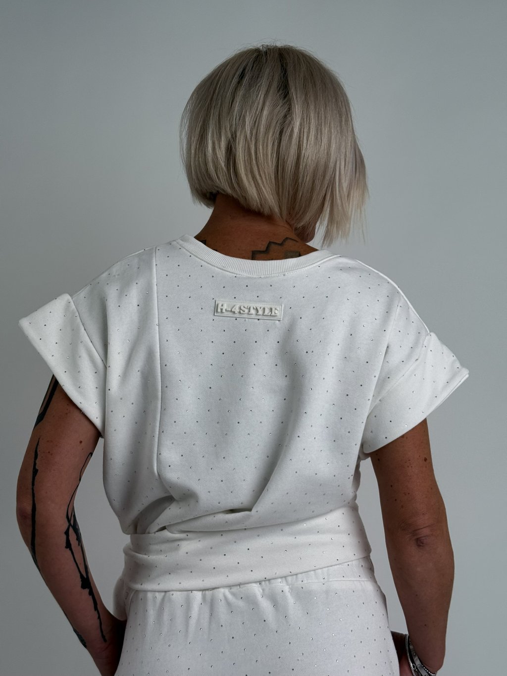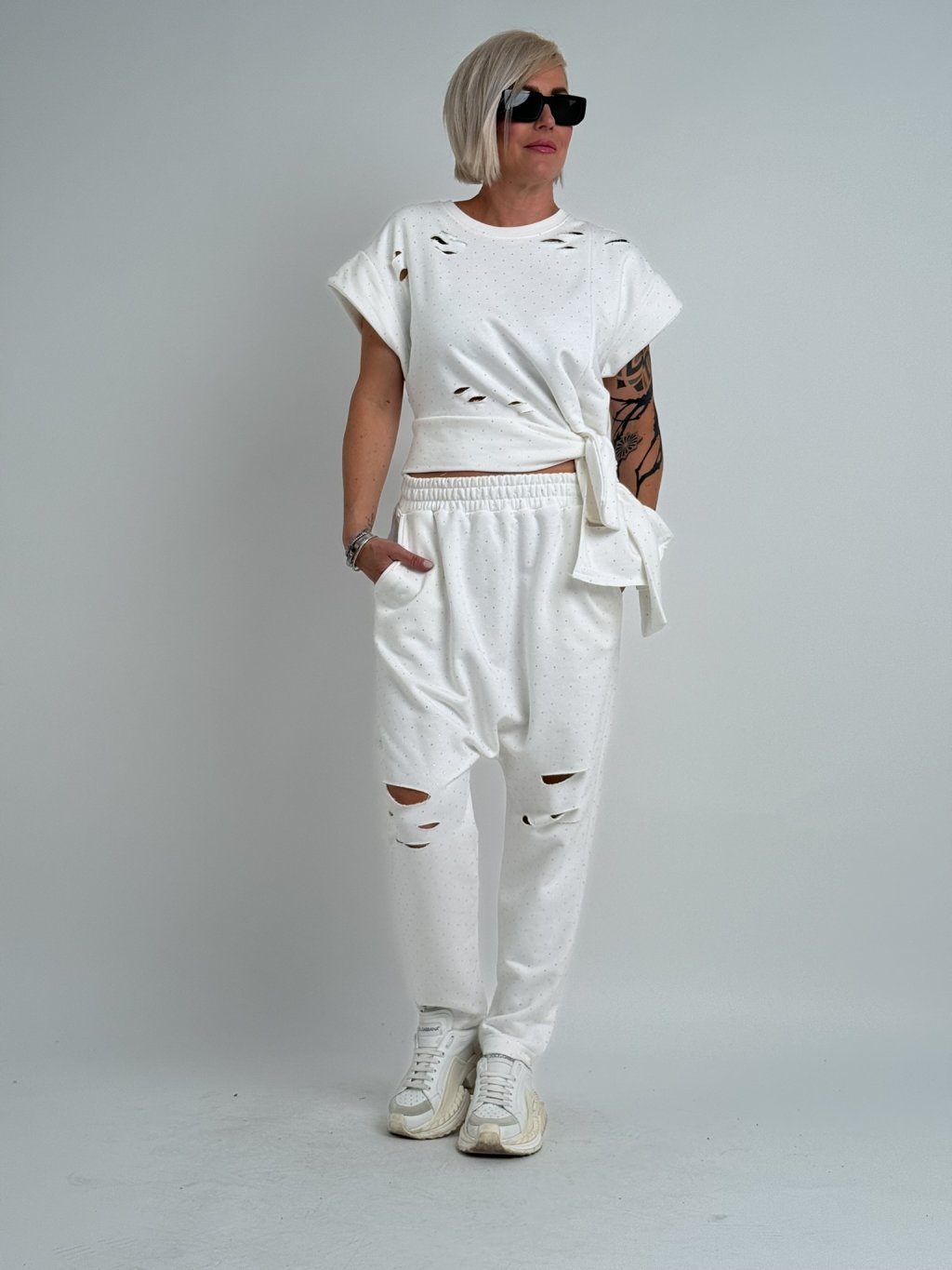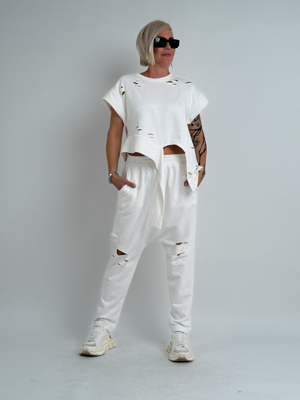 Super, asymetrický top so spadnutými rukávmi, zaujímavo riešený spodný okraj topu. Celý top je zdobený výrezmi a malými kamienkami.