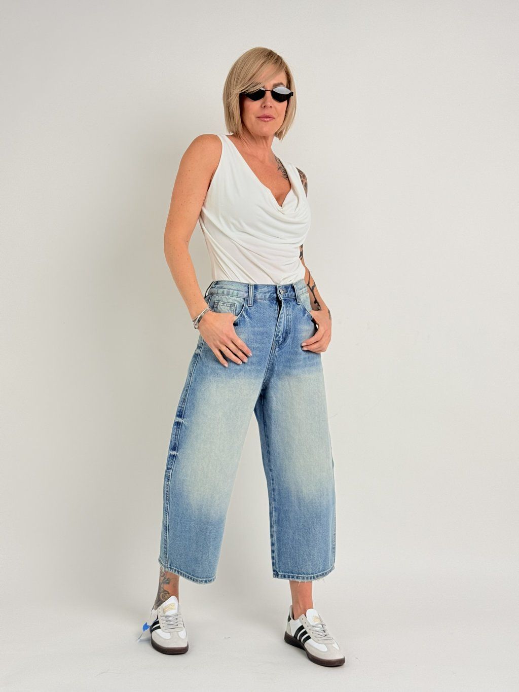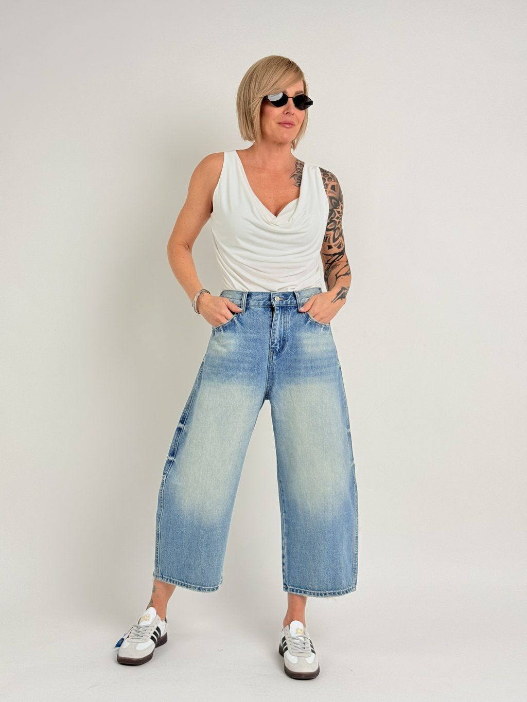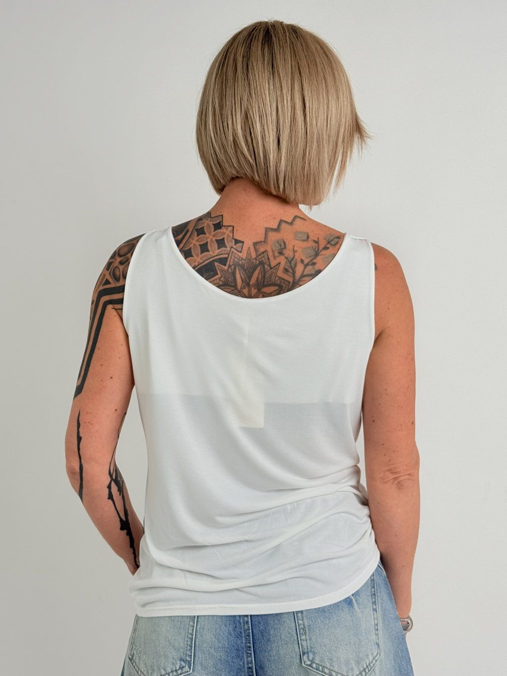 Veľmi elastický top bez rukávov s lodičkovým výstrihom, ktorý vytvára nariasený dojem "VODY".