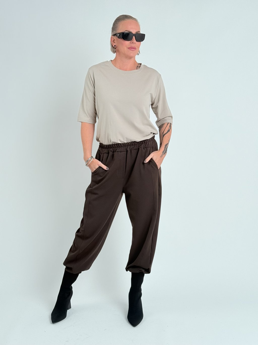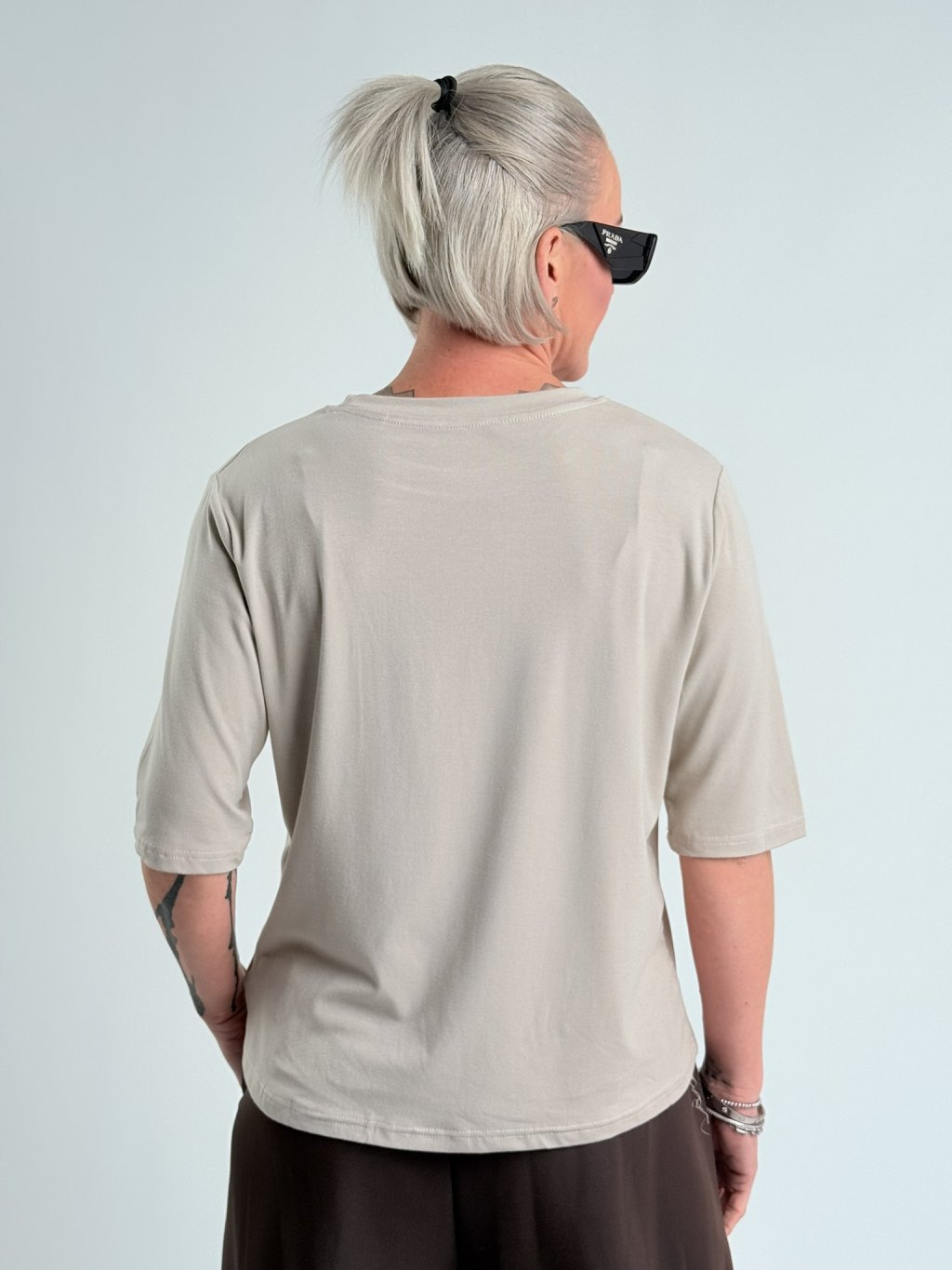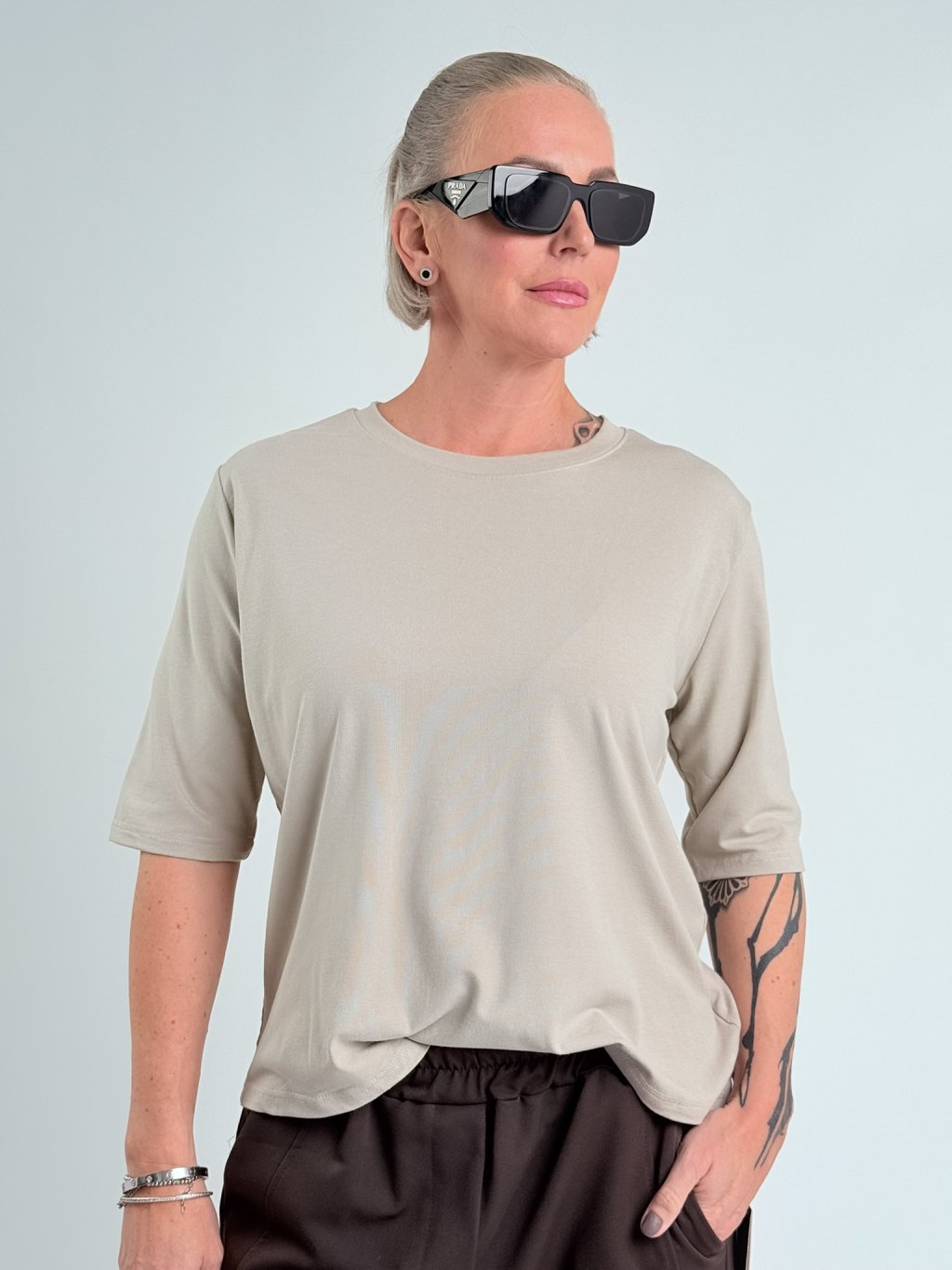 Jednoduché elastické tričko s okrúhlym výstrihom a rukávmi s dĺžkou po lakte.