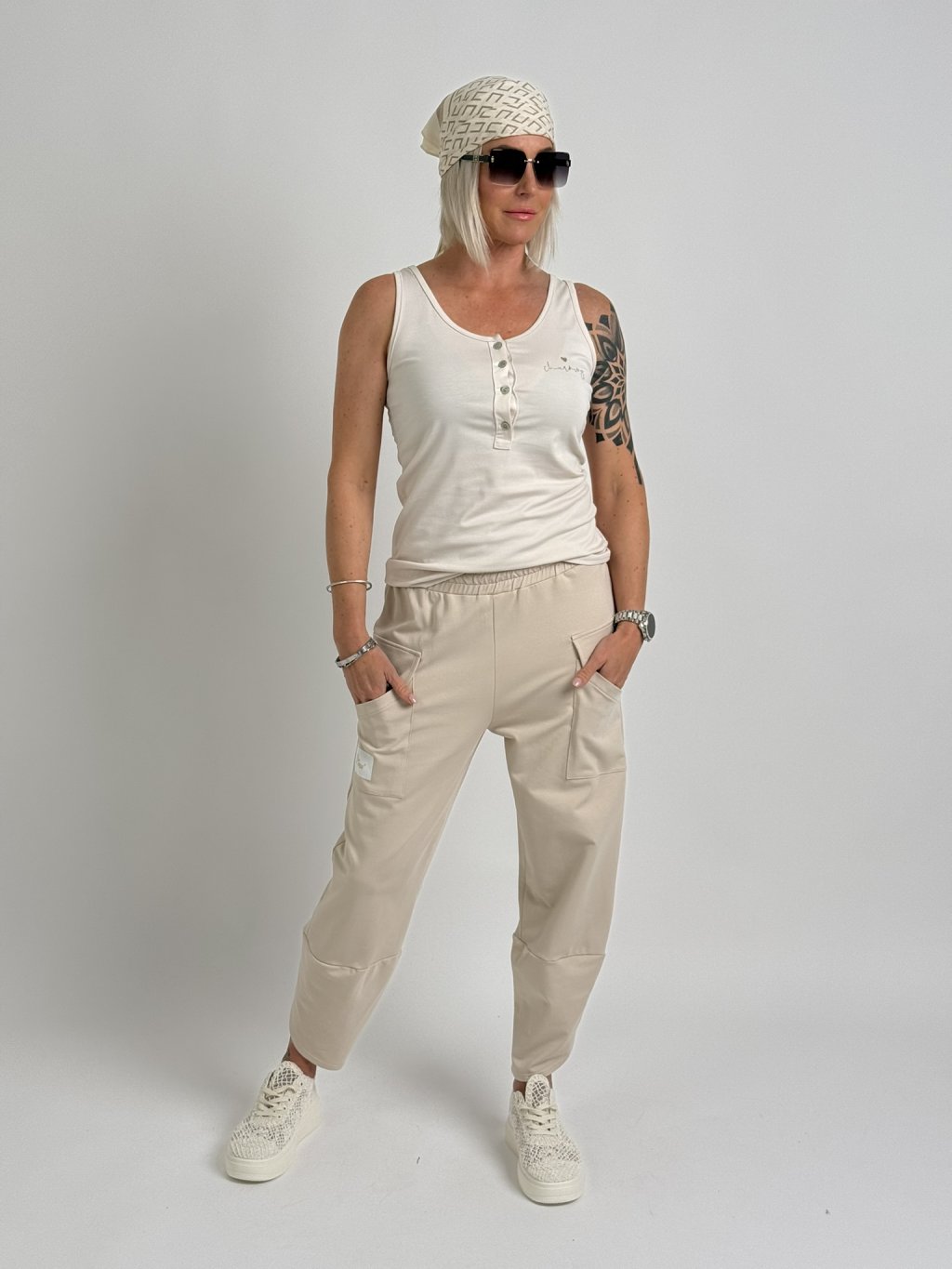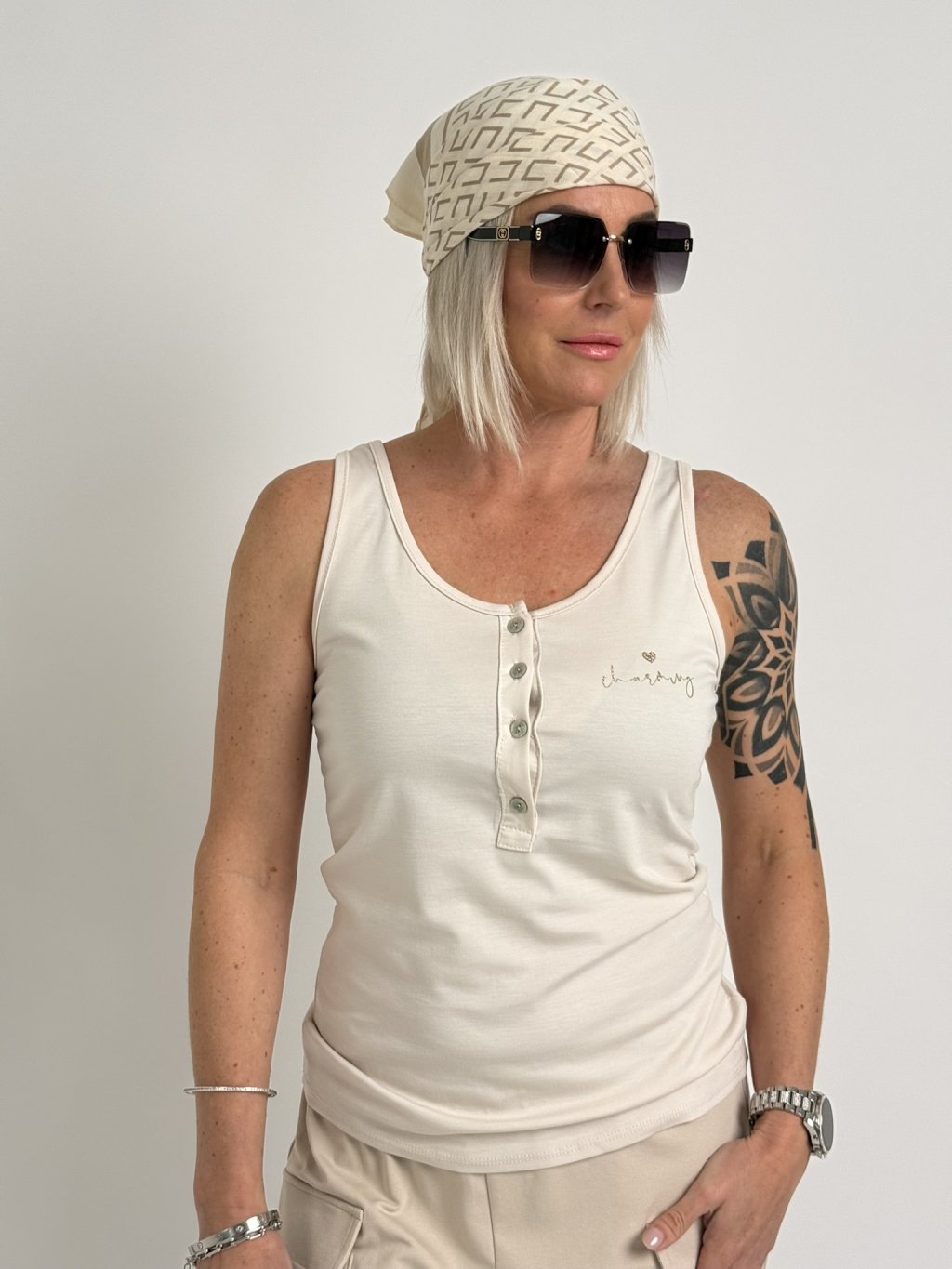 Jednoduché tielko s vyšším výstrihom, gombíkmi a malou potlačou na prednej strane. Skvelý materiál a strih.