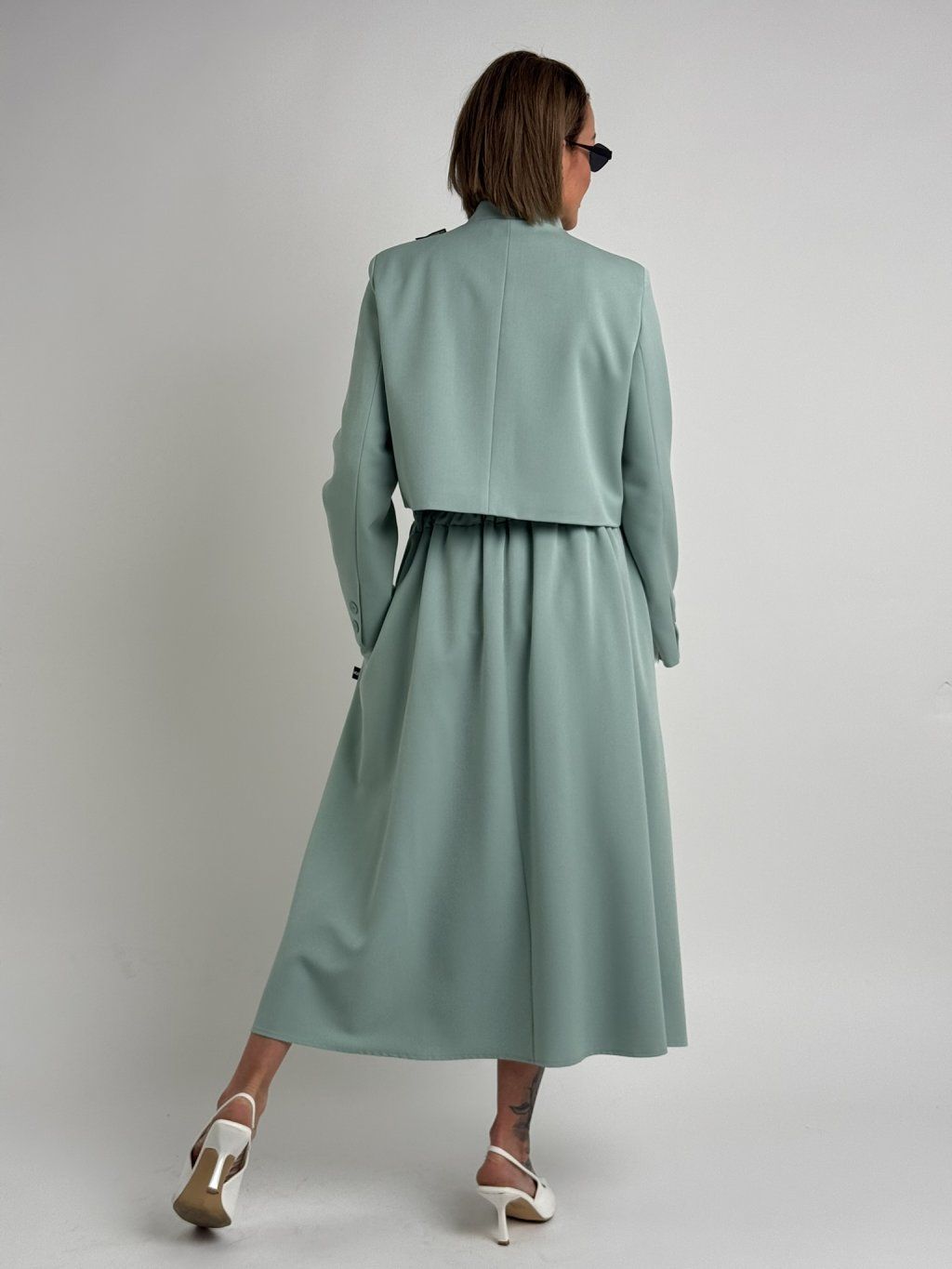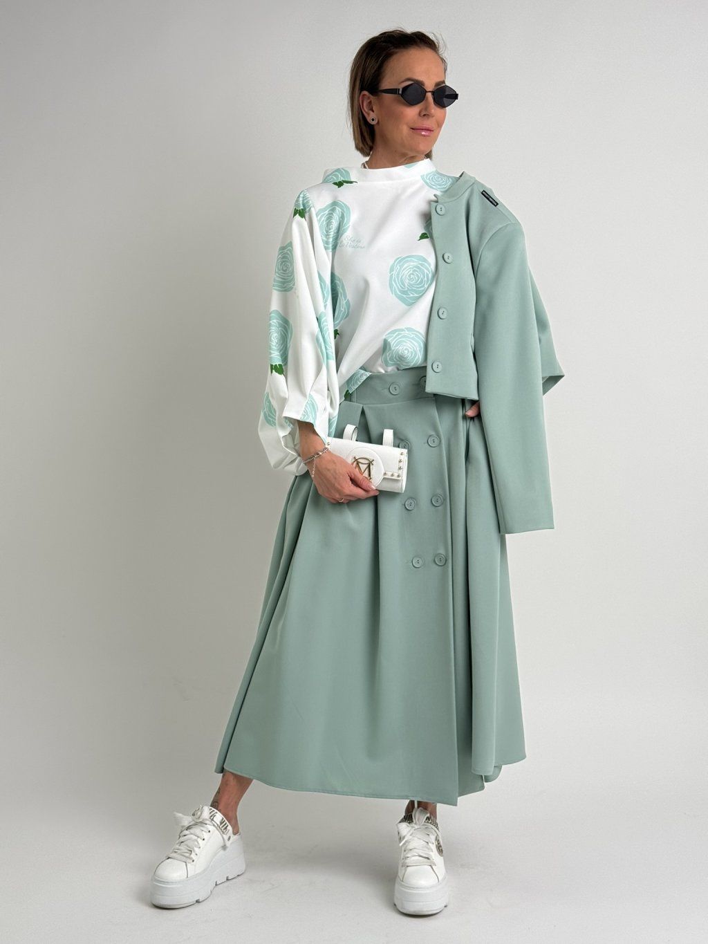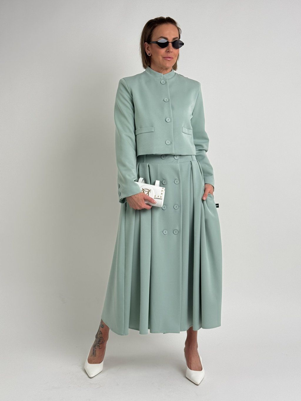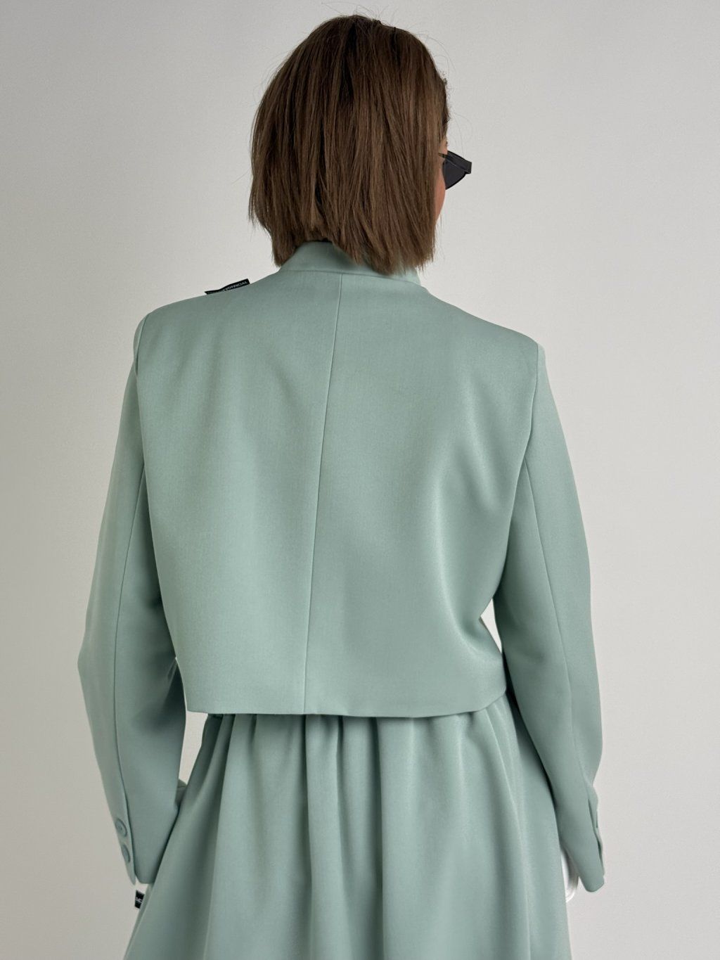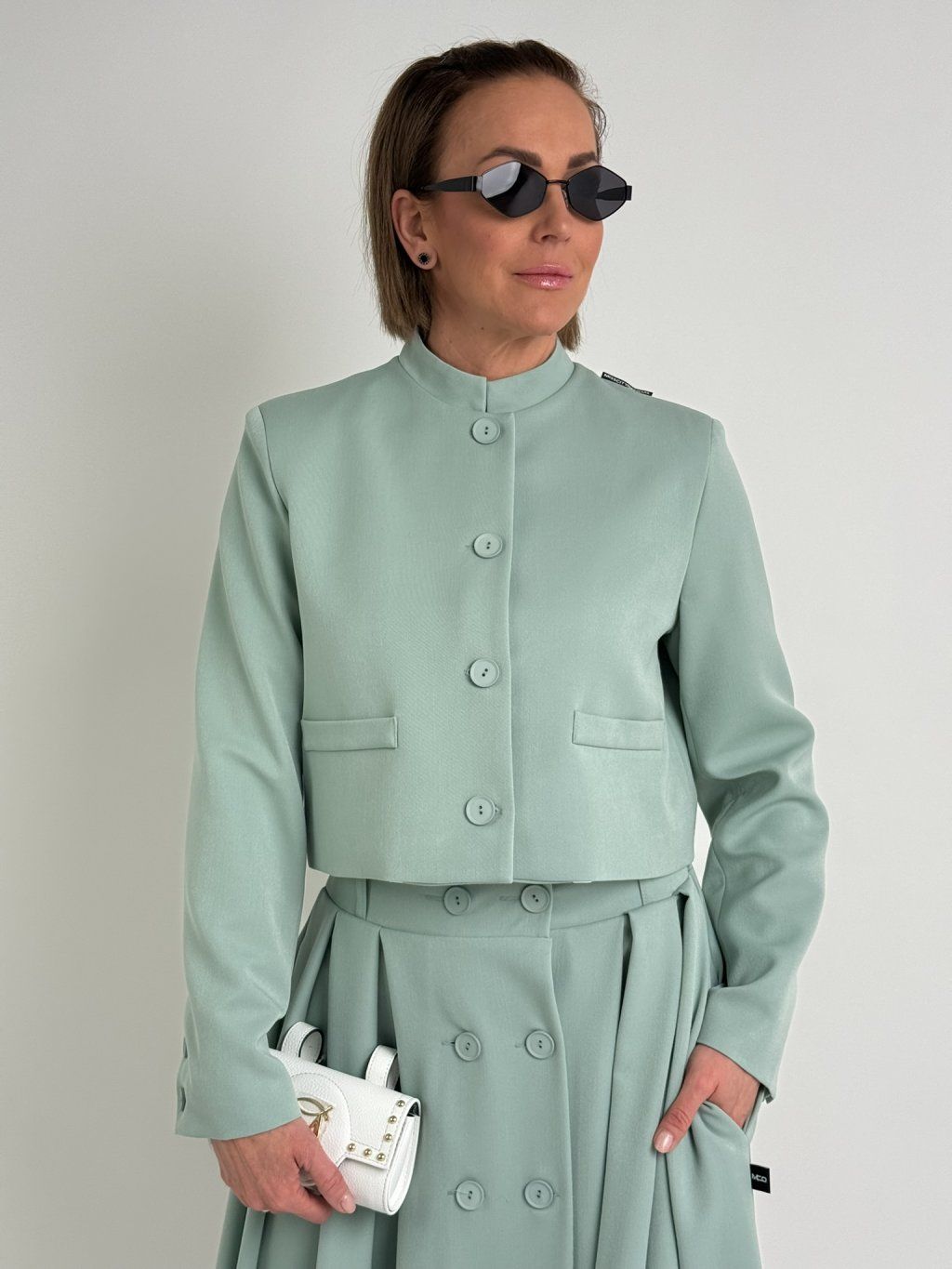 Luxusné kratšie sako s malým stojačikom, zapínaním na gombíky, prednými falošnými vreckami a ramennými vypchávkami.