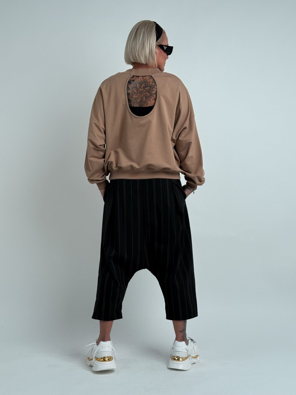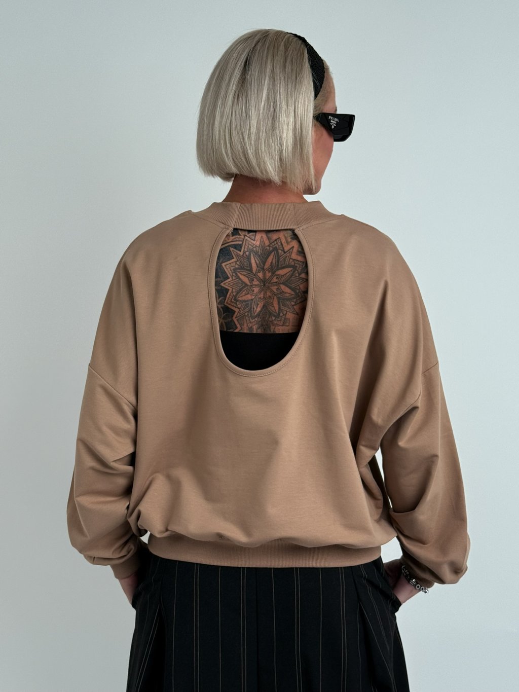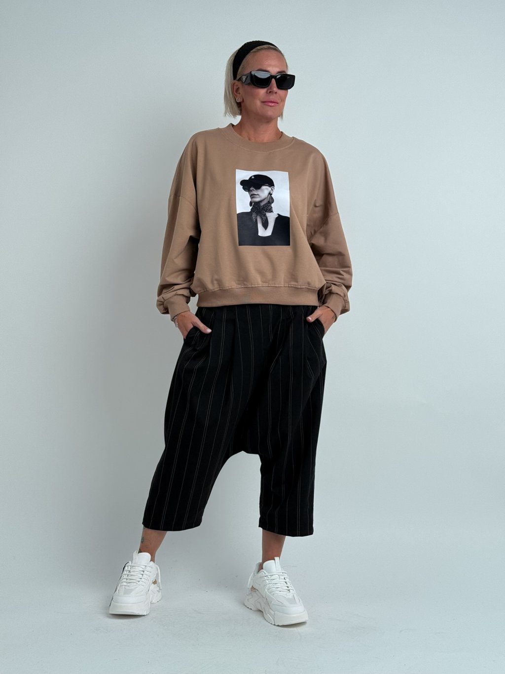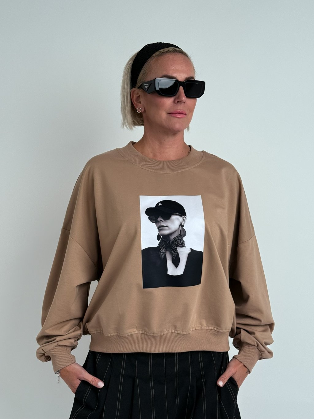 Mikina úzkeho strihu so zadným vetraním, potlačou na prednej strane a dlhými rukávmi.