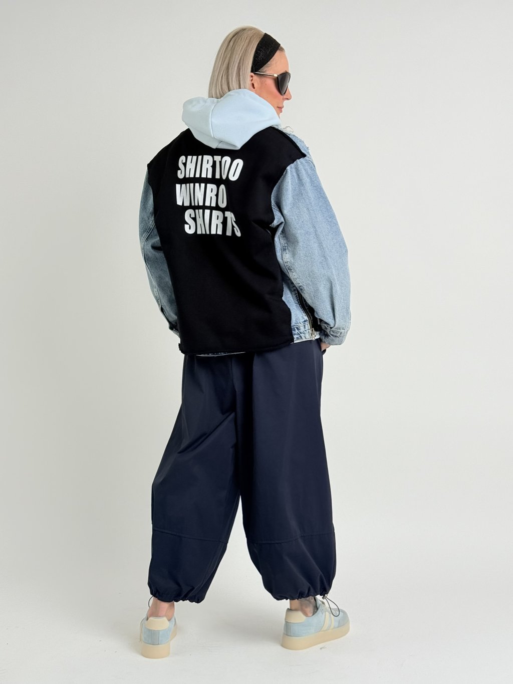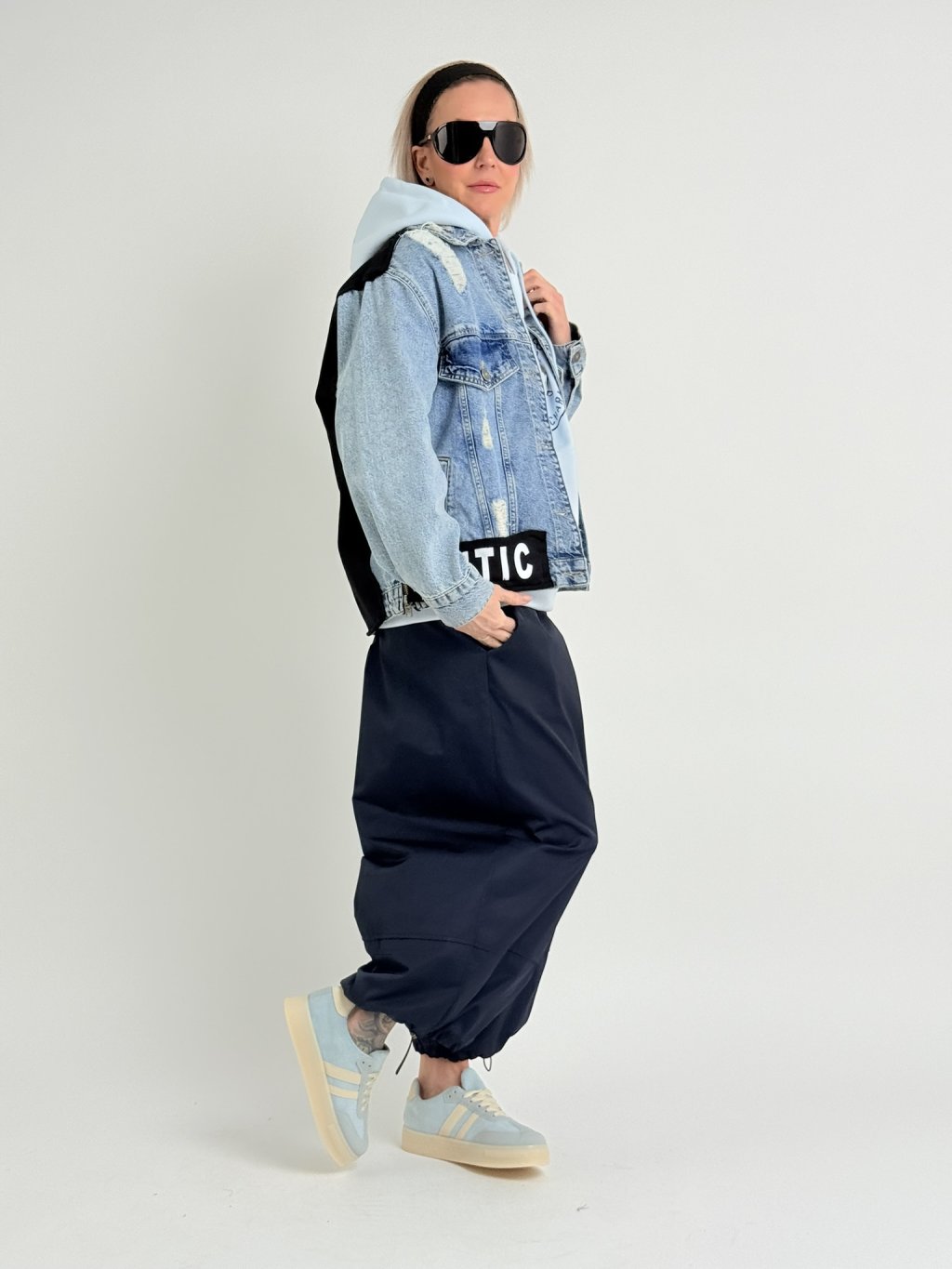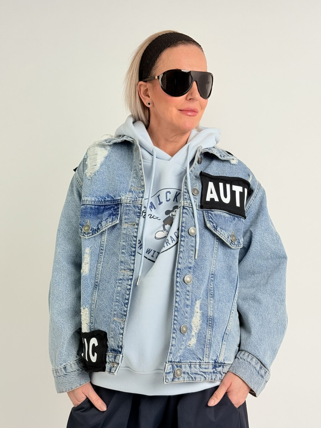 Luxusná džínsová bunda, mierne potrhaná, s bočnými zipsami, malou nášivkou na prednej strane a čiernym chrbtom.
