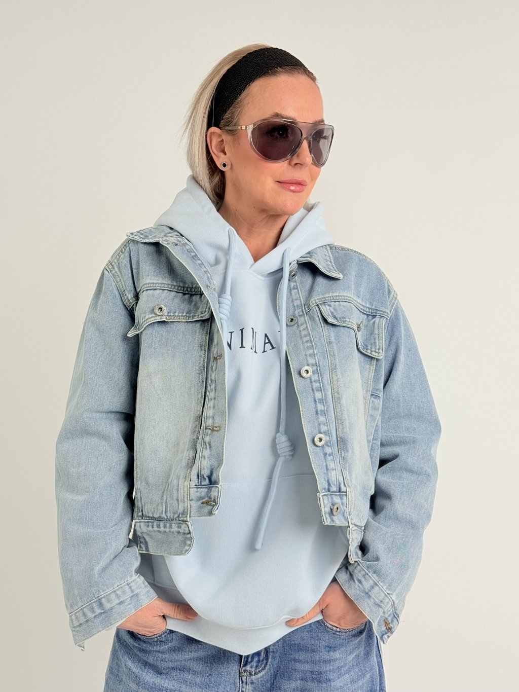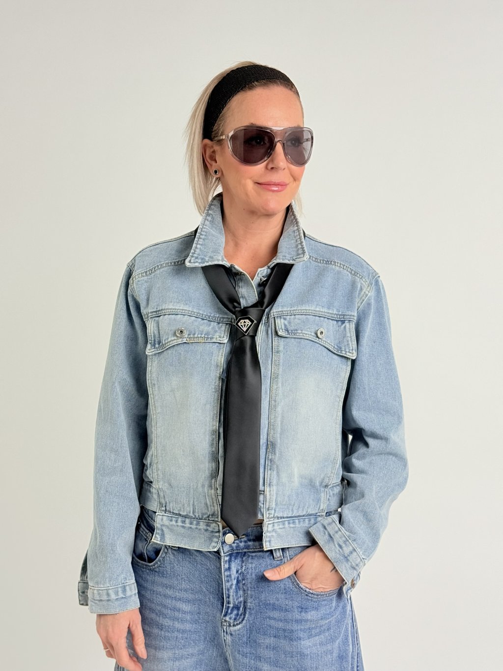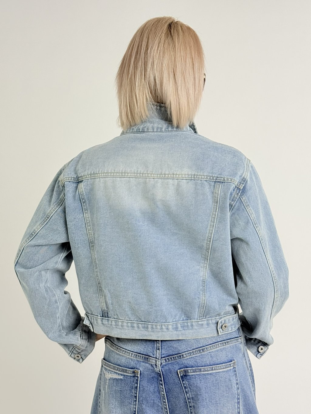 Klasická džínsová nepružná bunda s mierne predĺženou prednou časťou, náprsnými vreckami, golierom, kovovými gombíkmi na zapínanie a bočnými vreckami.
