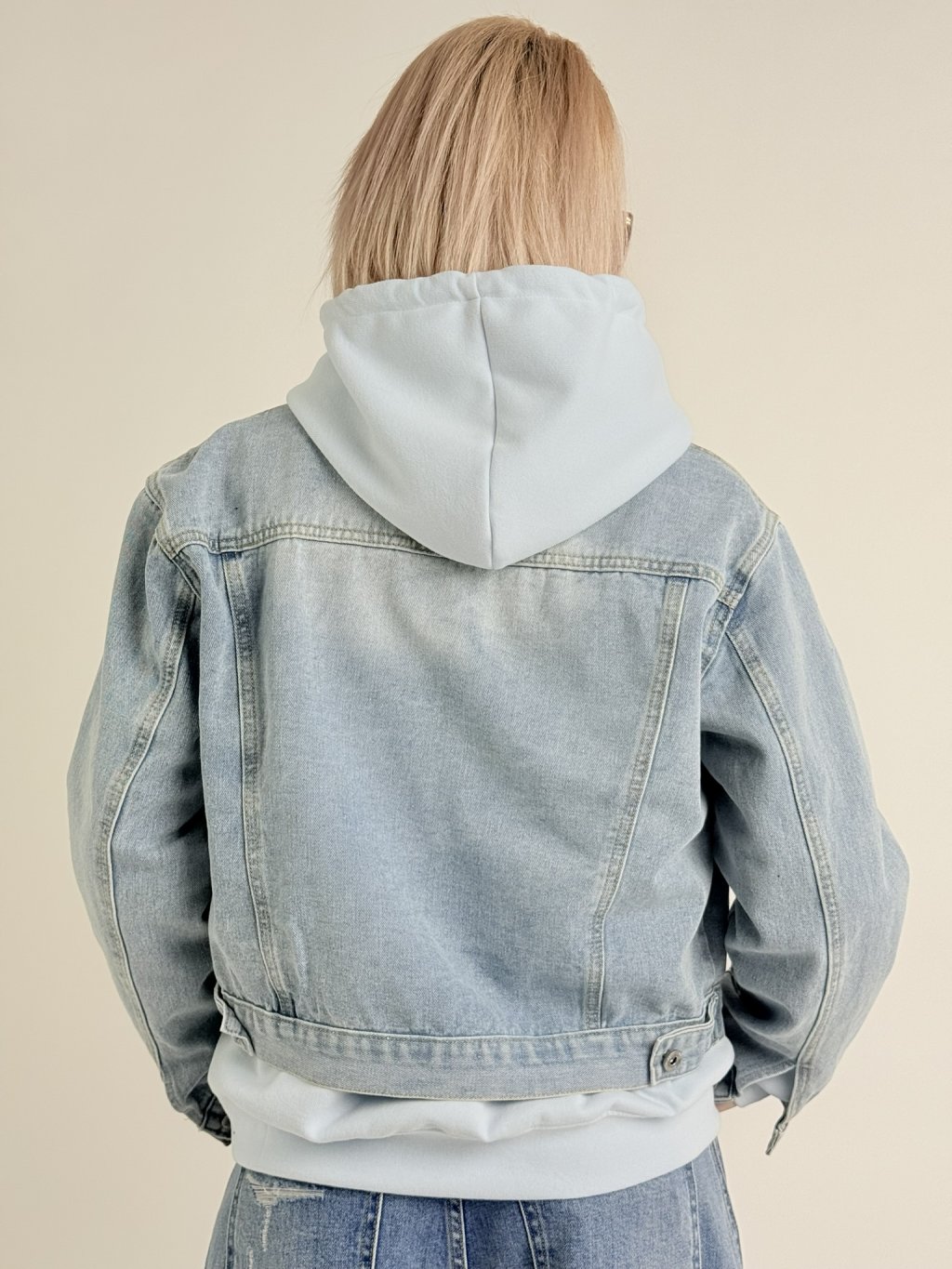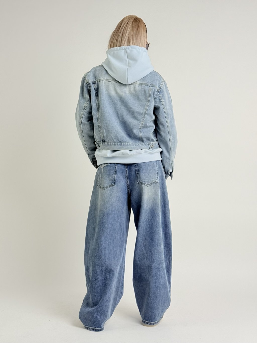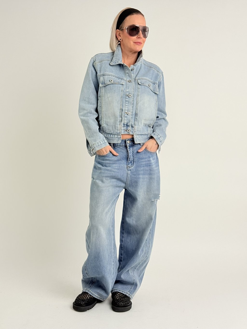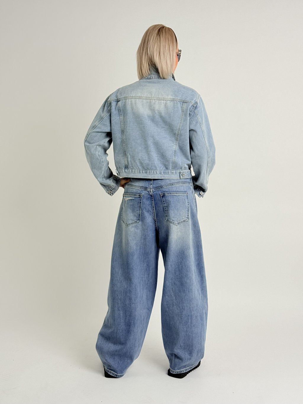 Klasická džínsová nepružná bunda s mierne predĺženou prednou časťou, náprsnými vreckami, golierom, kovovými gombíkmi na zapínanie a bočnými vreckami.