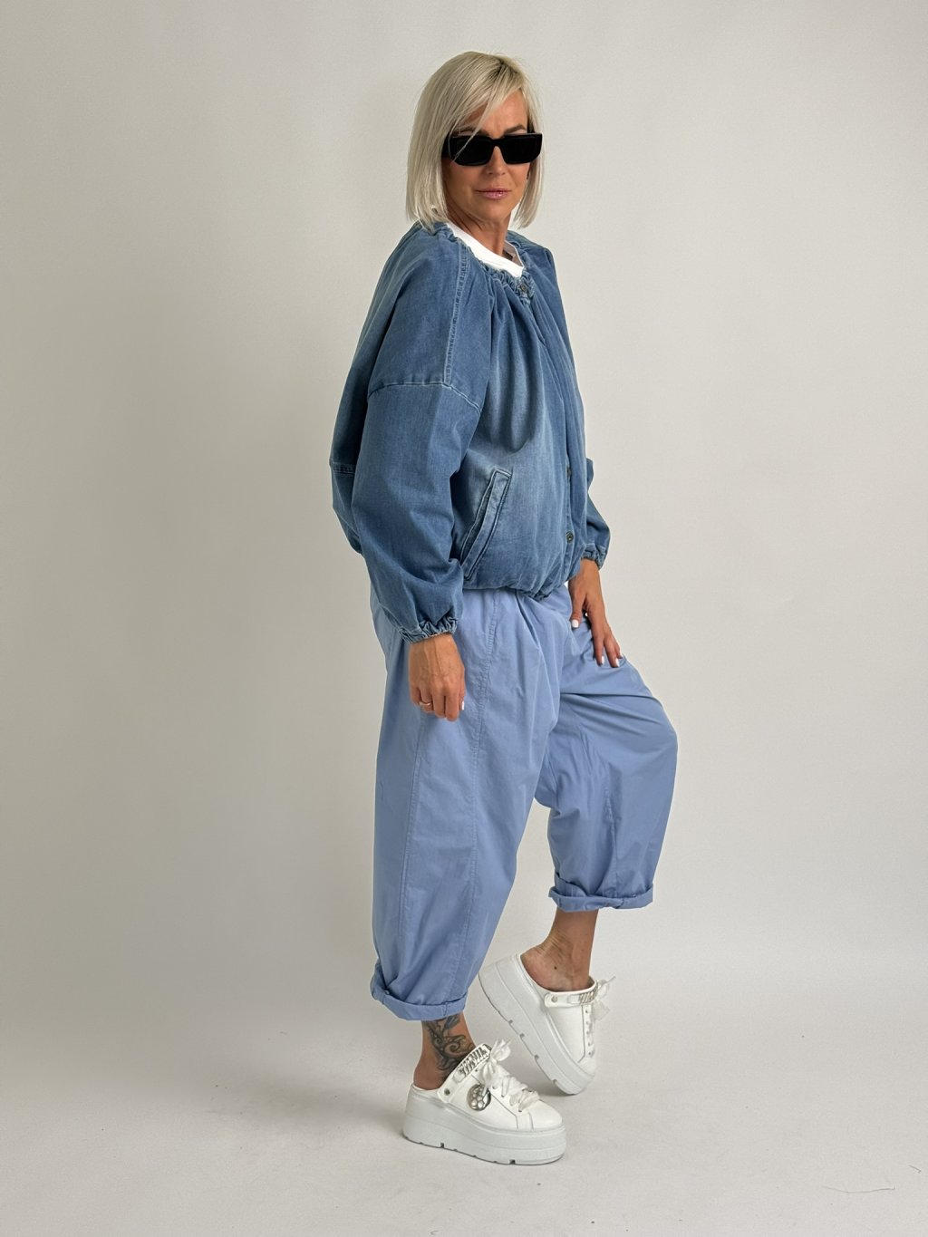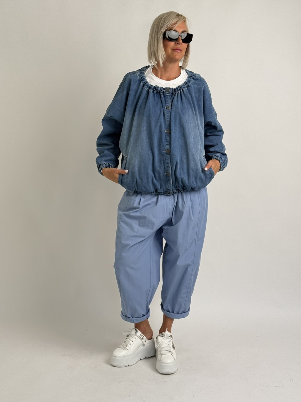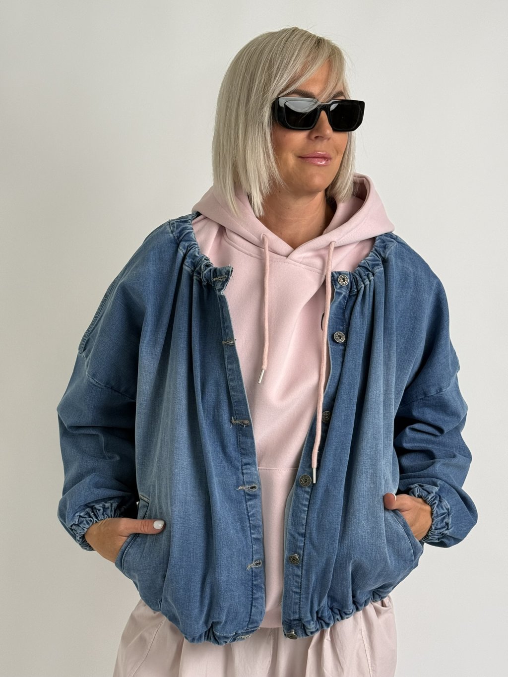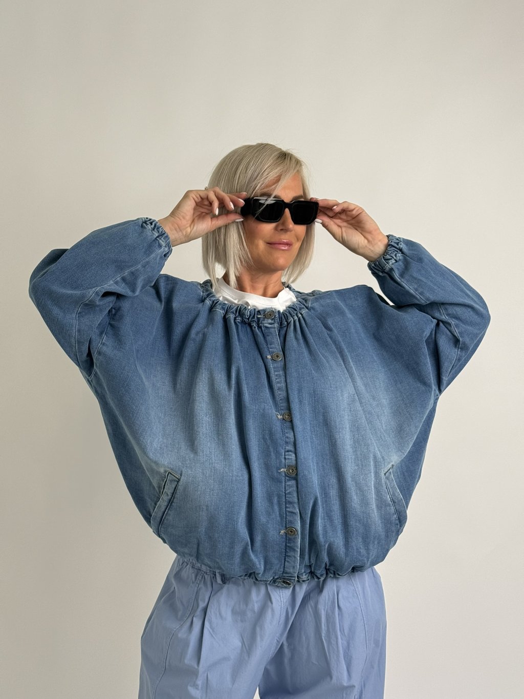 Super , oversize, džínsová bunda s lodičkovým výstrihom na gumu a spodným okrajom a rukávmi tiež na gumu. Zapínanie na gombíky.