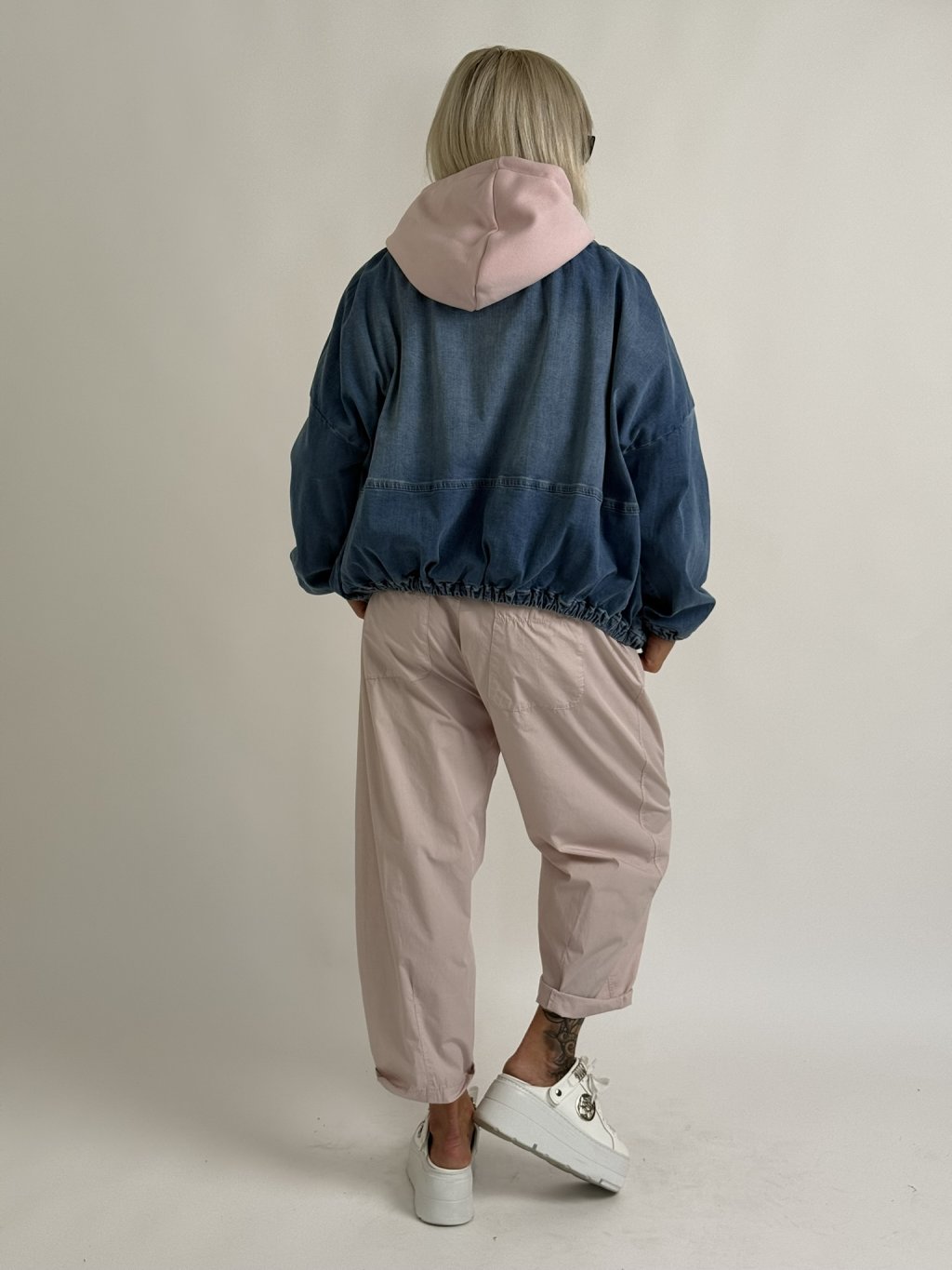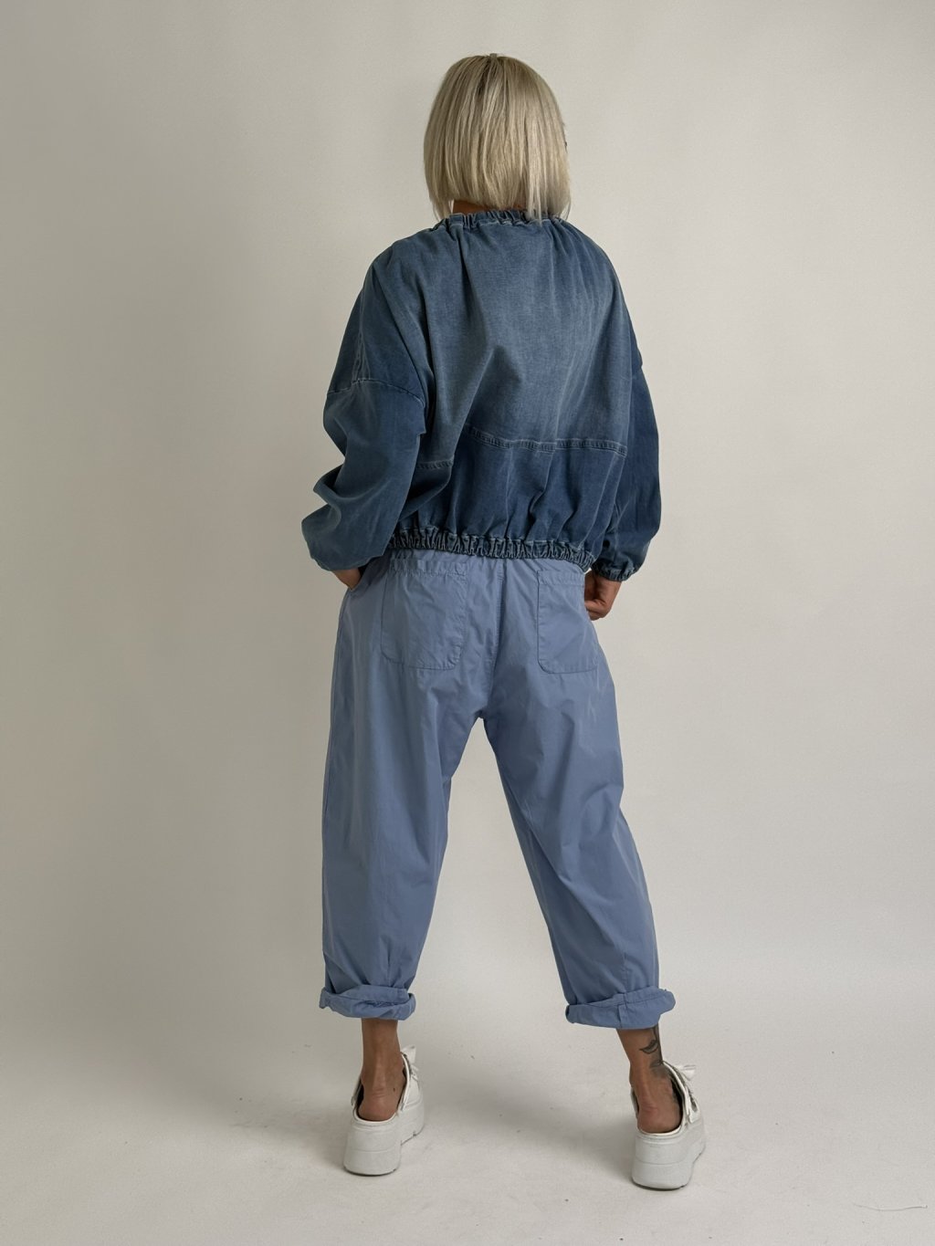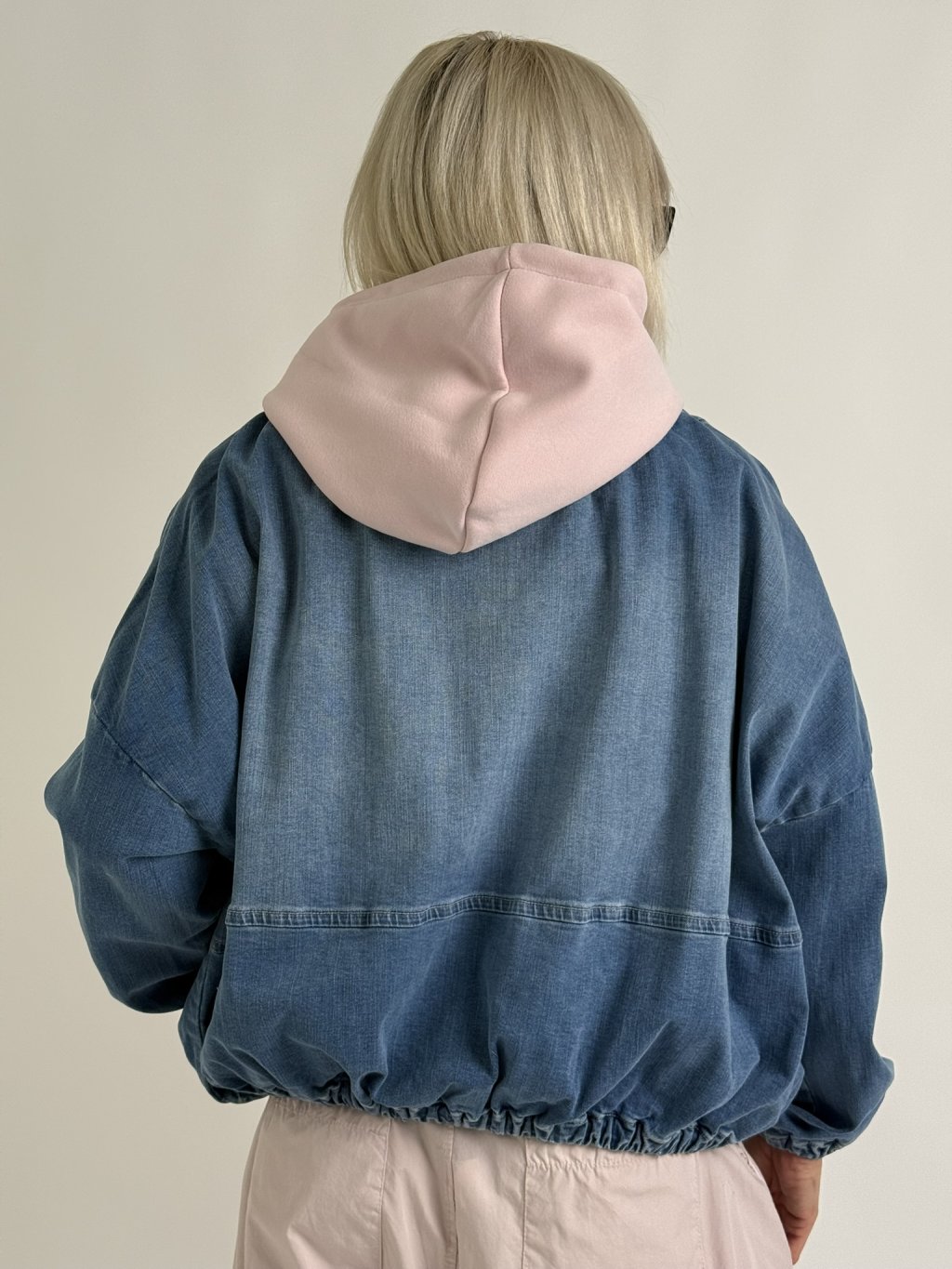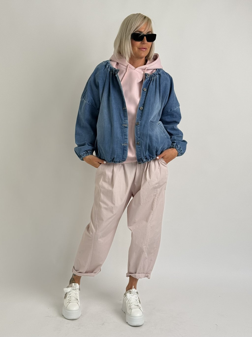 Super , oversize, džínsová bunda s lodičkovým výstrihom na gumu a spodným okrajom a rukávmi tiež na gumu. Zapínanie na gombíky.