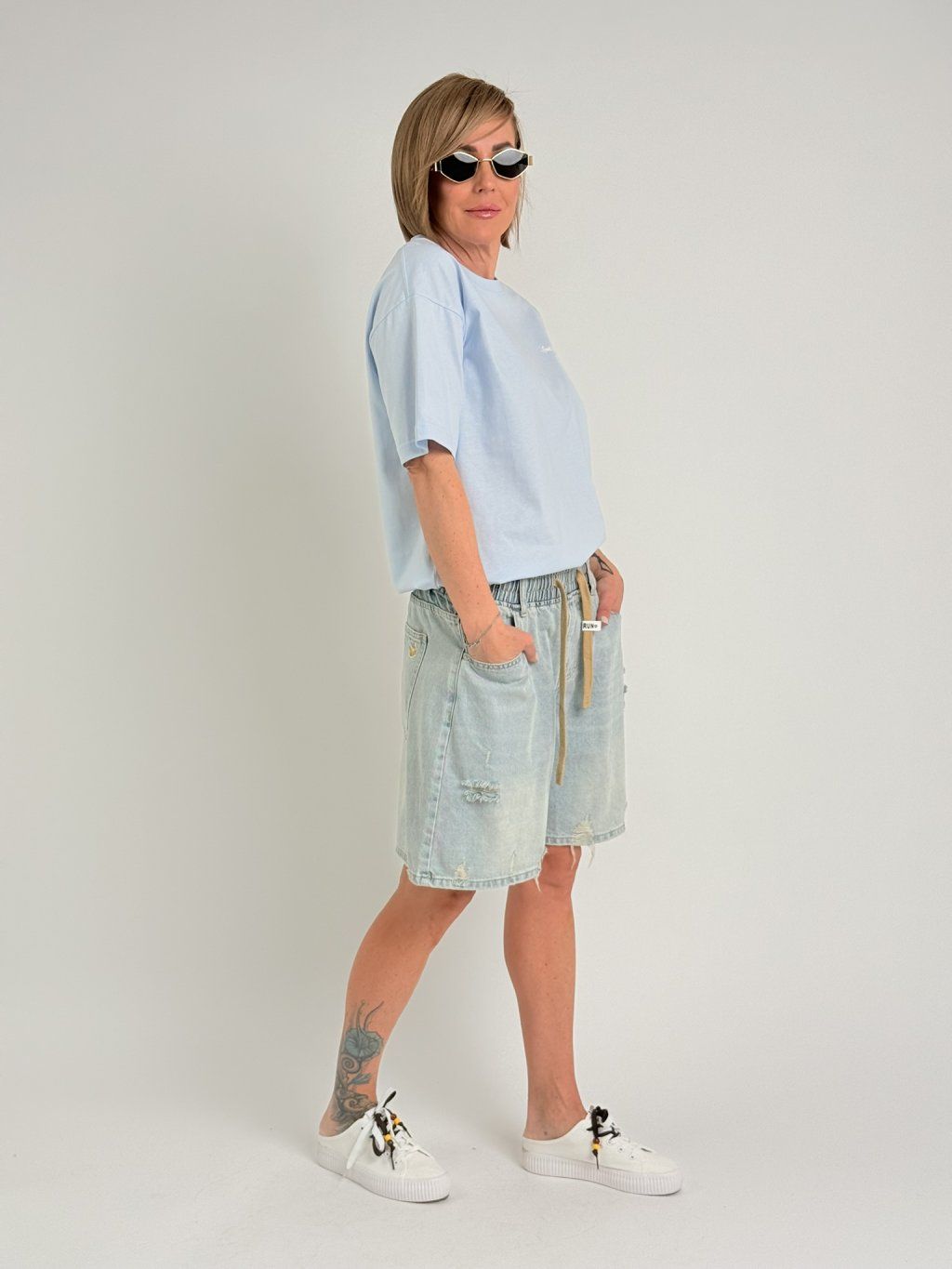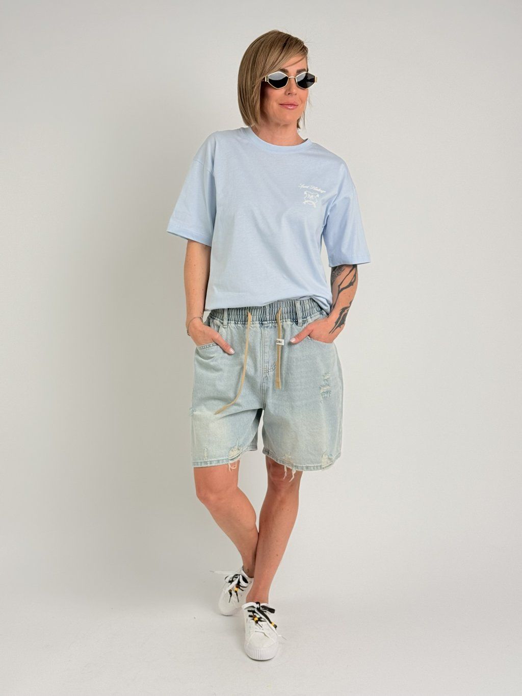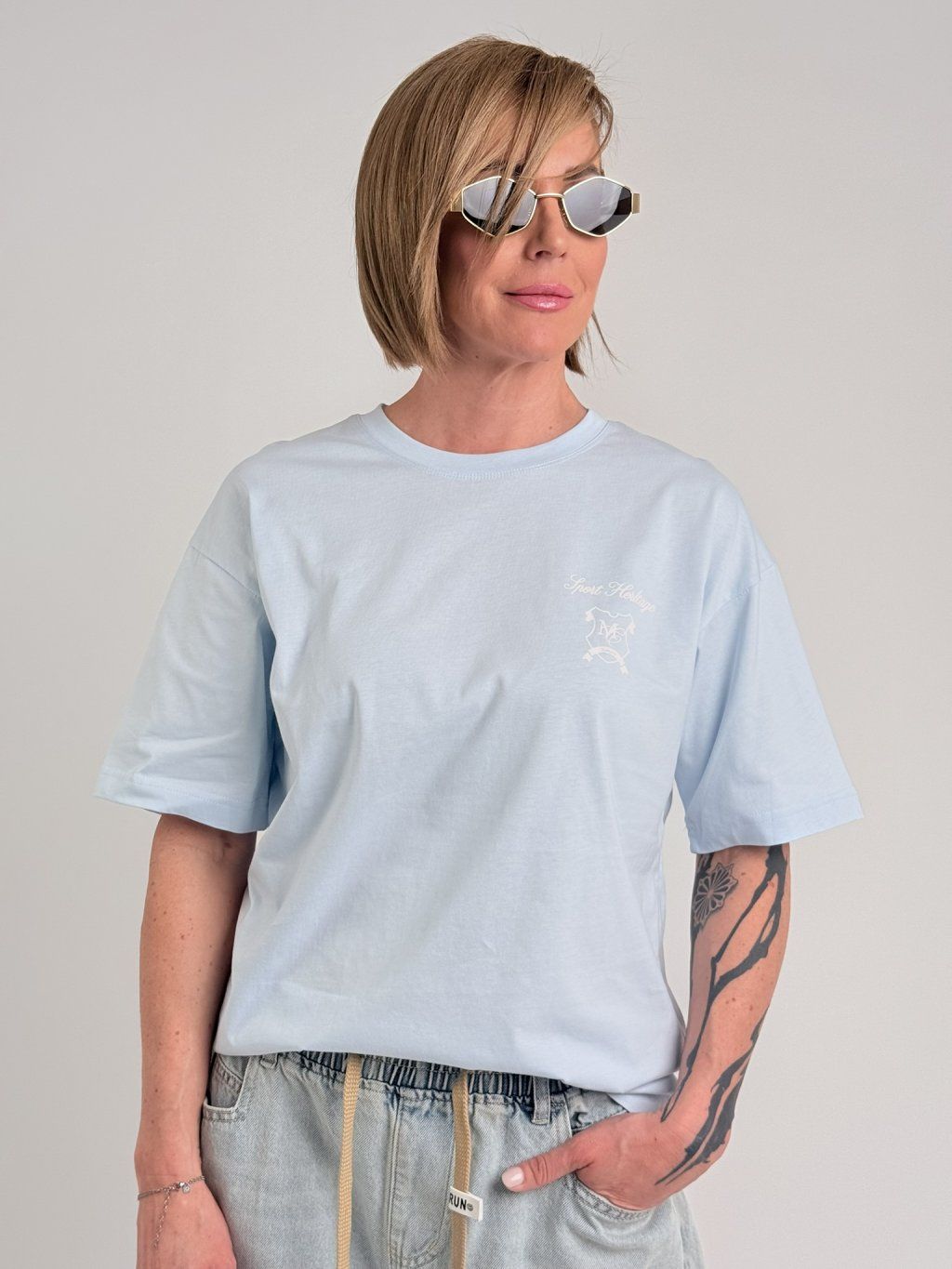 Krásne voľnejšie tričko s okrúhlym výstrihom, krátkymi rukávmi a bielou potlačou na prednej a zadnej strane.