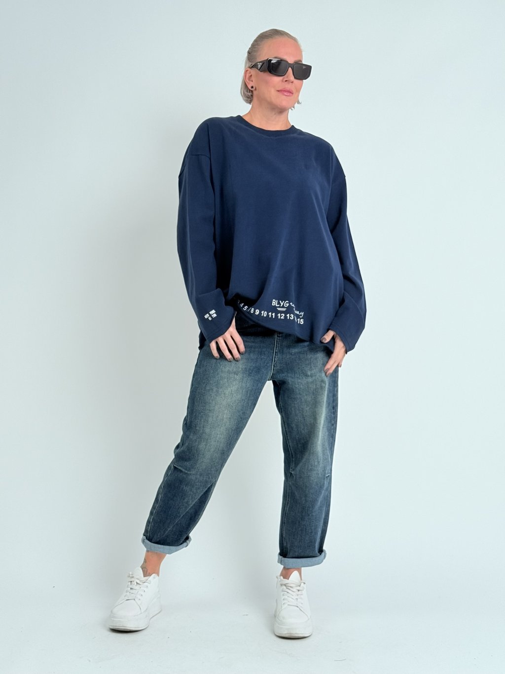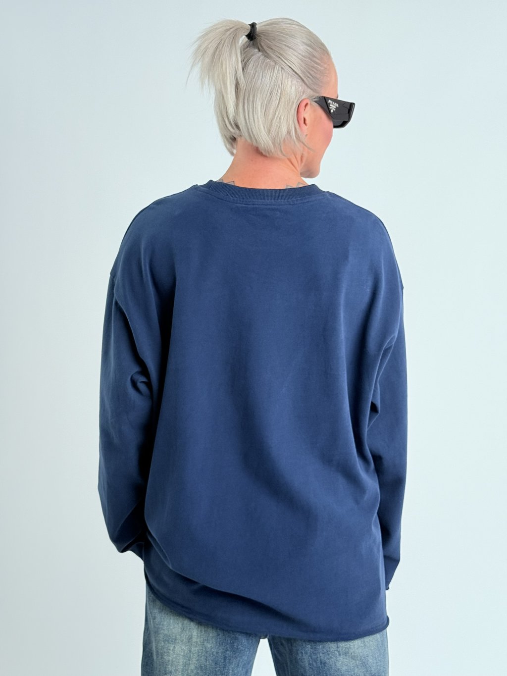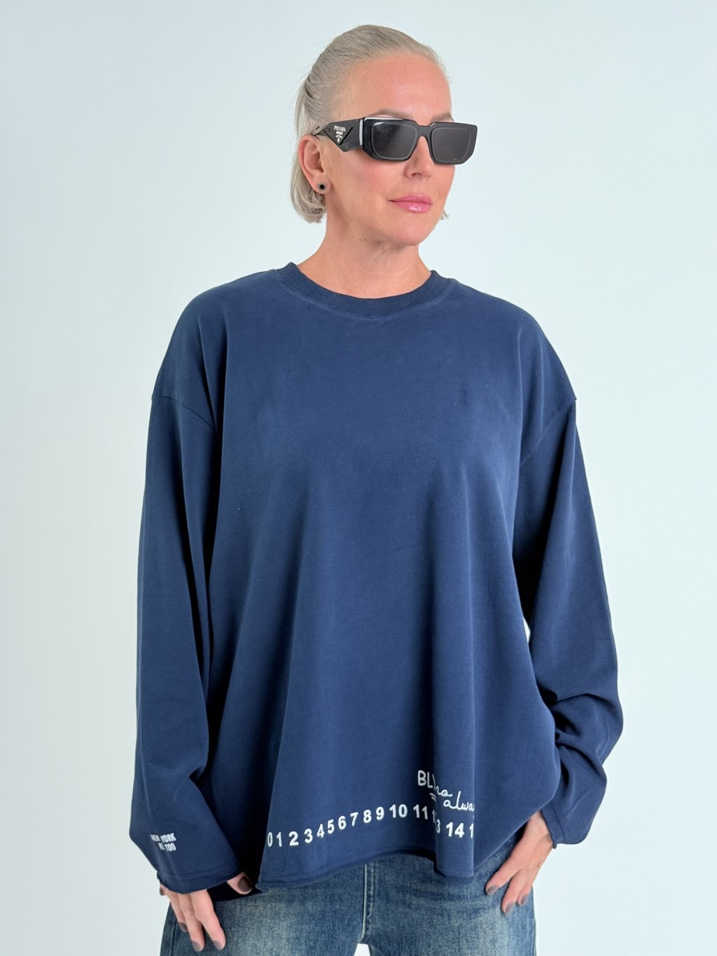 Parádna, nadrozmerná, priliehavá mikina s okrúhlym výstrihom, dlhými rukávmi a potlačou na prednej strane.