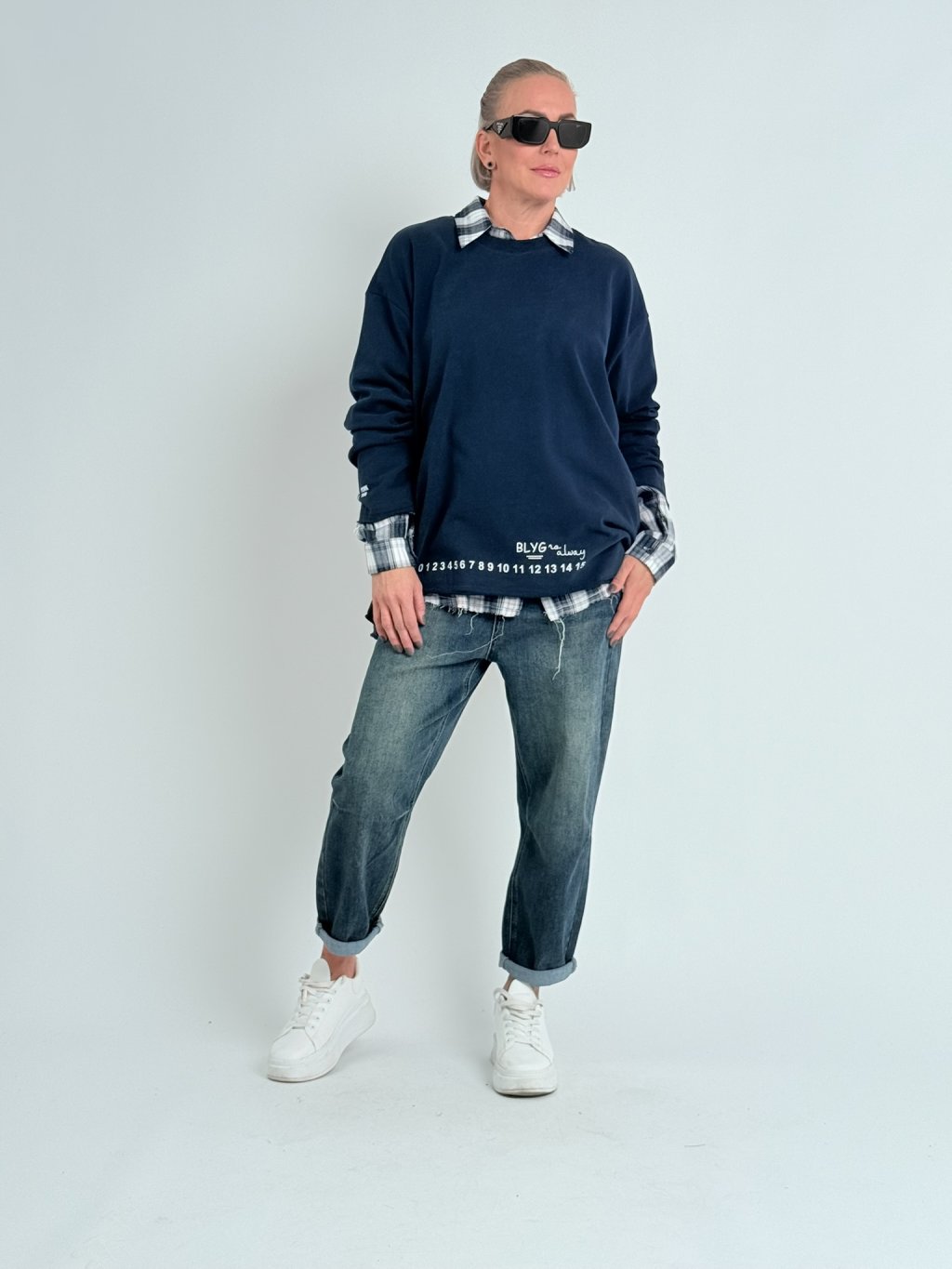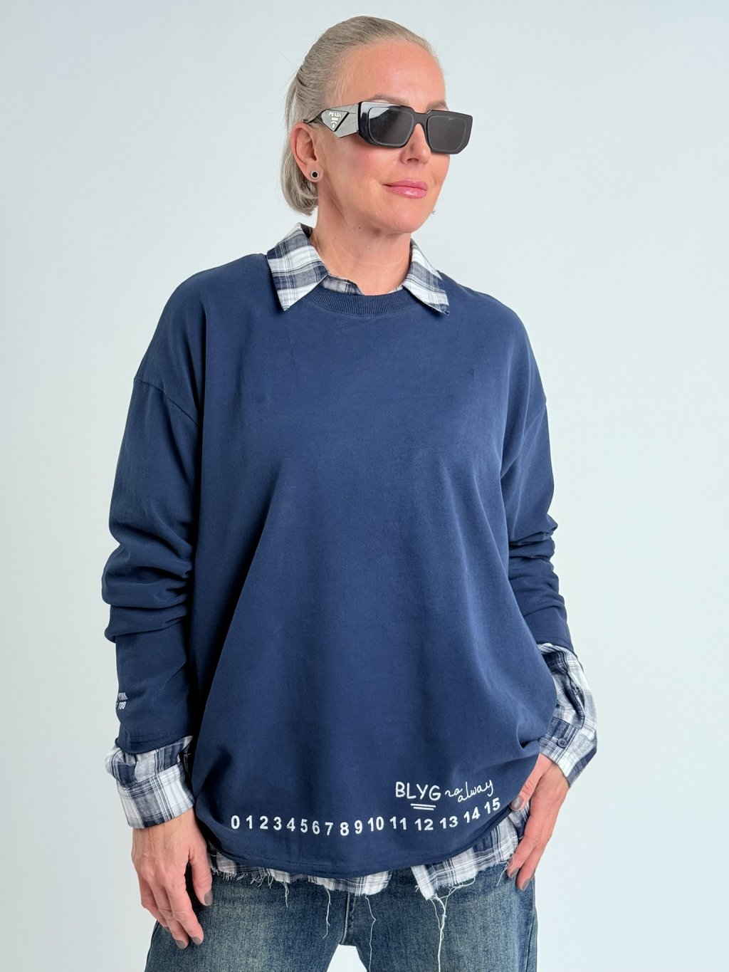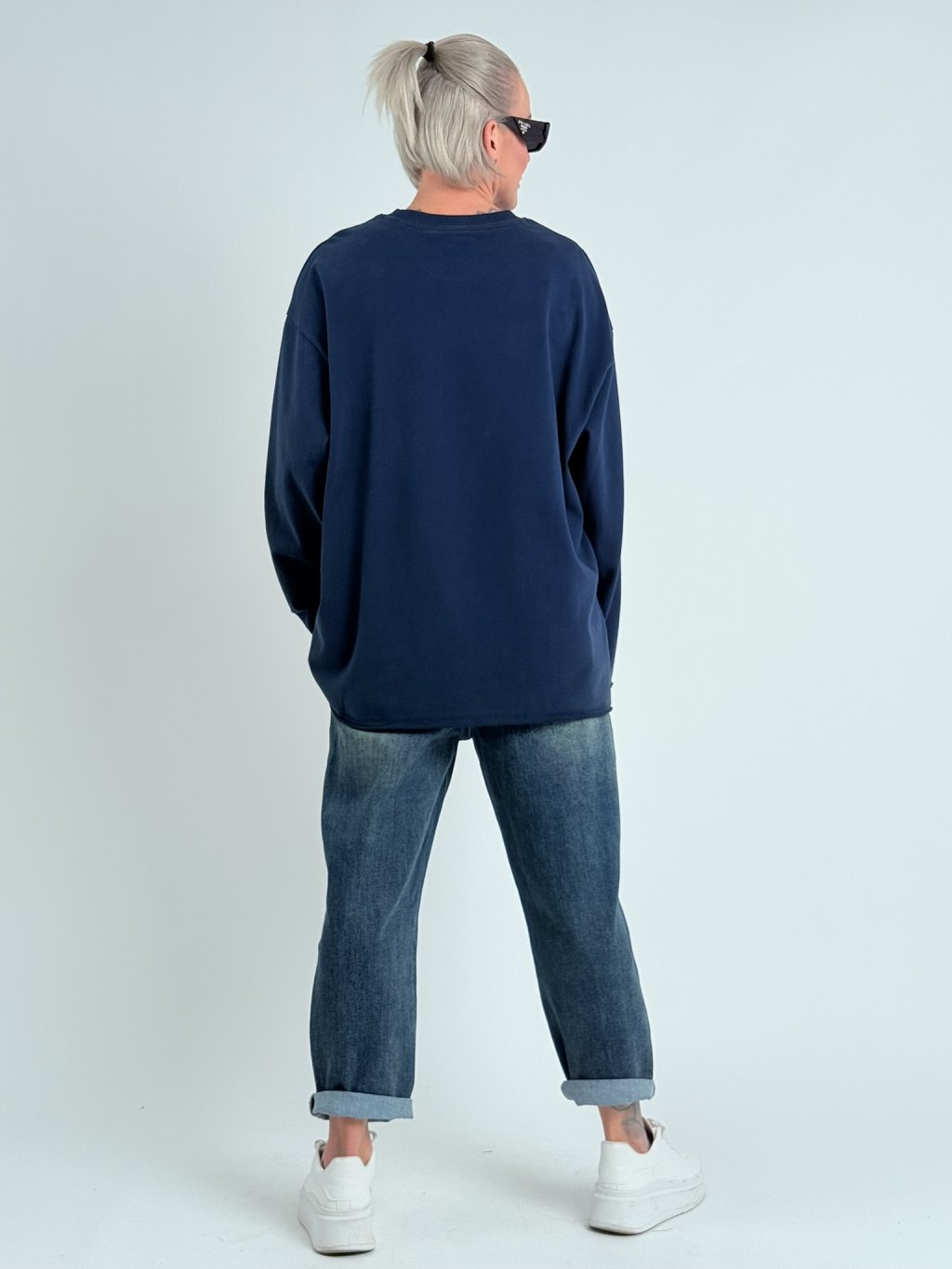 Parádna, nadrozmerná, priliehavá mikina s okrúhlym výstrihom, dlhými rukávmi a potlačou na prednej strane.
