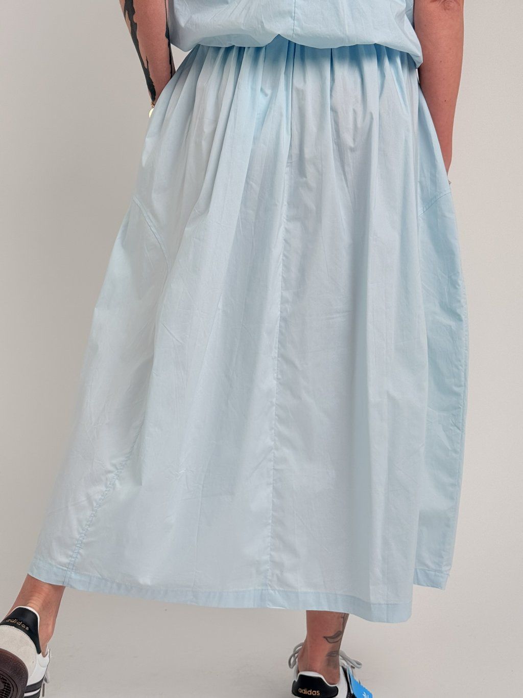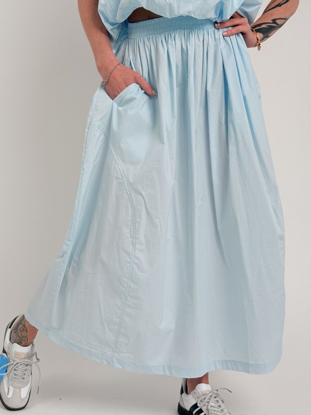 Krásna sukňa s elastickým pásom a bočnými vreckami.