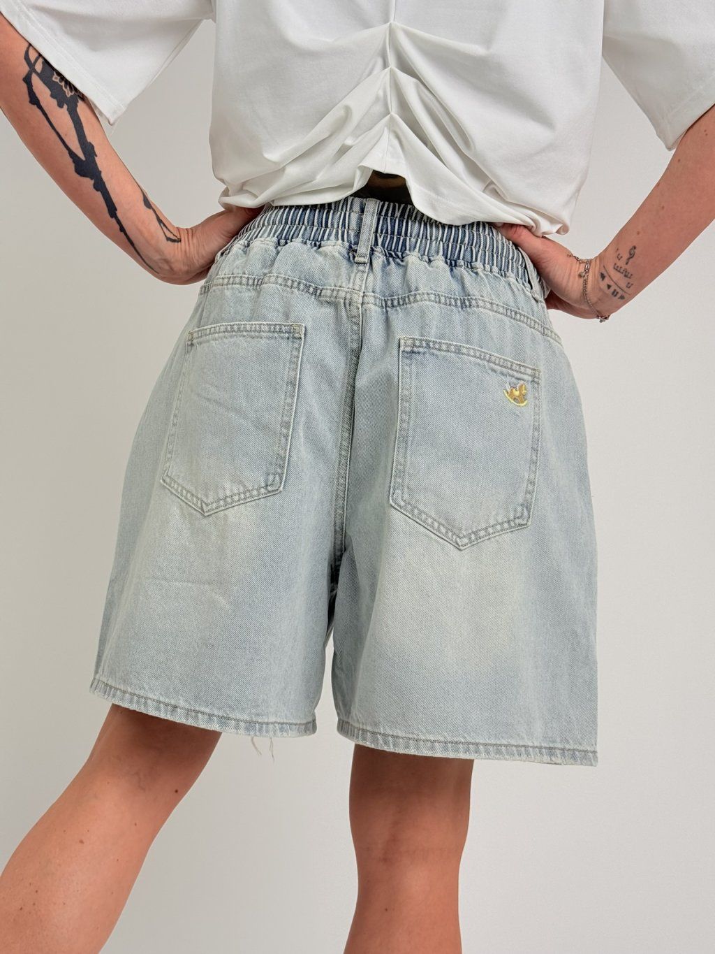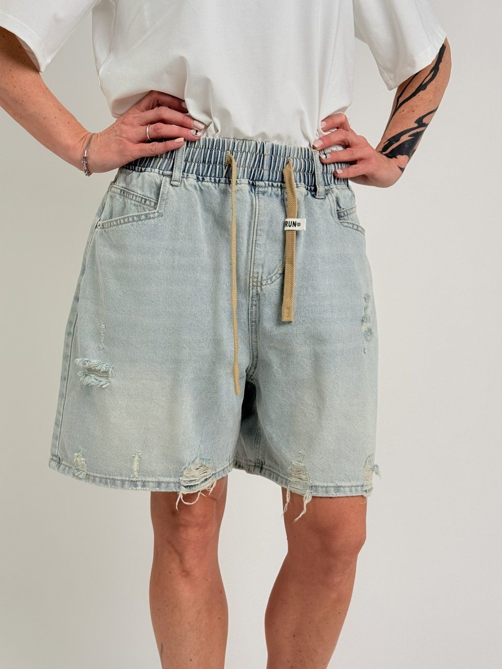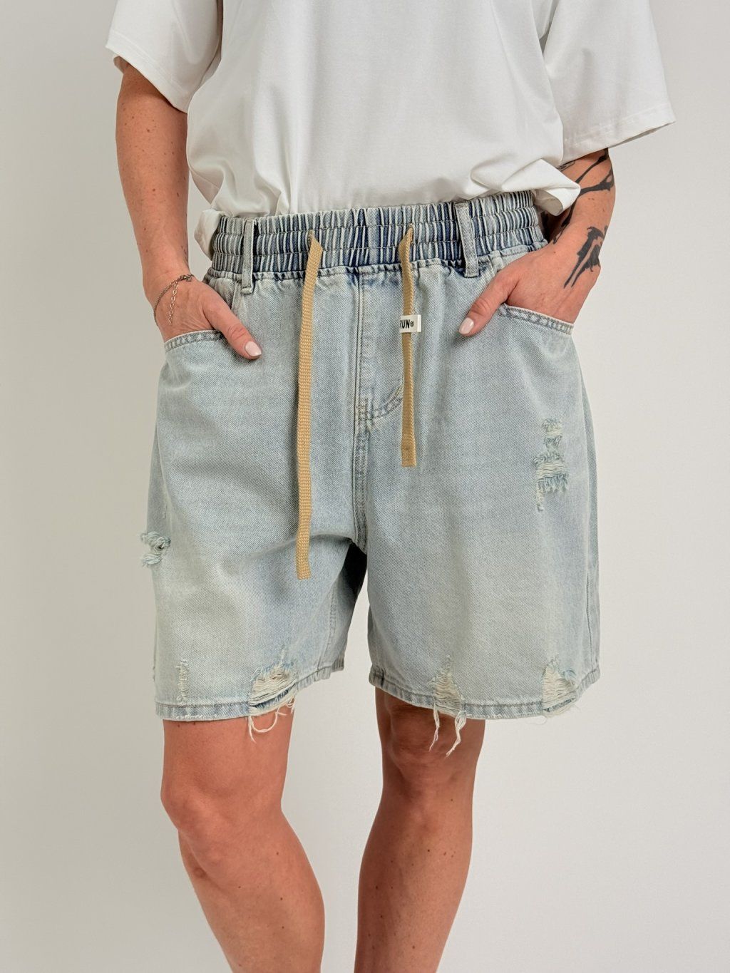 Super džínsové šortky svetlejšej farby, s miernym potrhaním na nohaviciach, elastickým pásom, pútkami a šnúrkou na stiahnutie, s vreckami vpredu a vzadu. MIERKA!!!!!!