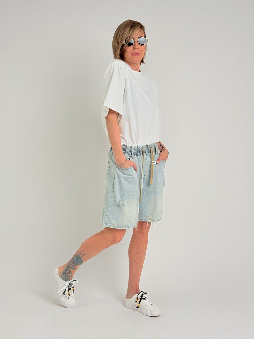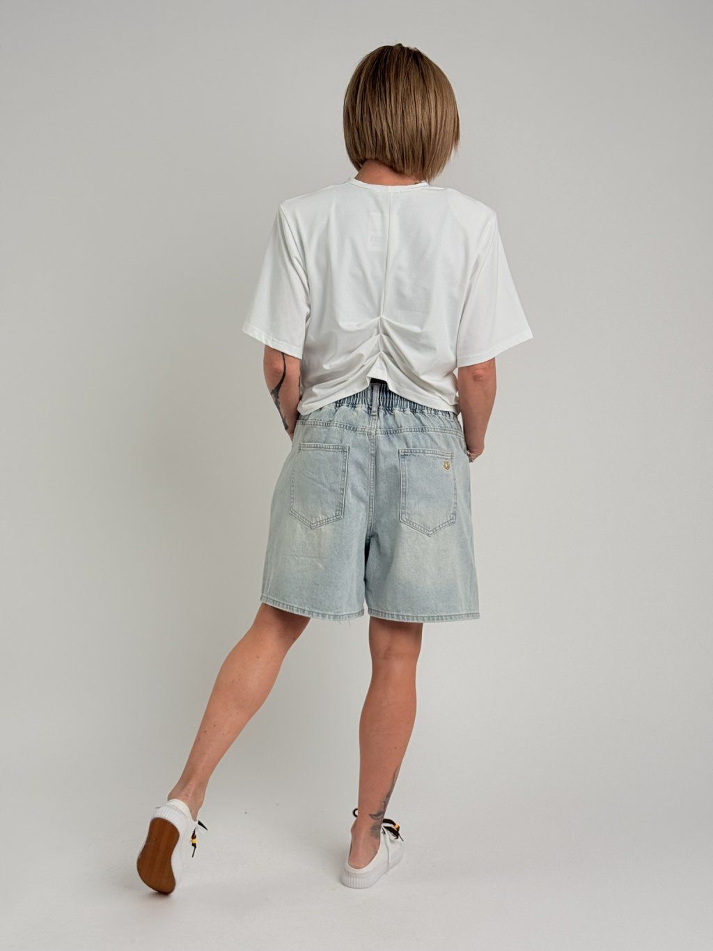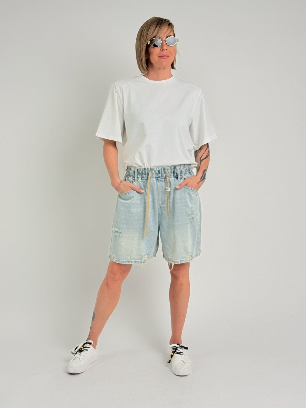 Super džínsové šortky svetlejšej farby, s miernym potrhaním na nohaviciach, elastickým pásom, pútkami a šnúrkou na stiahnutie, s vreckami vpredu a vzadu. MIERKA!!!!!!