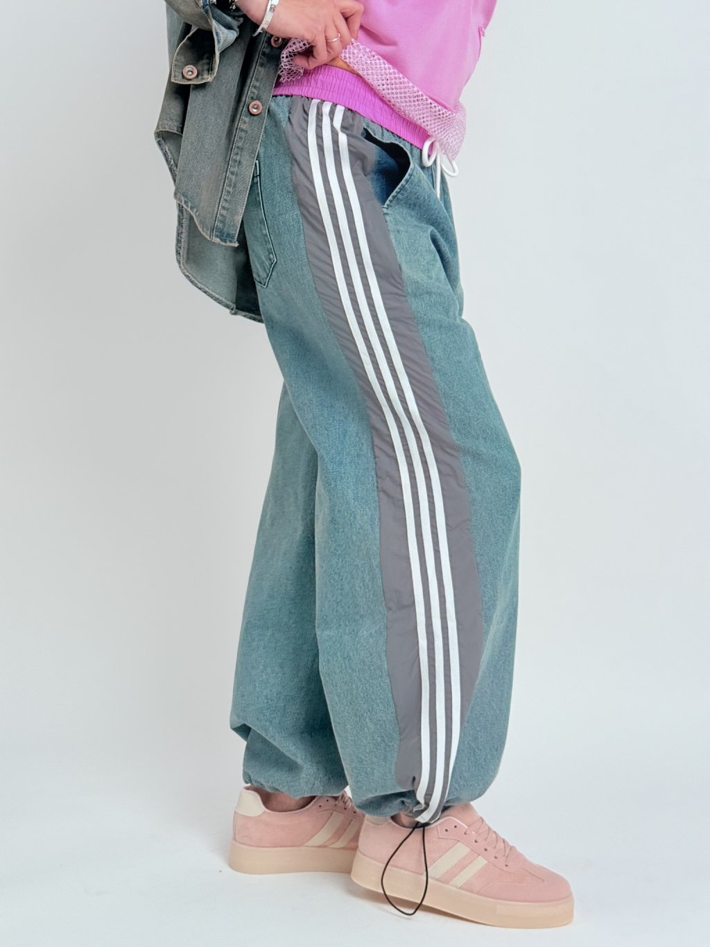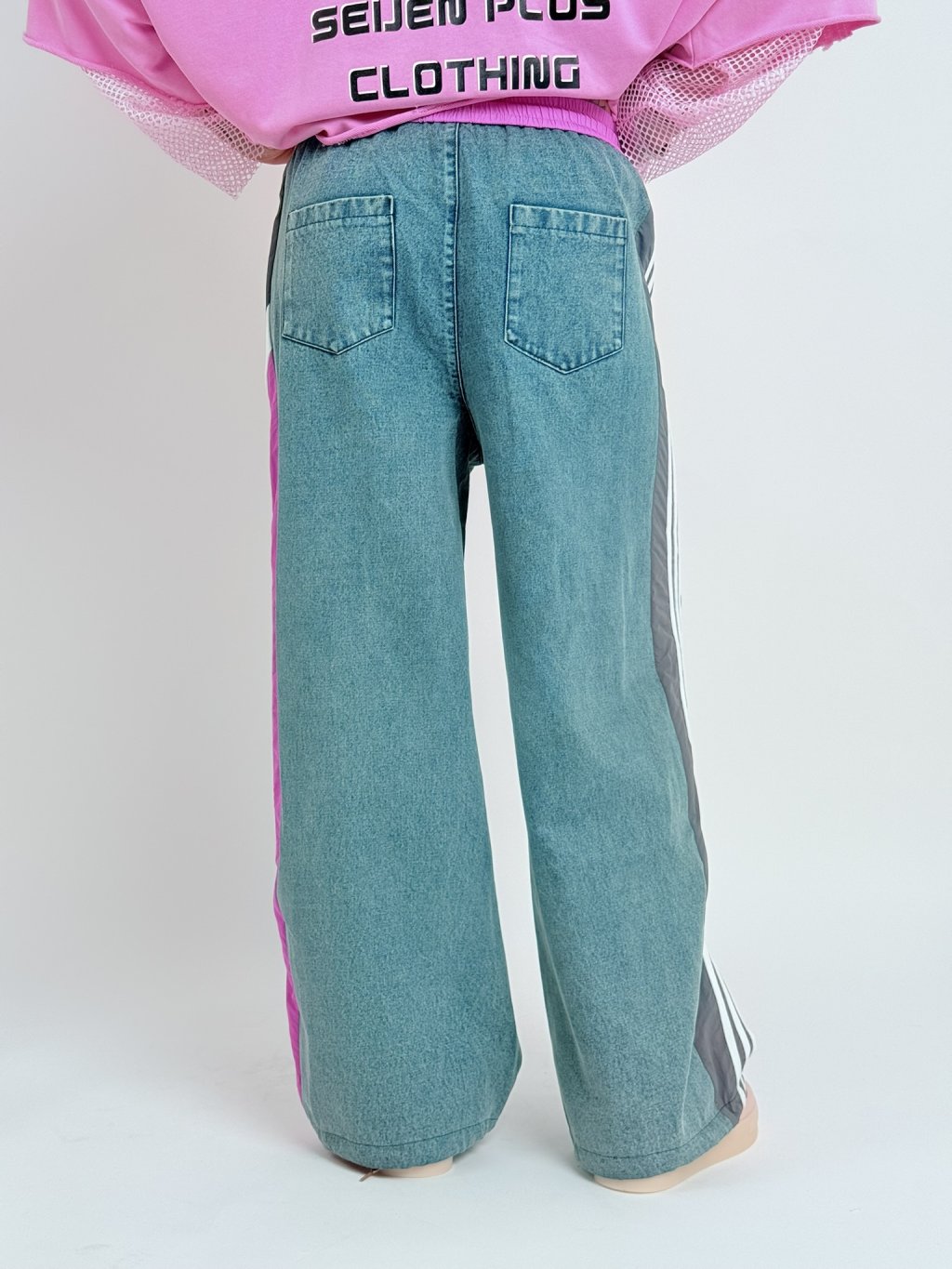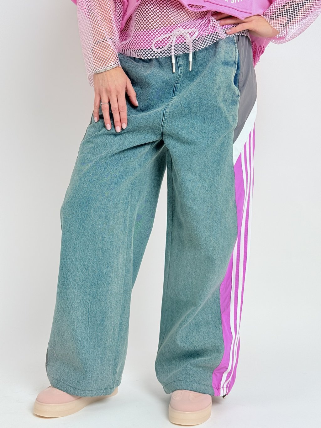 Zaujímavo riešené džínsy s ružovými lamelami a gumou v páse, na konci nohavíc a v páse so šnúrkou na stiahnutie.