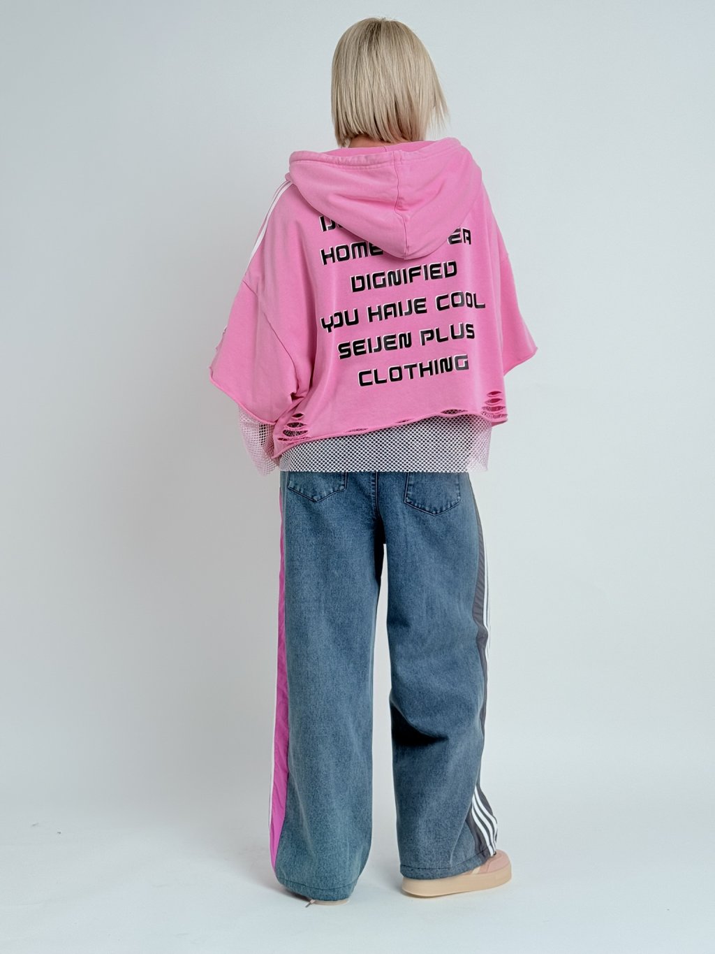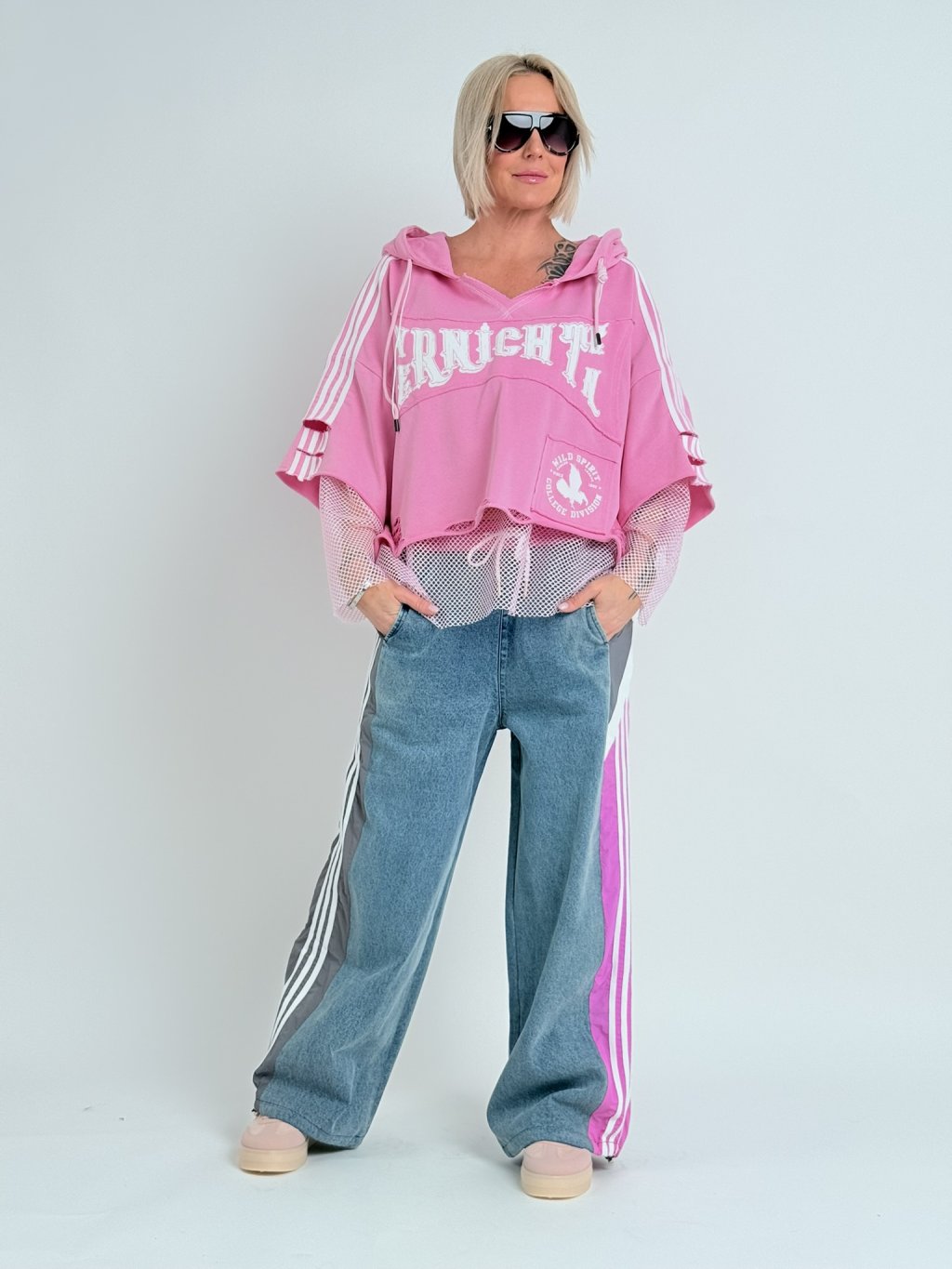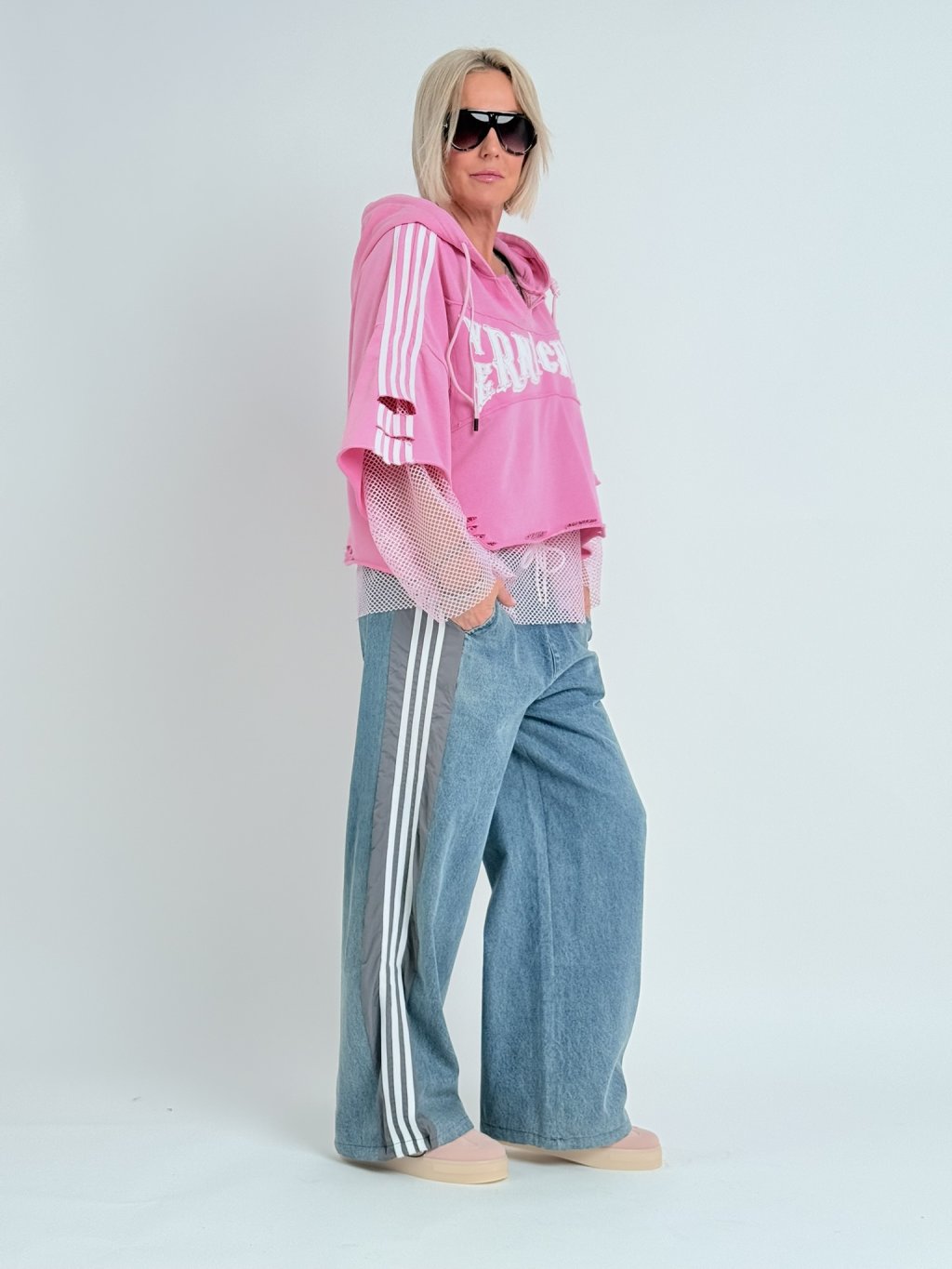 Zaujímavo riešené džínsy s ružovými lamelami a gumou v páse, na konci nohavíc a v páse so šnúrkou na stiahnutie.