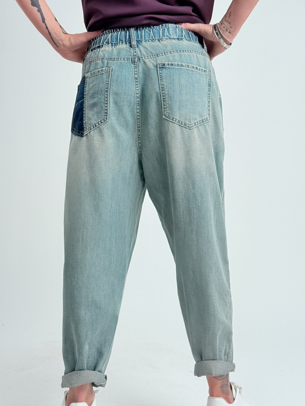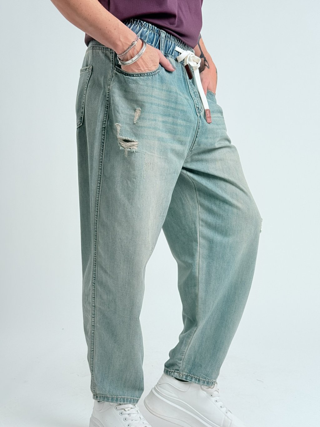 Pohodlné boyfriend džínsy s elastickým pásom a šnúrkou na stiahnutie. Mierne elastické. Super strih.MIERKA!!!!
