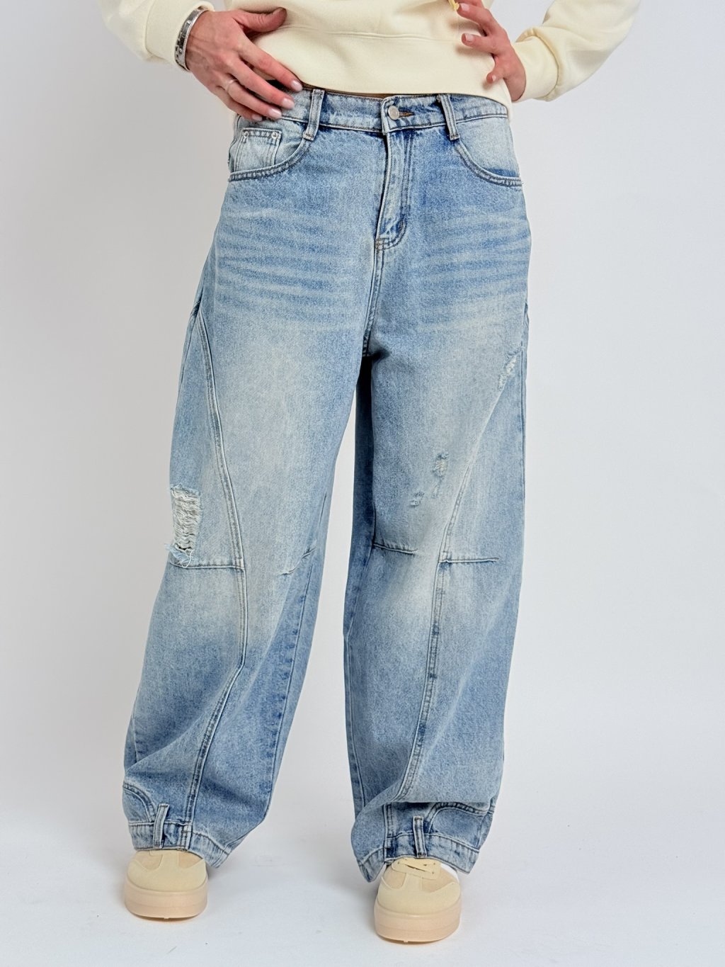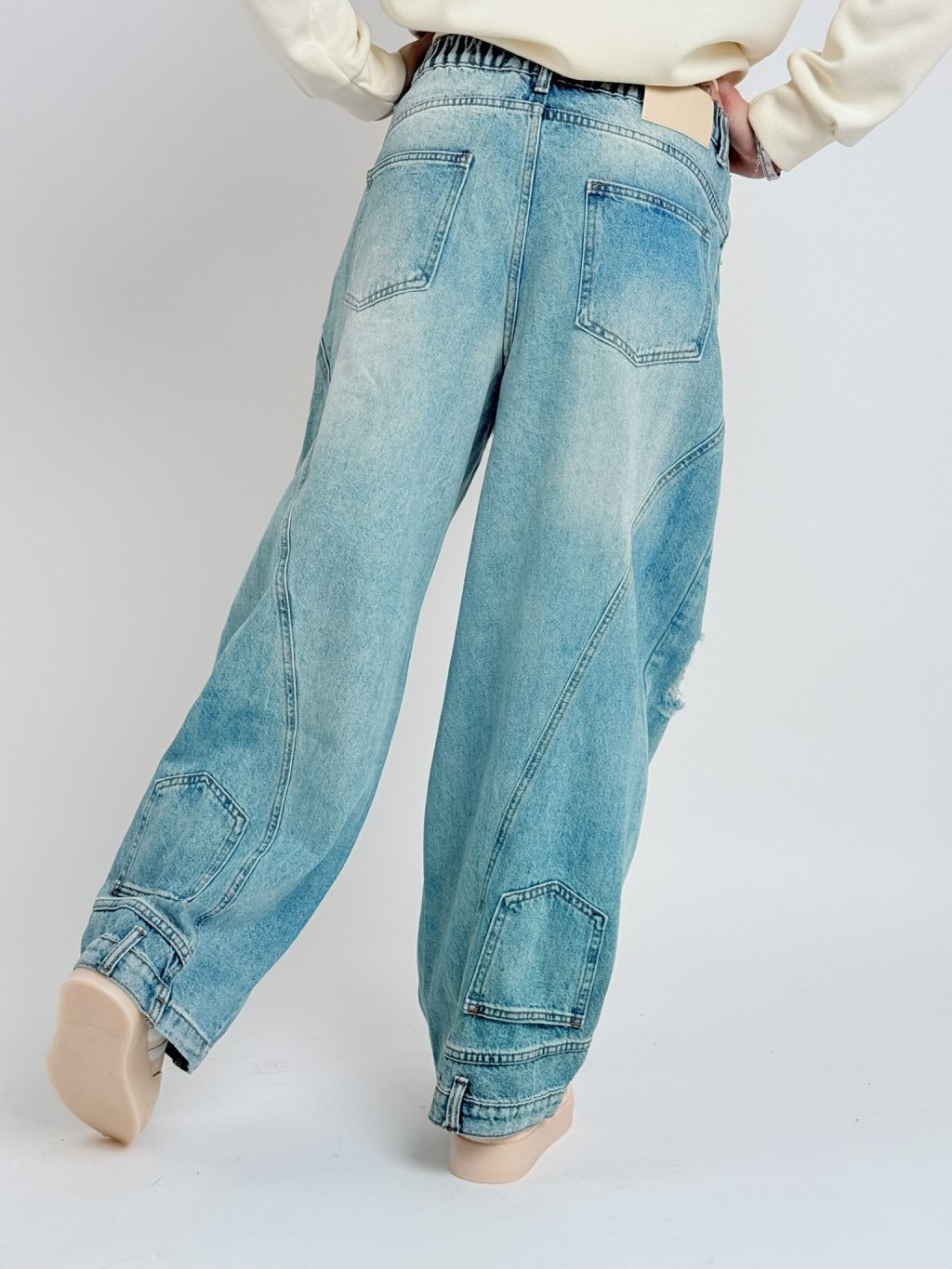Perfektne padnúce širšie džínsy, elastické v zadnej časti pásu.Spodný okraj nohavíc zdobia vrecká a pútka.