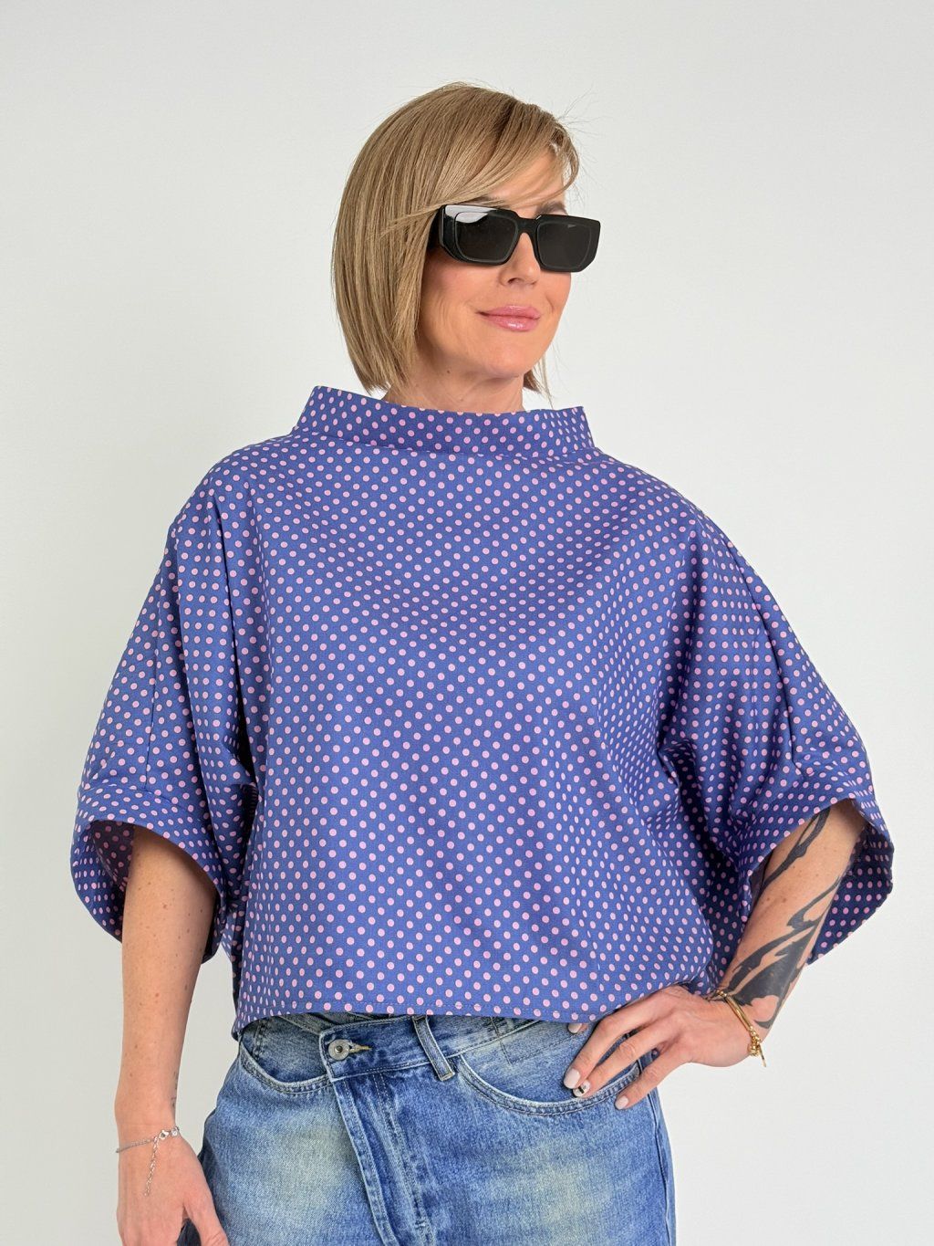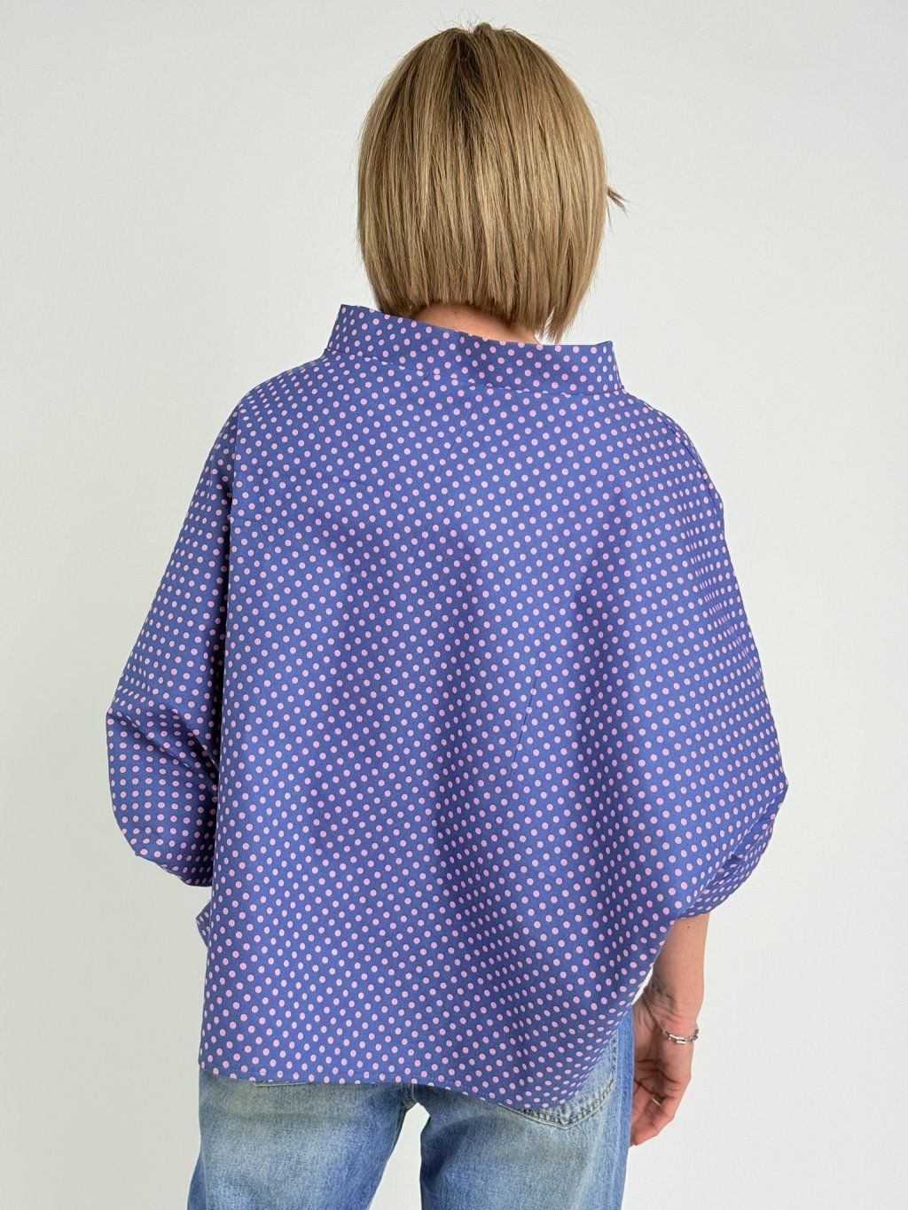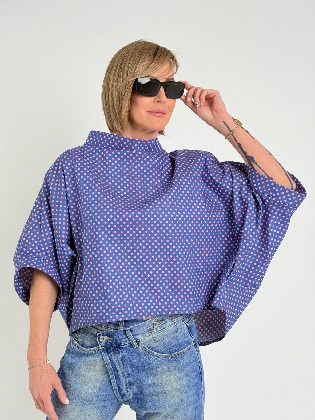 Luxusná bodkovaná tunika netopierieho strihu so širokým stojacím golierom. Vhodná na vrstvenie.