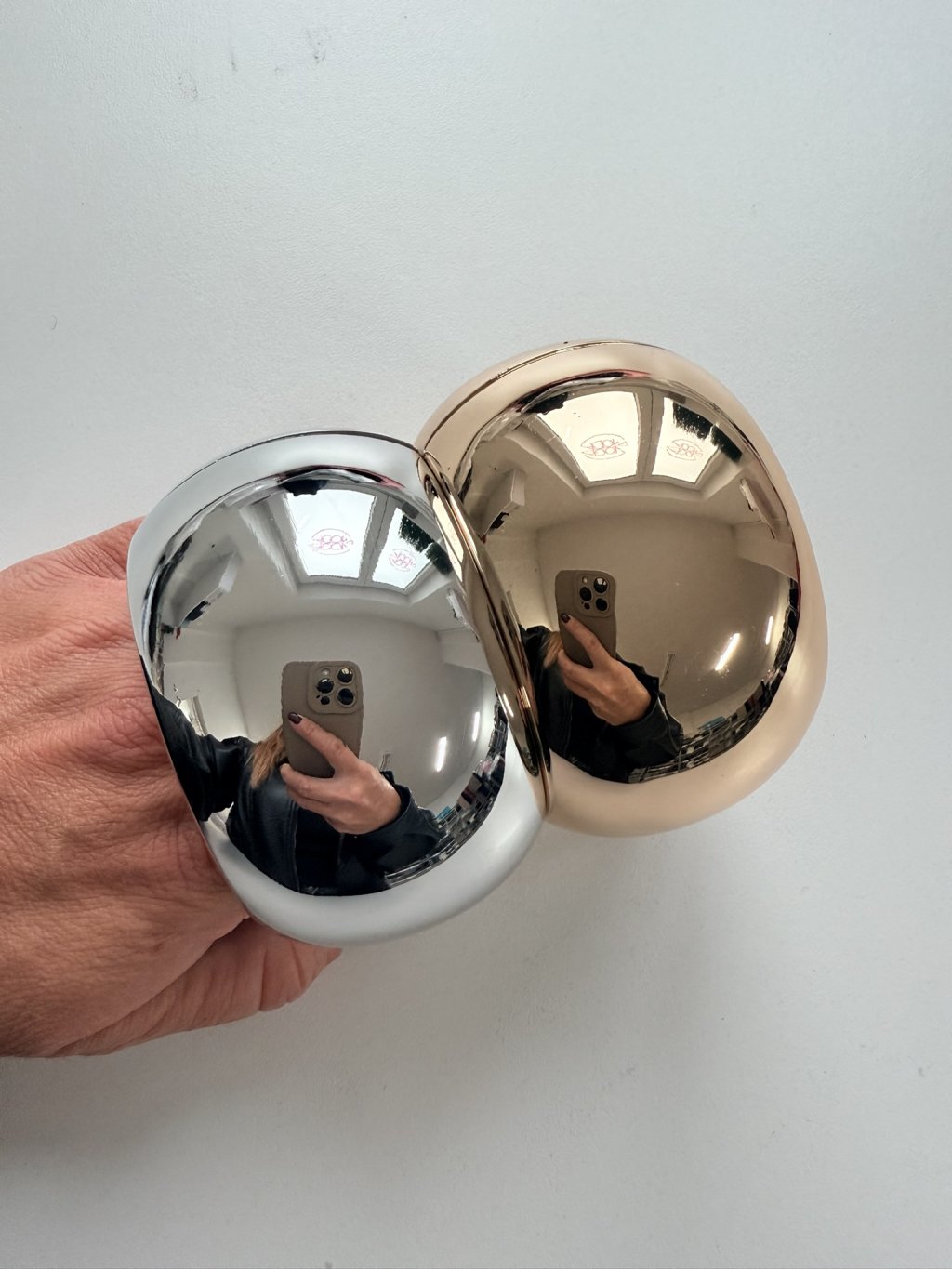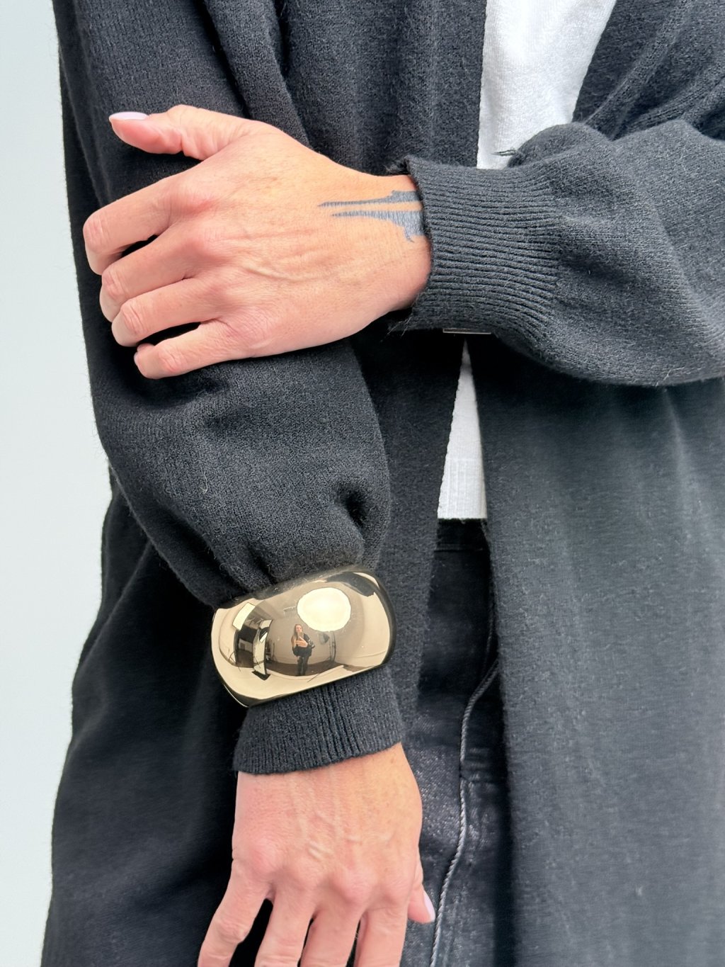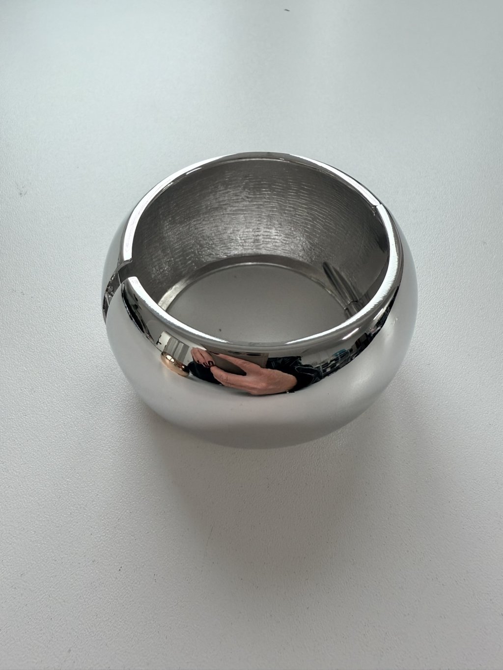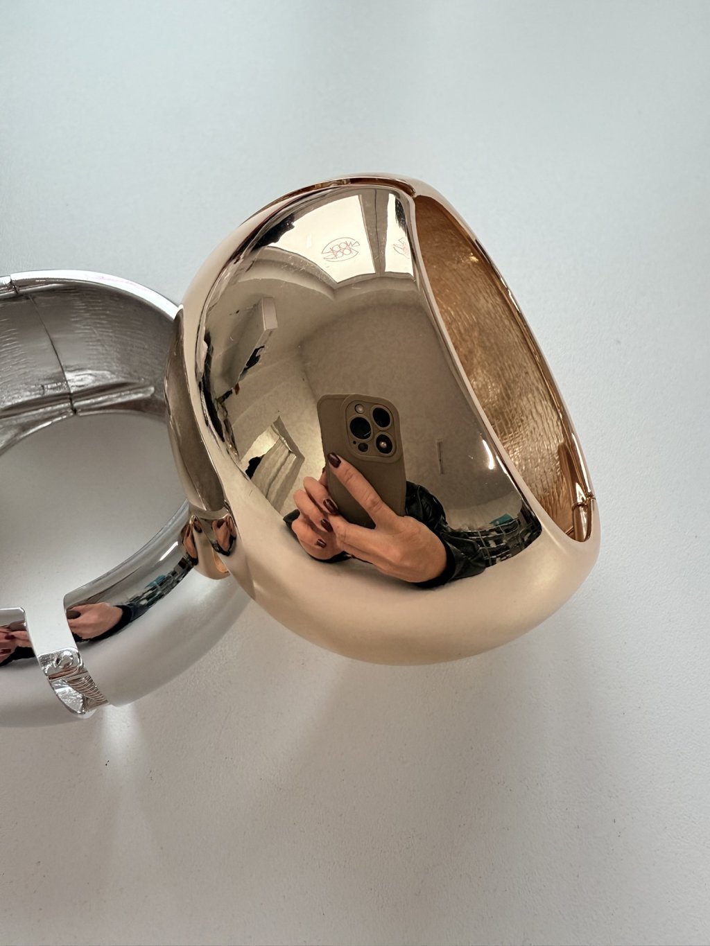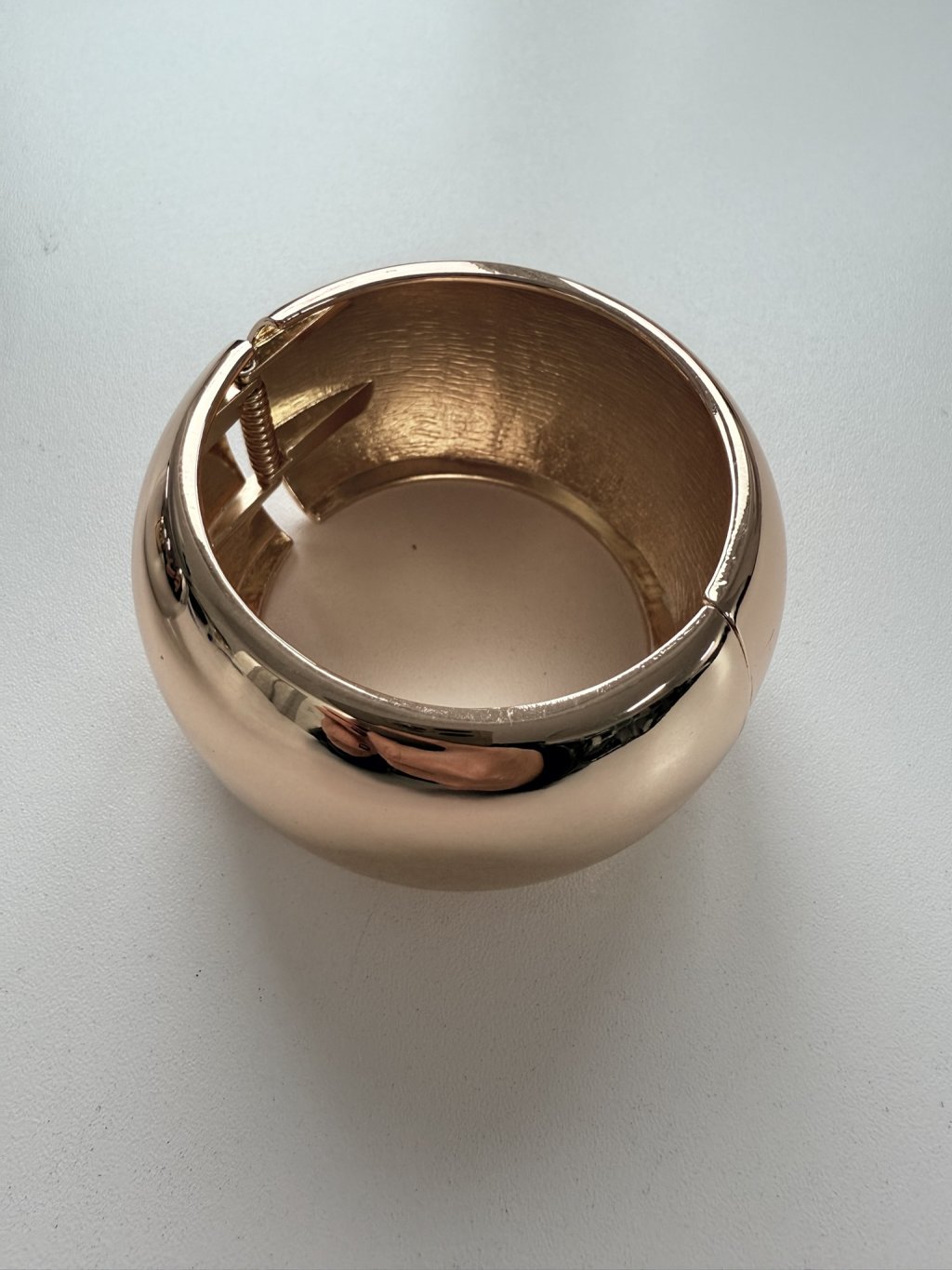 Široký náramok v striebornej a zlatej farbe s pružinou na otváranie. Obvod 26 cm, šírka 5 cm.