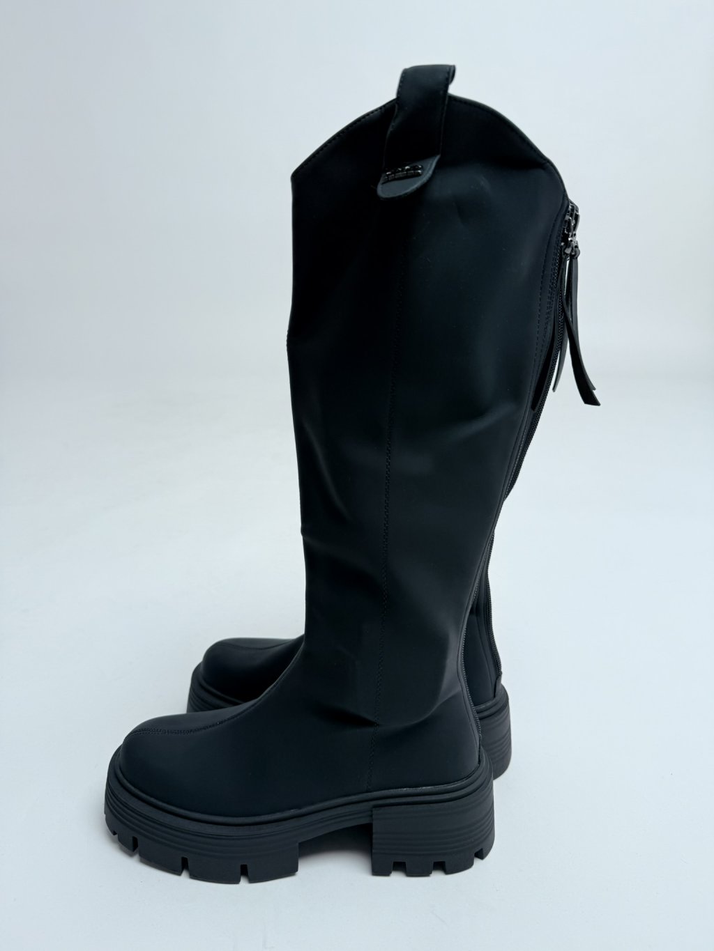 Čierne čižmy pod kolená so zipsom na zadnej strane topánky.