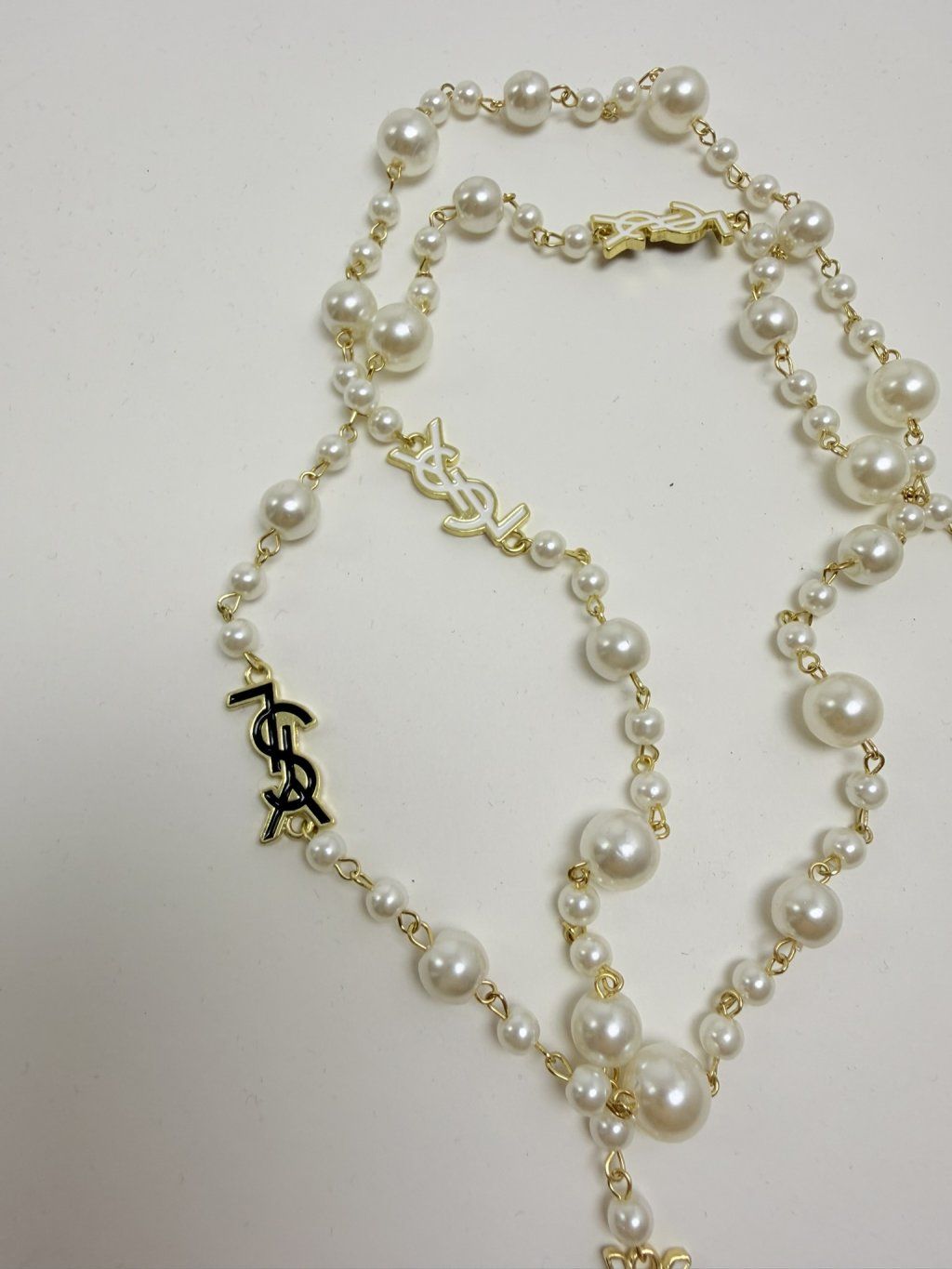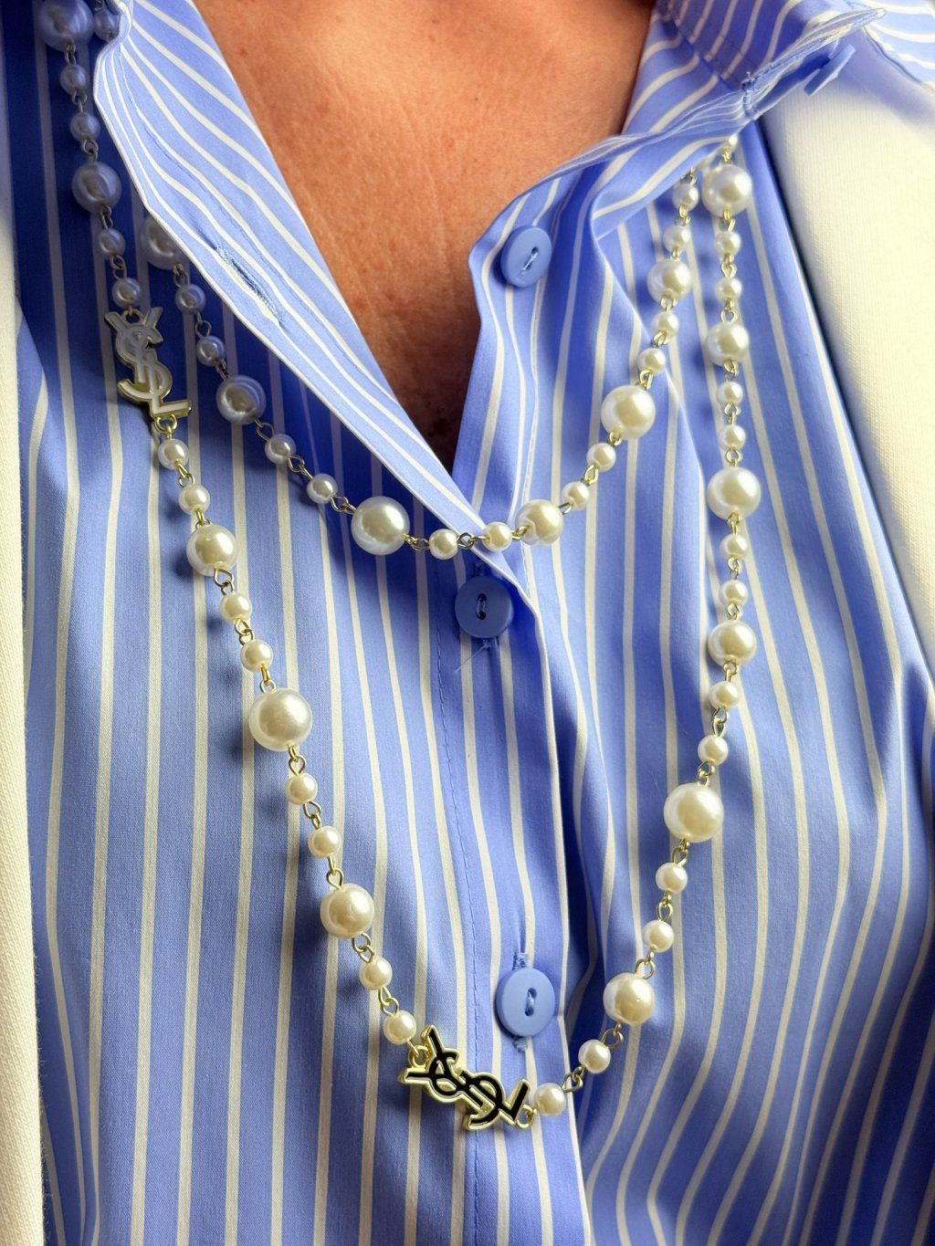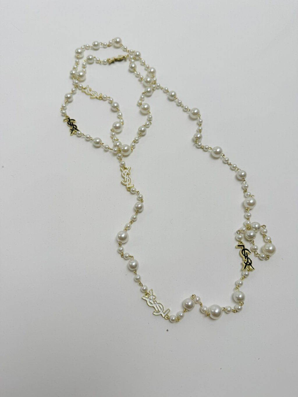 Perlový náhrdelník v kombinácii s kovom zlatej farby a písmenami na jednej strane v čiernej a na druhej strane v bielej farbe.