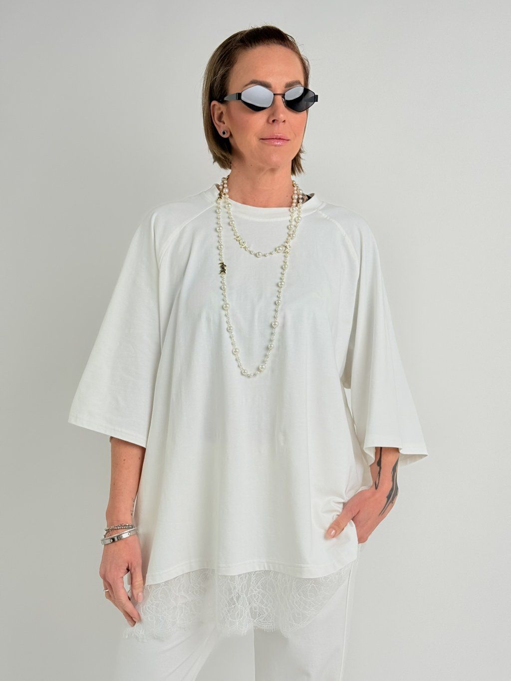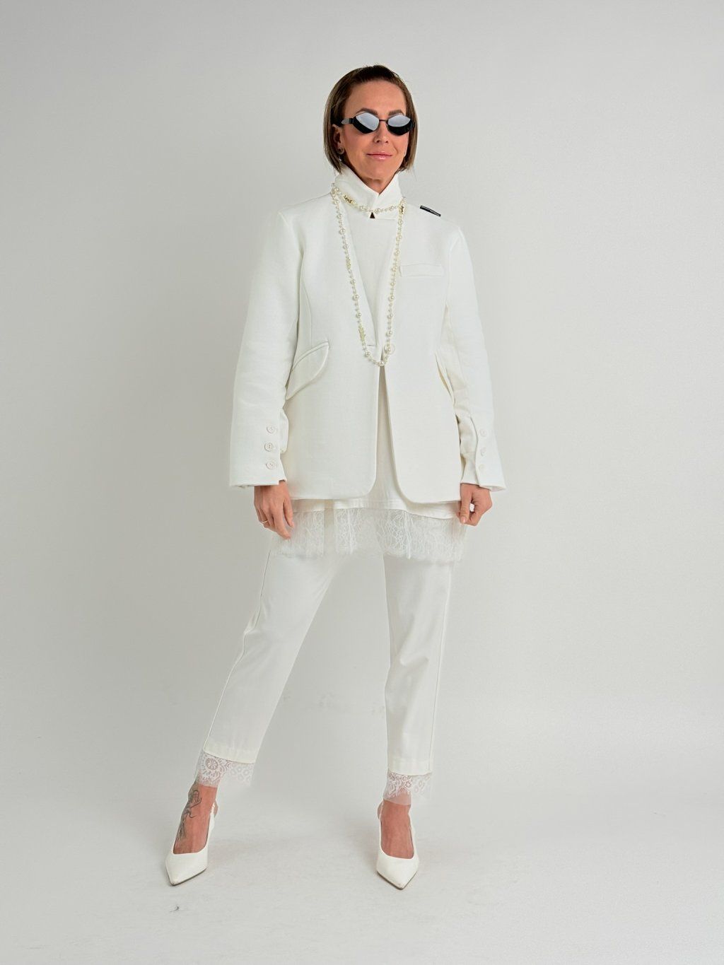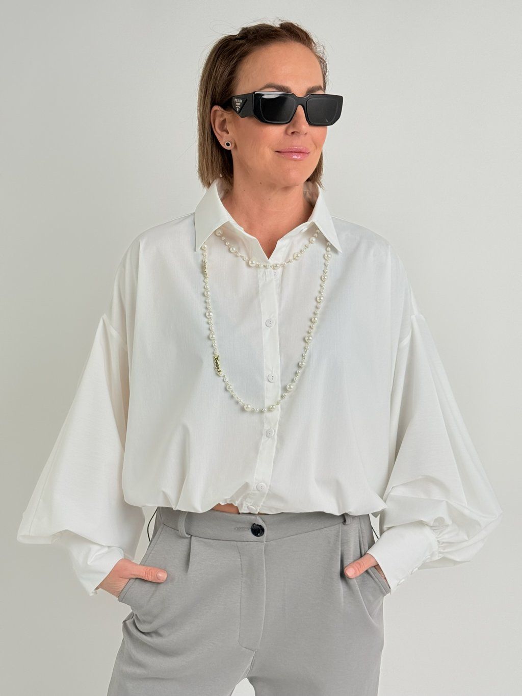 Perlový náhrdelník v kombinácii s kovom zlatej farby a písmenami na jednej strane v čiernej a na druhej strane v bielej farbe.