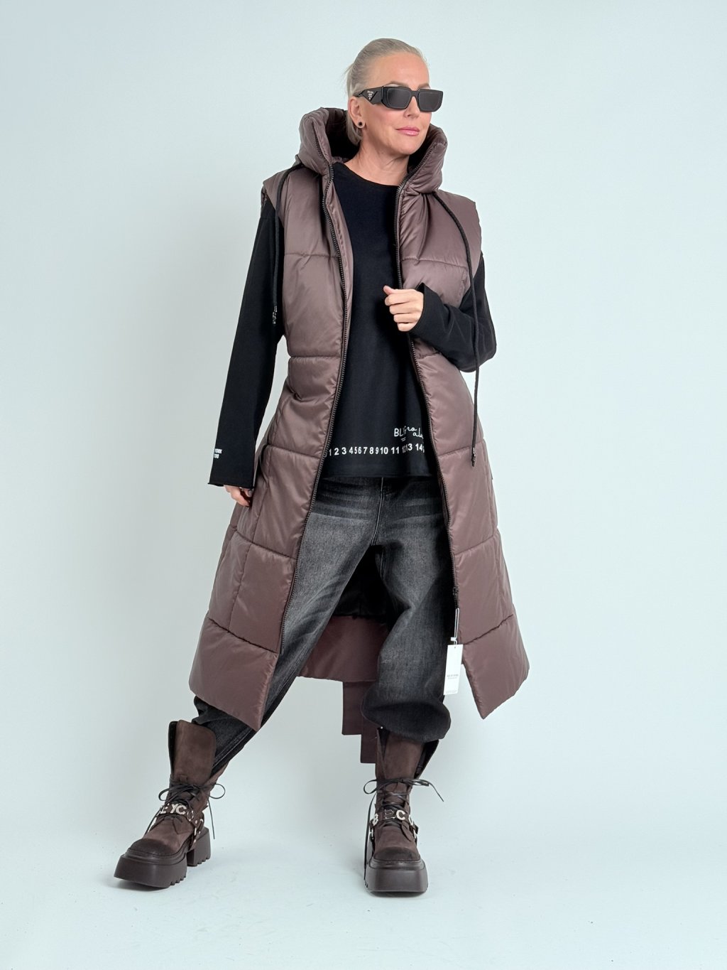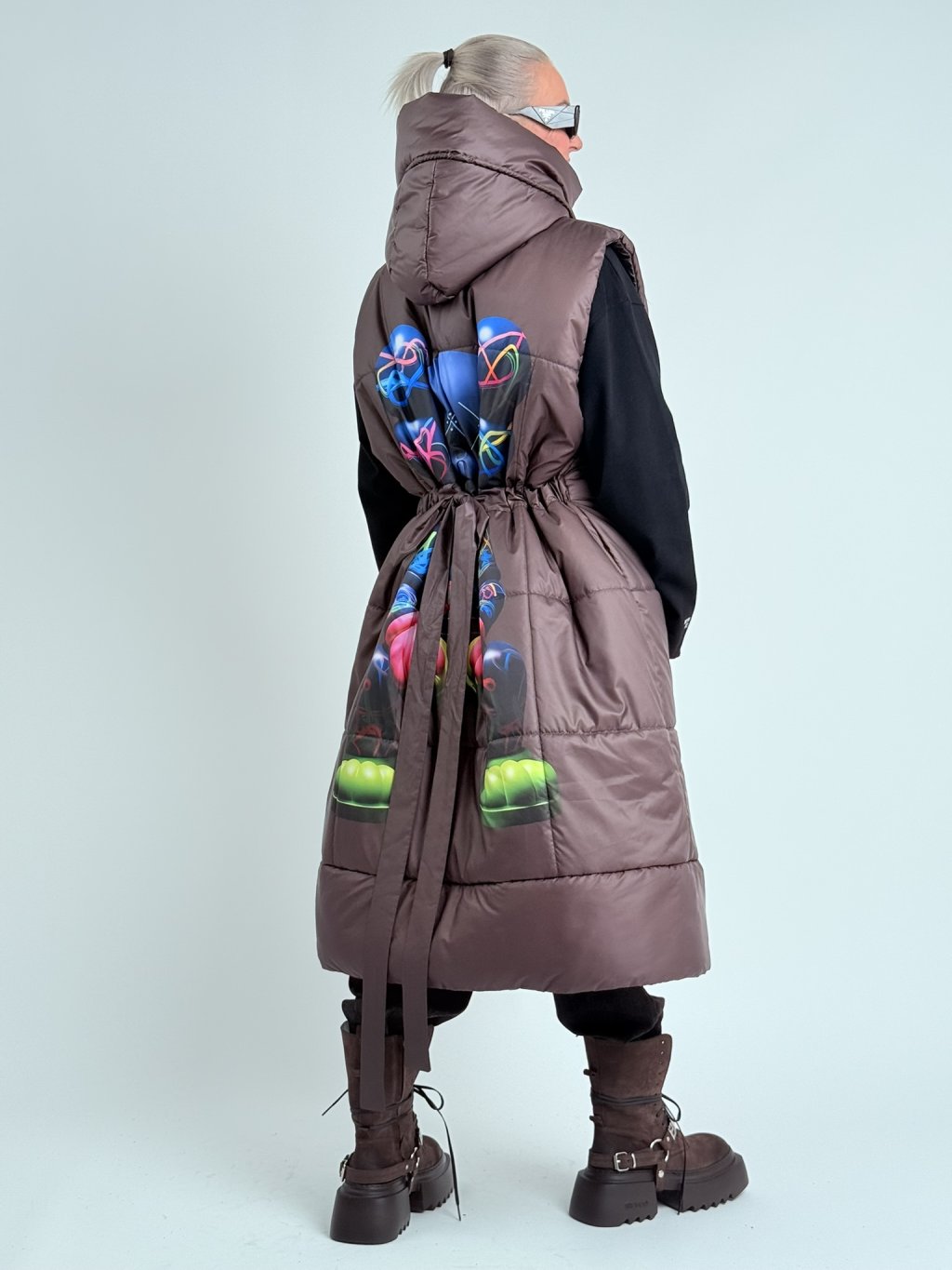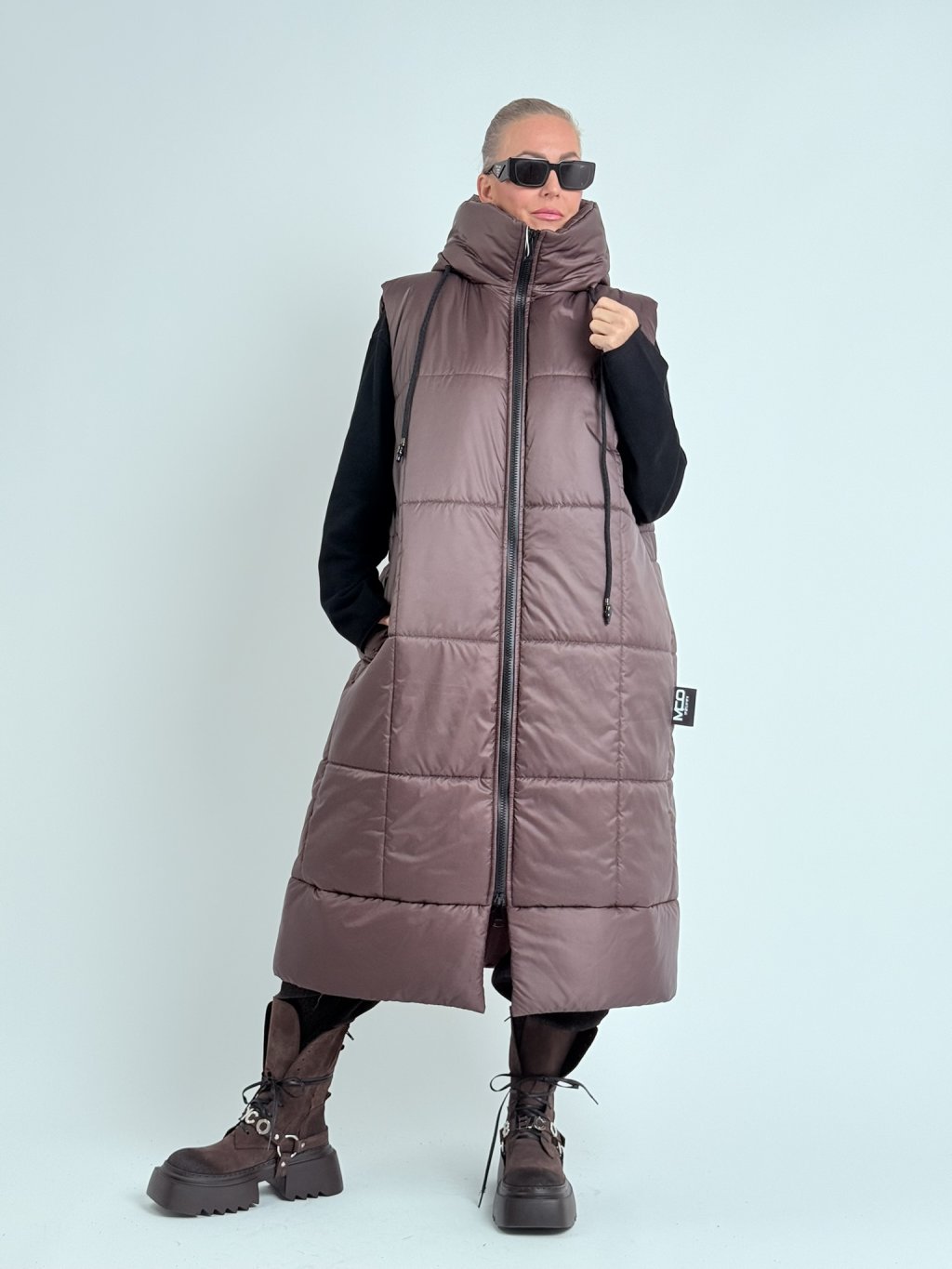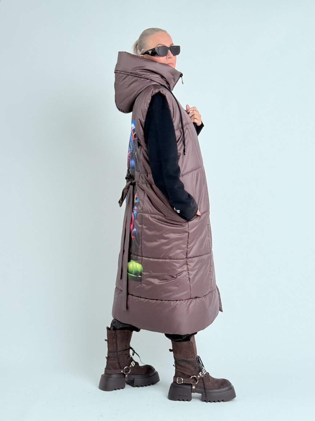 Skvelá, prešívaná, dlhá vesta s kapucňou nadrozmernej veľkosti s obojstranným zipsom, potlačou na chrbte a možnosťou nastavenia šírky pása vďaka šnúrke.