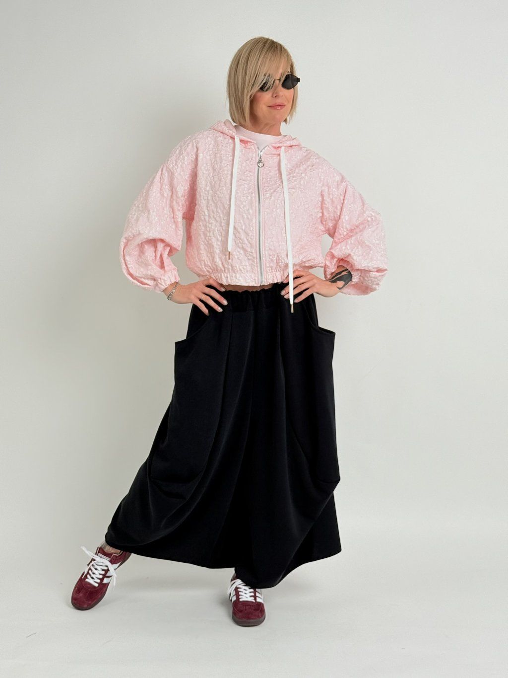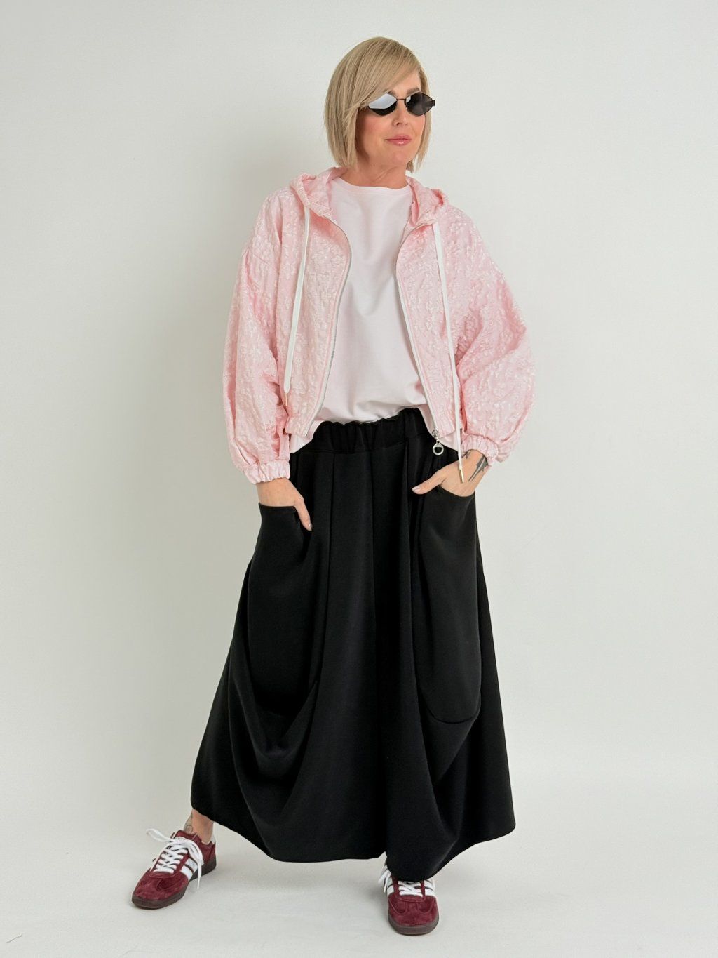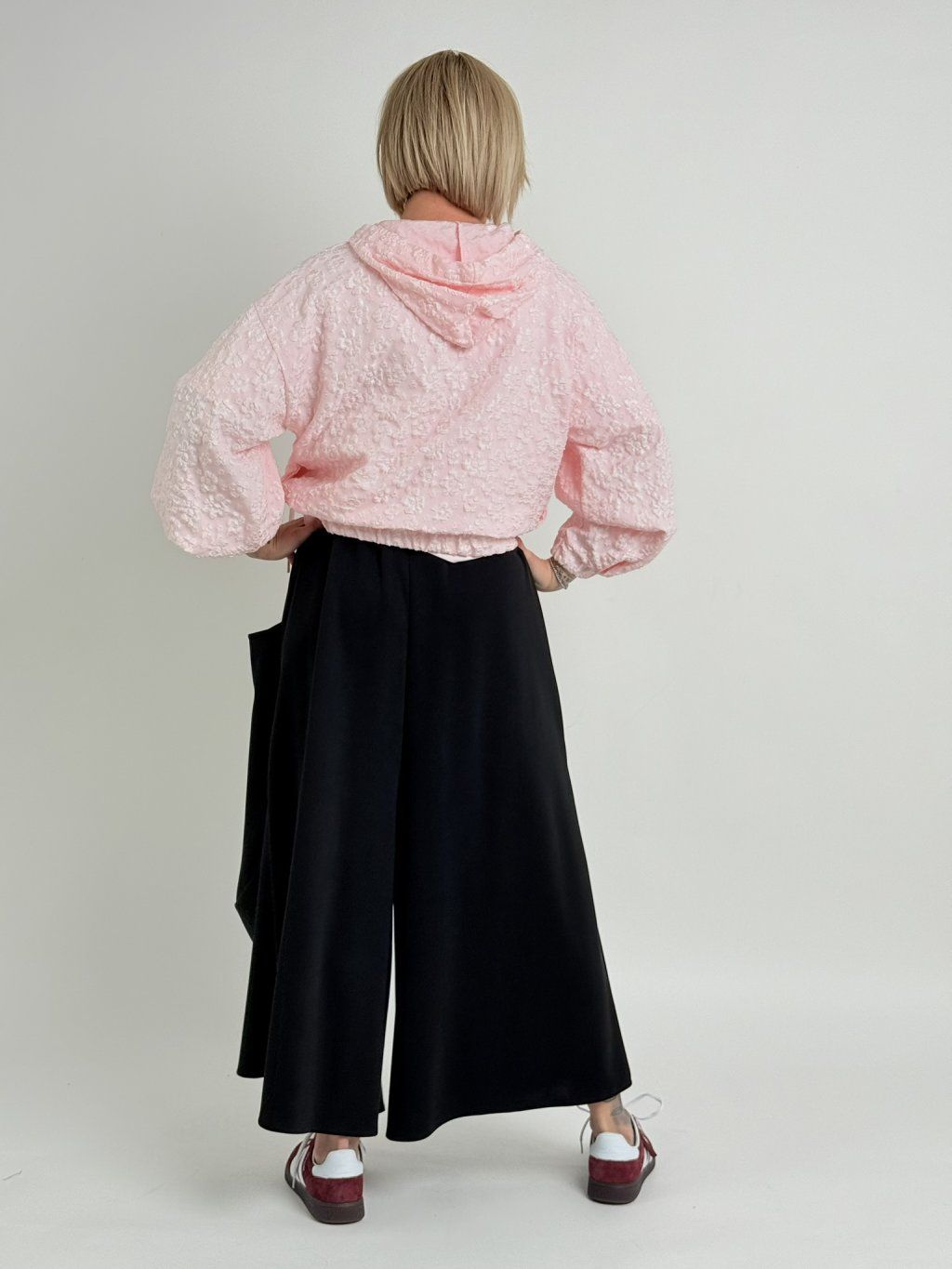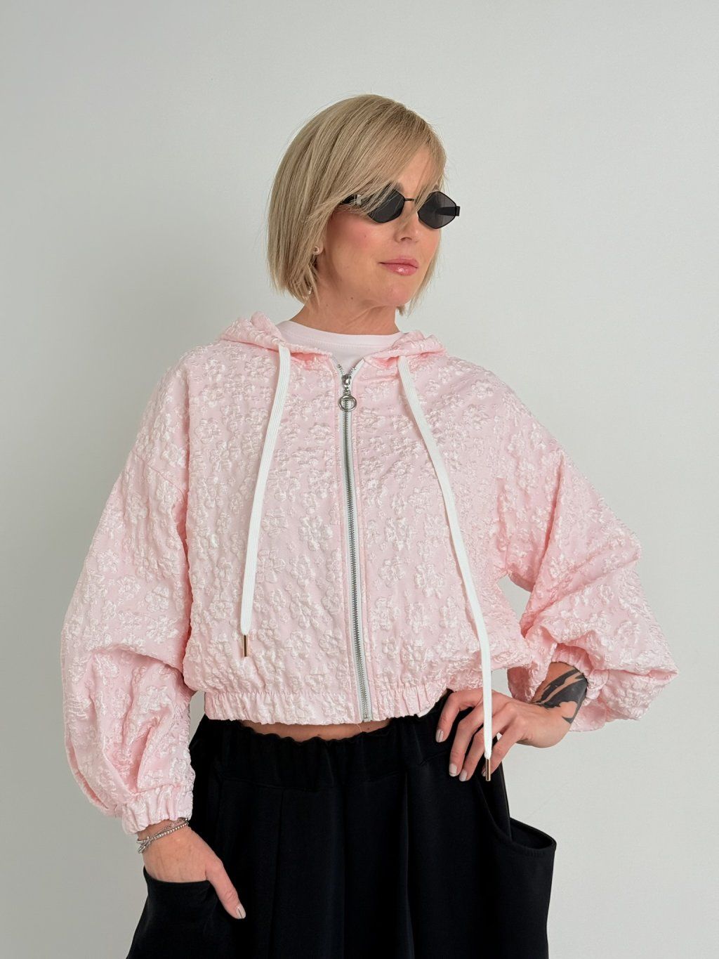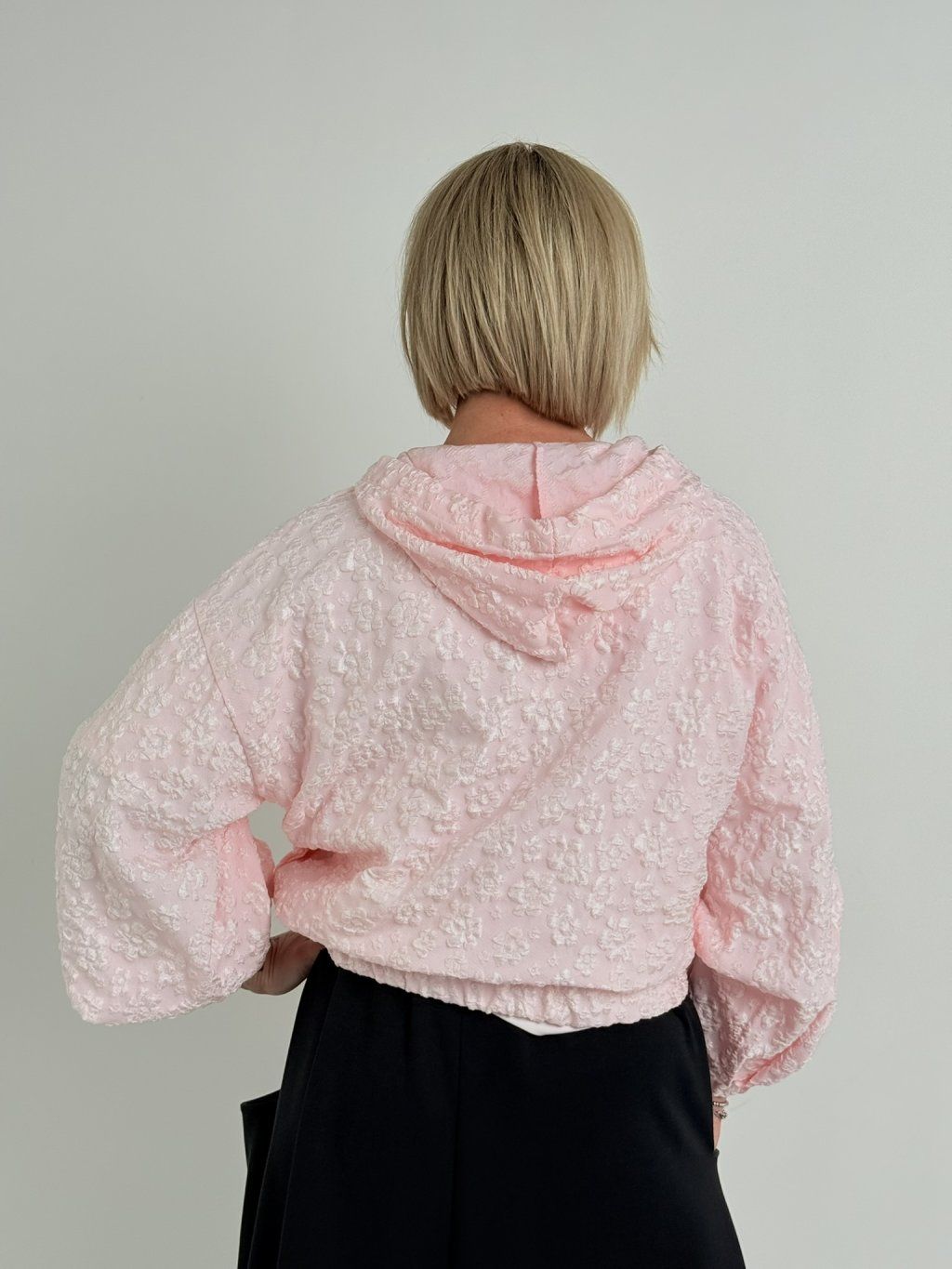 Bunda s reliéfnym vzorom, kapucňou, zapínaním na zips a gumou na konci rukávov a spodnej časti. Predné vrecká.