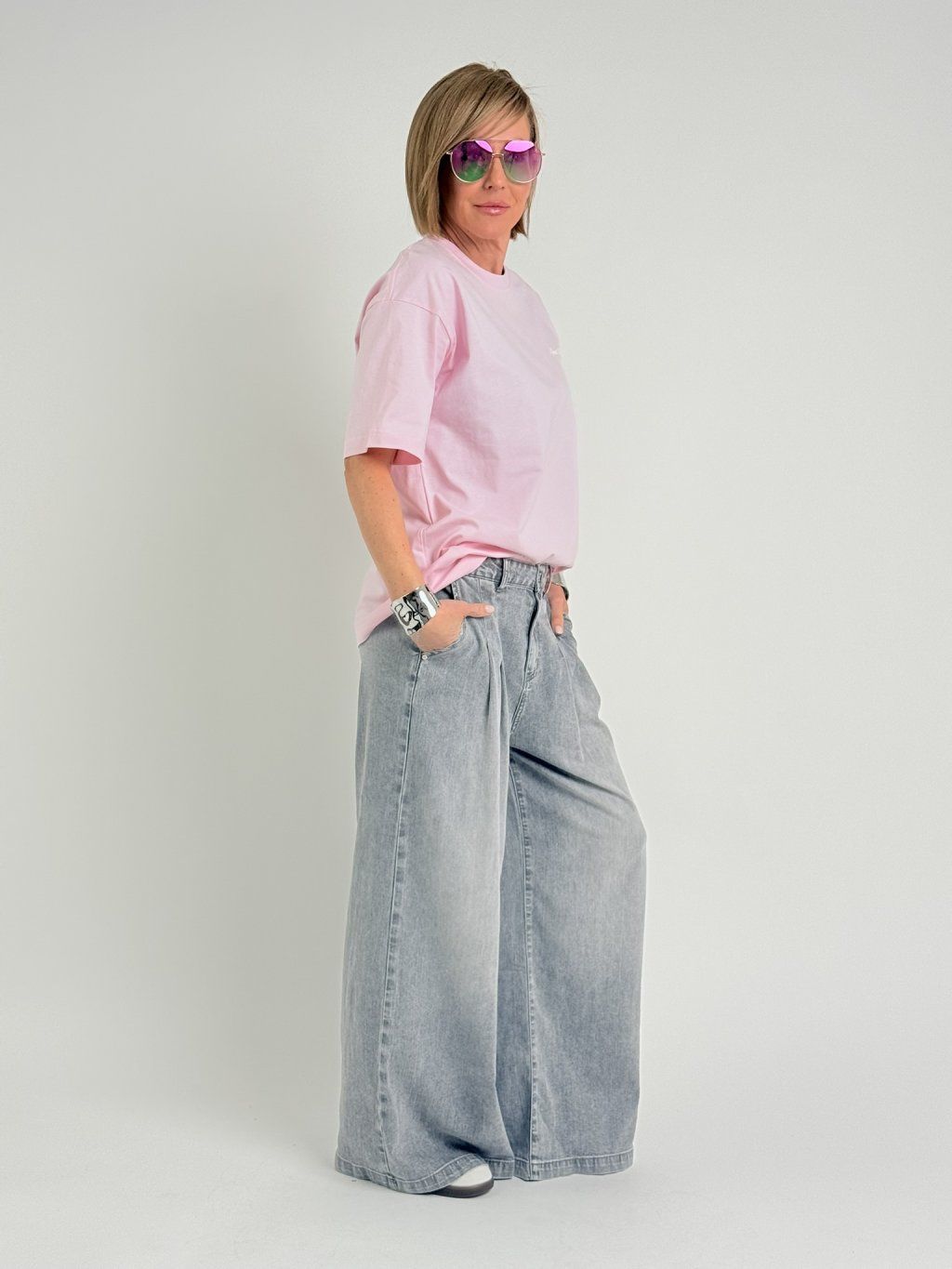 Krásne voľnejšie tričko s okrúhlym výstrihom, krátkymi rukávmi a bielou potlačou na prednej a zadnej strane.