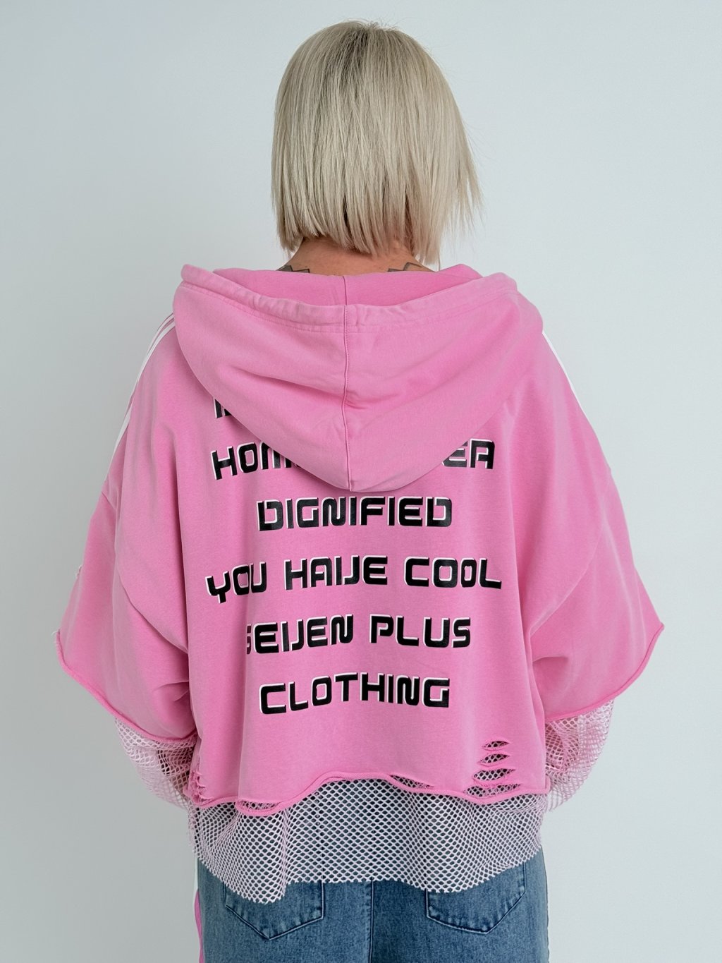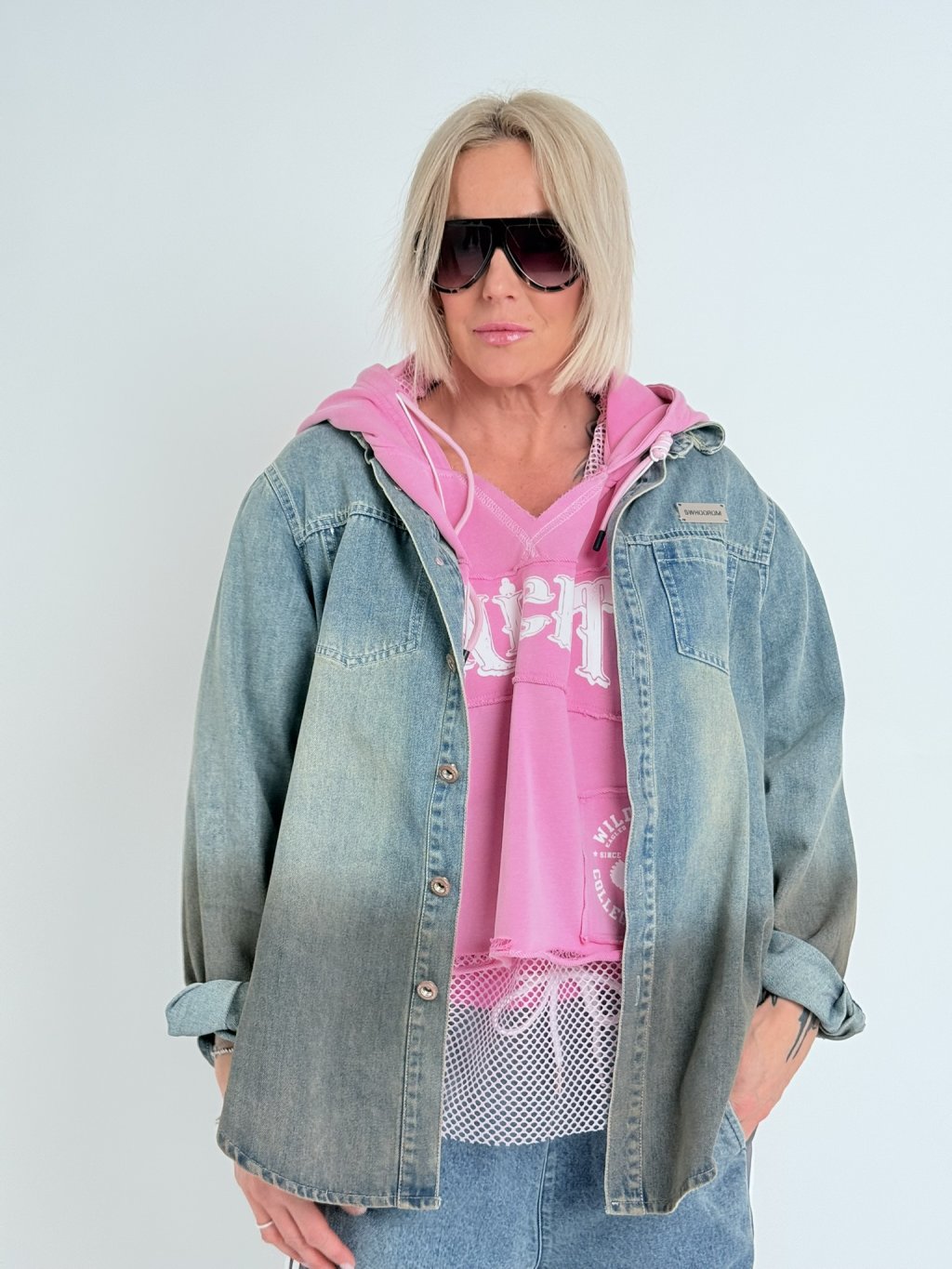 Zaujímavo navrhnutá nadrozmerná mikina s kapucňou v kombinácii džínsoviny a sieťoviny.