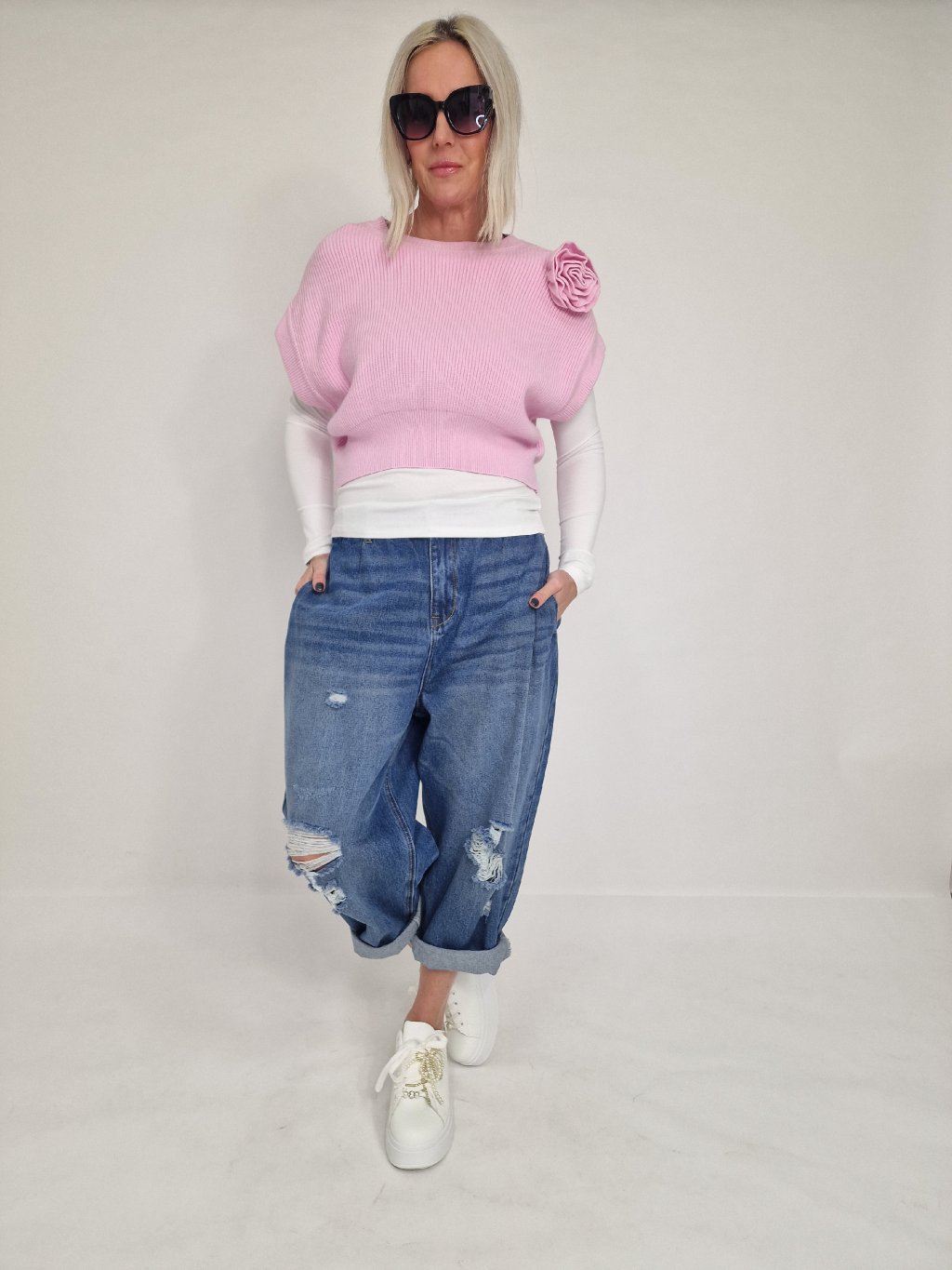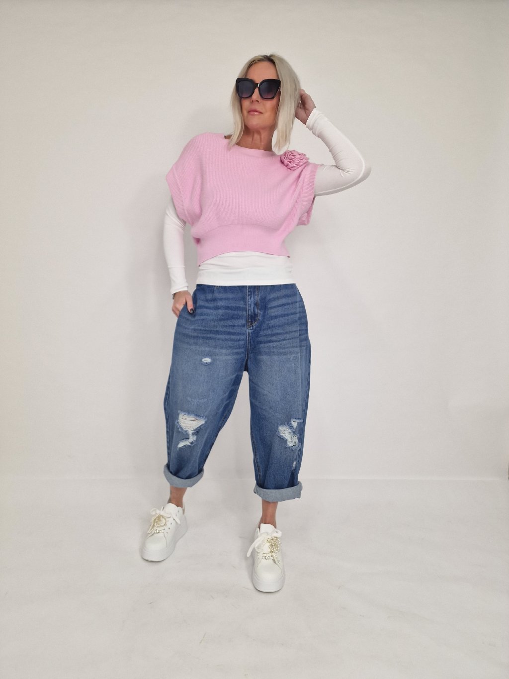 Skvelá krátka vesta so spadnutými rukávmi a kvetinovou aplikáciou, ktorú možno nosiť na mnoho spôsobov. Samostatne, cez tričko, dlhé tričko, košeľu alebo pencil šaty.