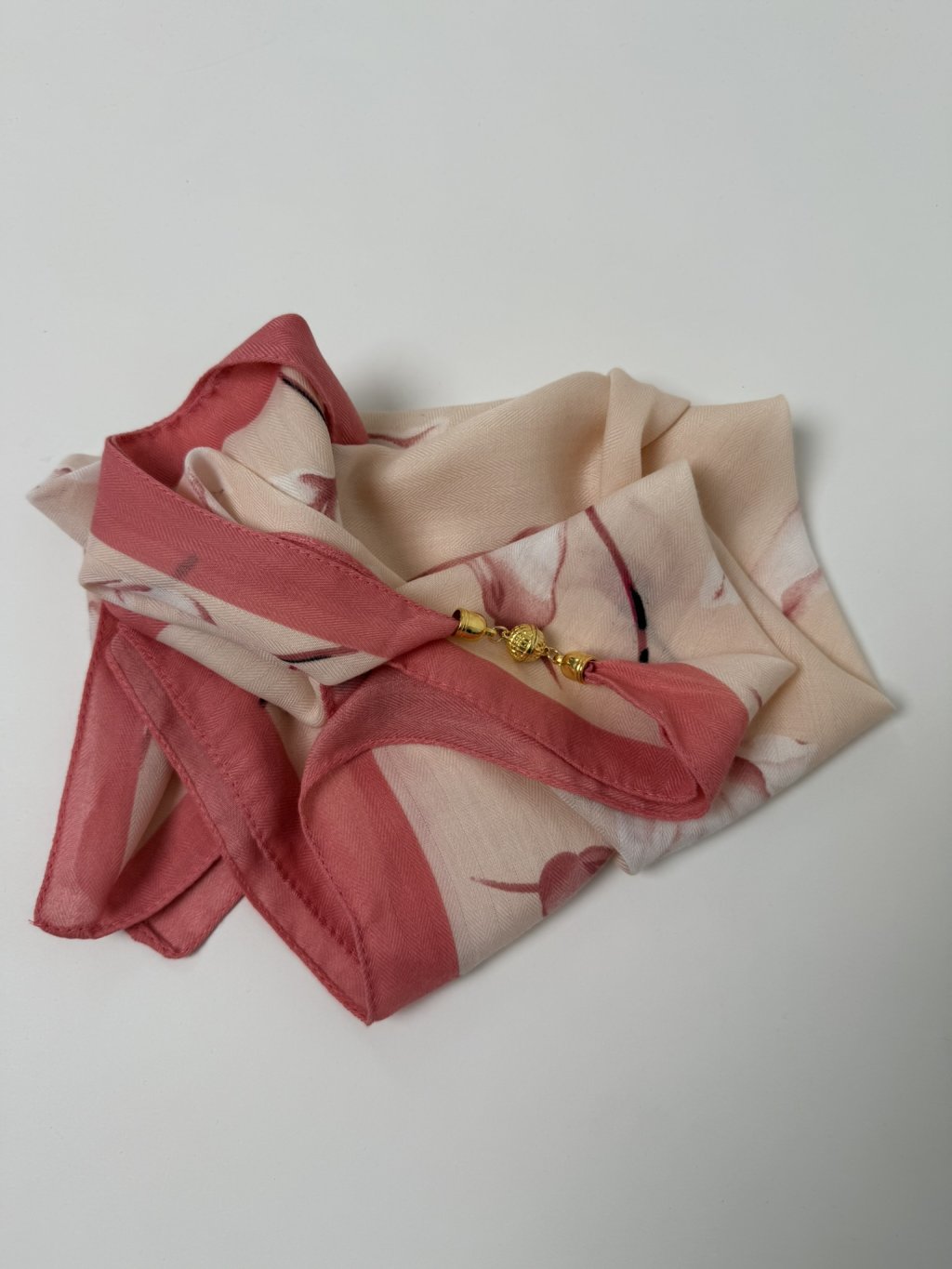 Krásna šatka, ktorú si môžete uviazať okolo krku, pása alebo na kabelku. Na koncoch sú magnety.