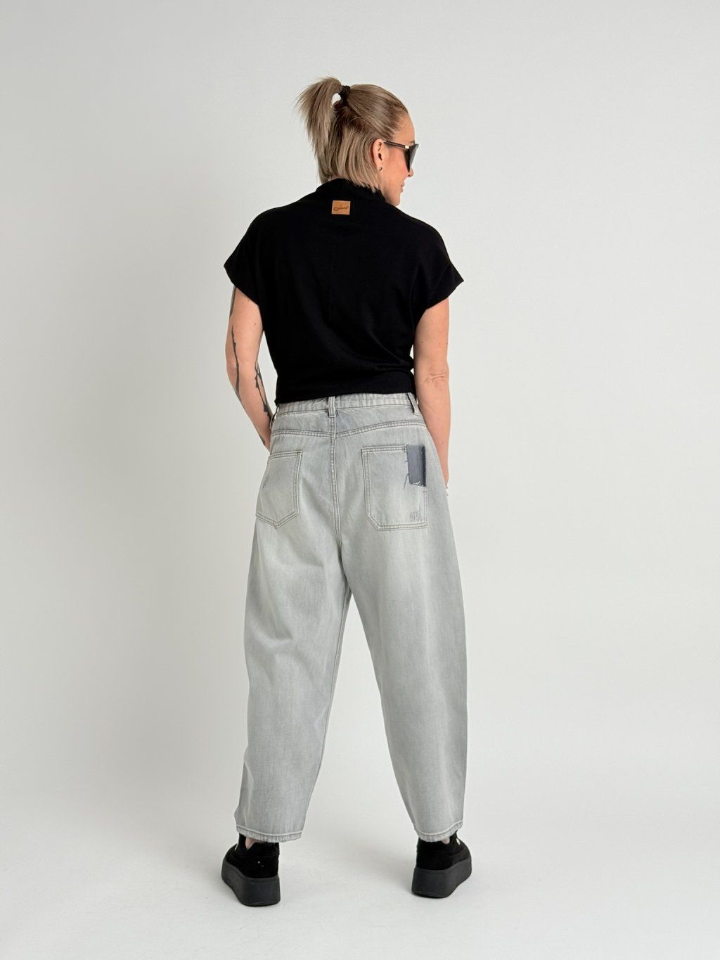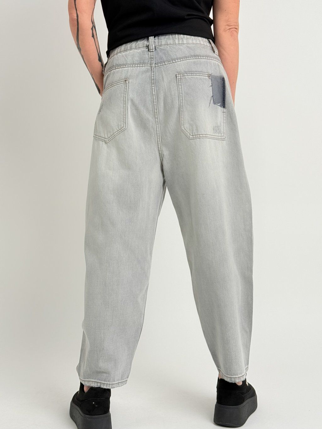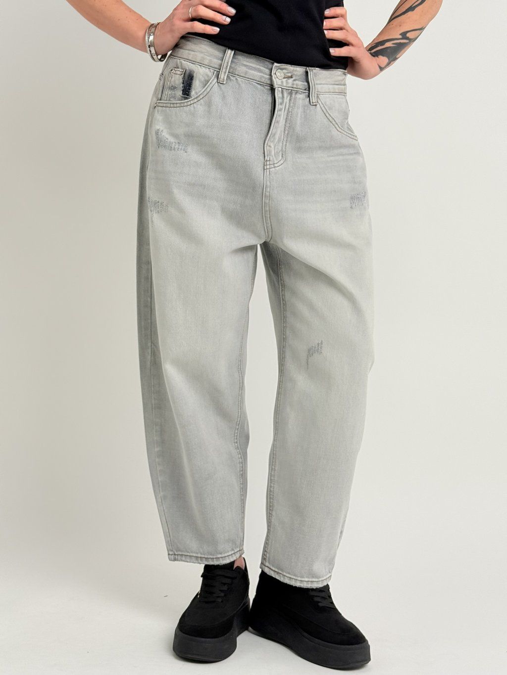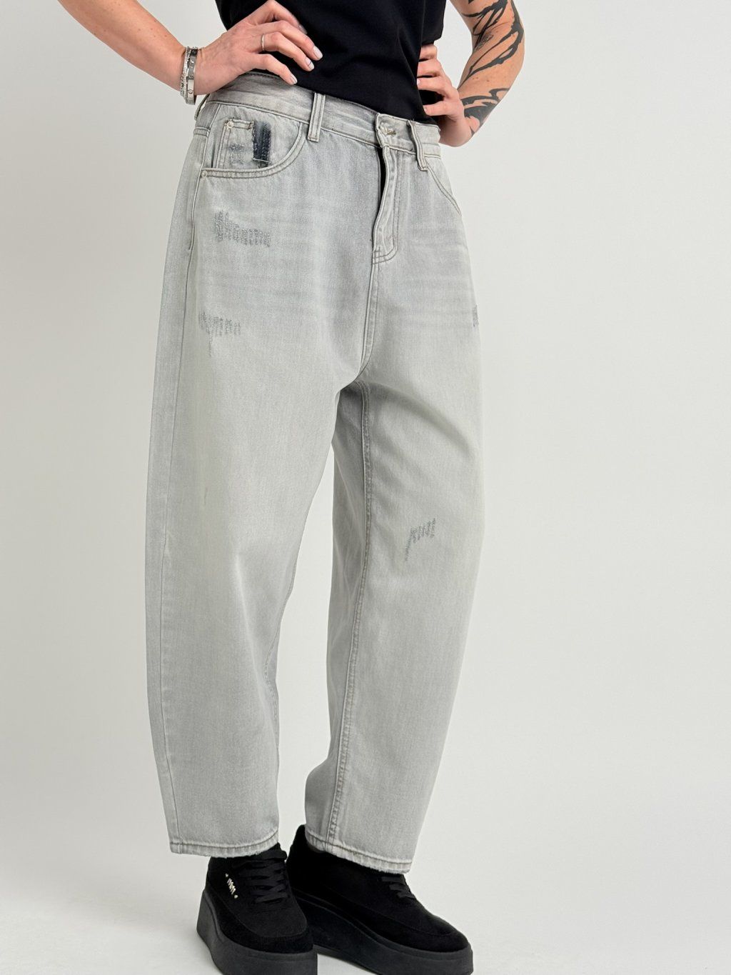 Šedé džínsy balónového strihu, dve vrecká vpredu a dve vzadu, kombinované s tmavším odtieňom látky, elastický pás vzadu, zapínanie na zips a gombík, vpredu naznačená trhlina.
