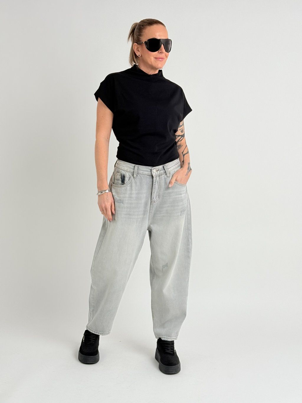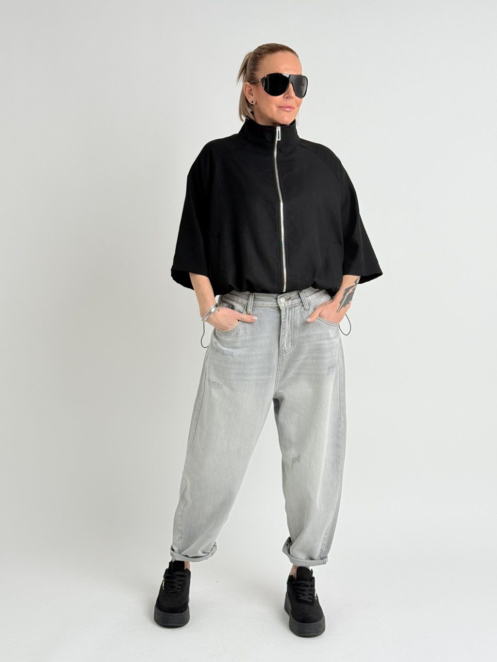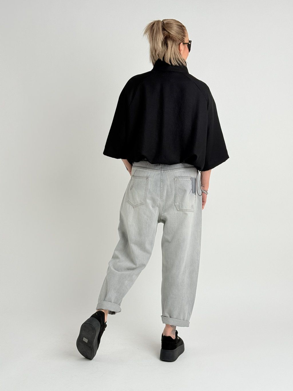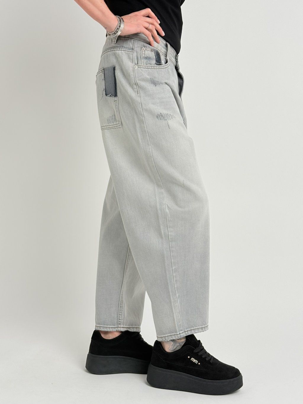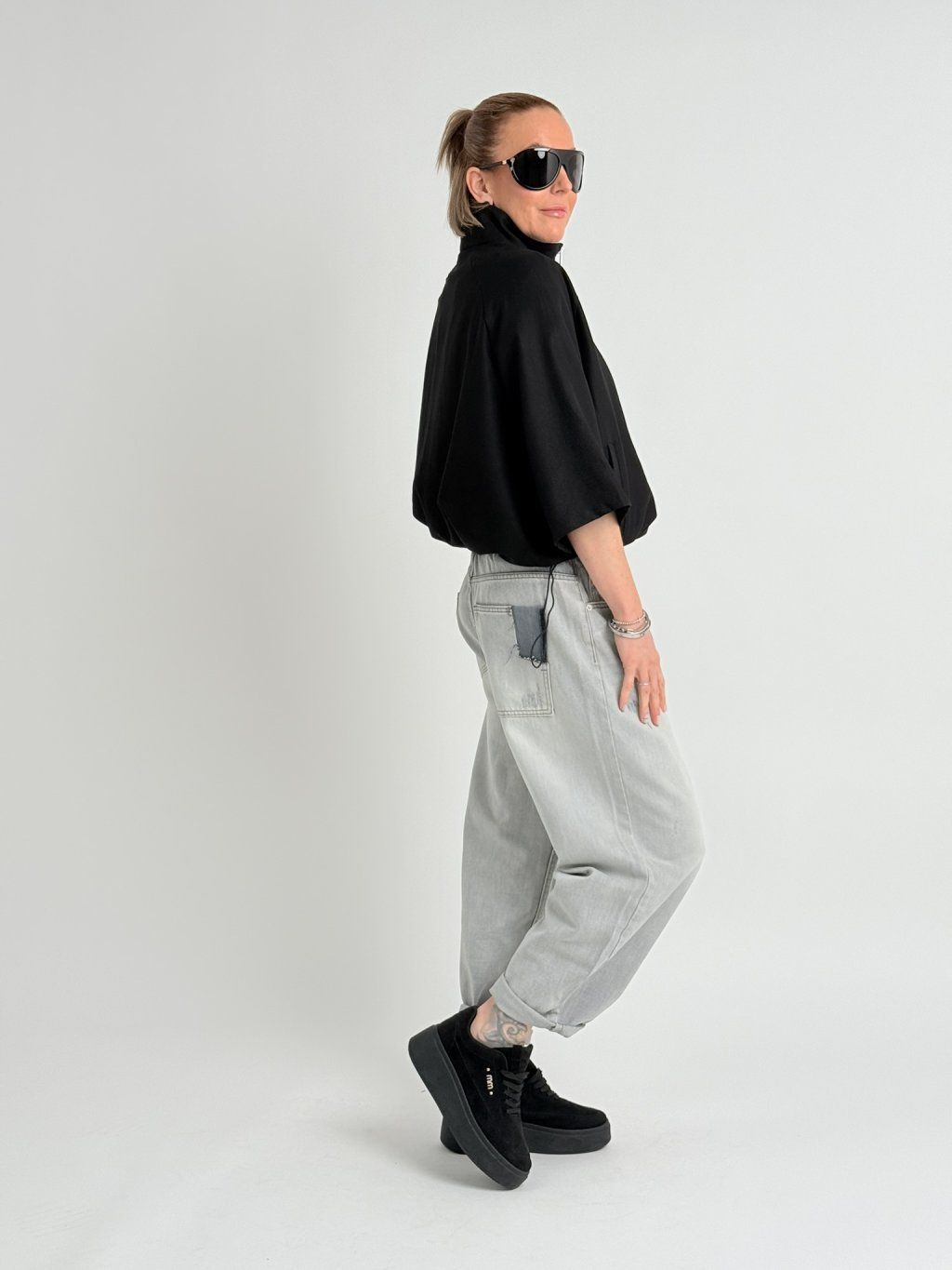 Šedé džínsy balónového strihu, dve vrecká vpredu a dve vzadu, kombinované s tmavším odtieňom látky, elastický pás vzadu, zapínanie na zips a gombík, vpredu naznačená trhlina.