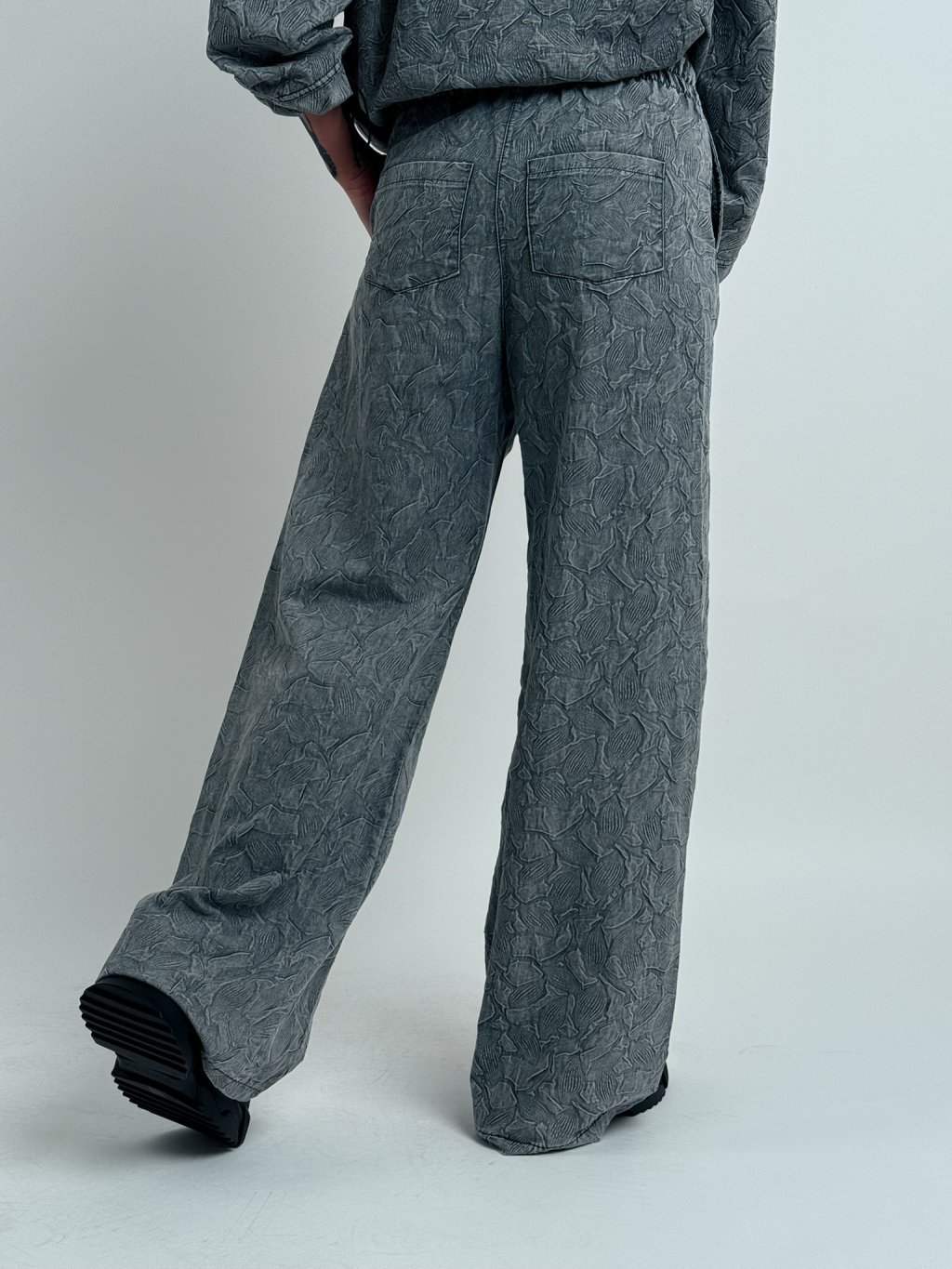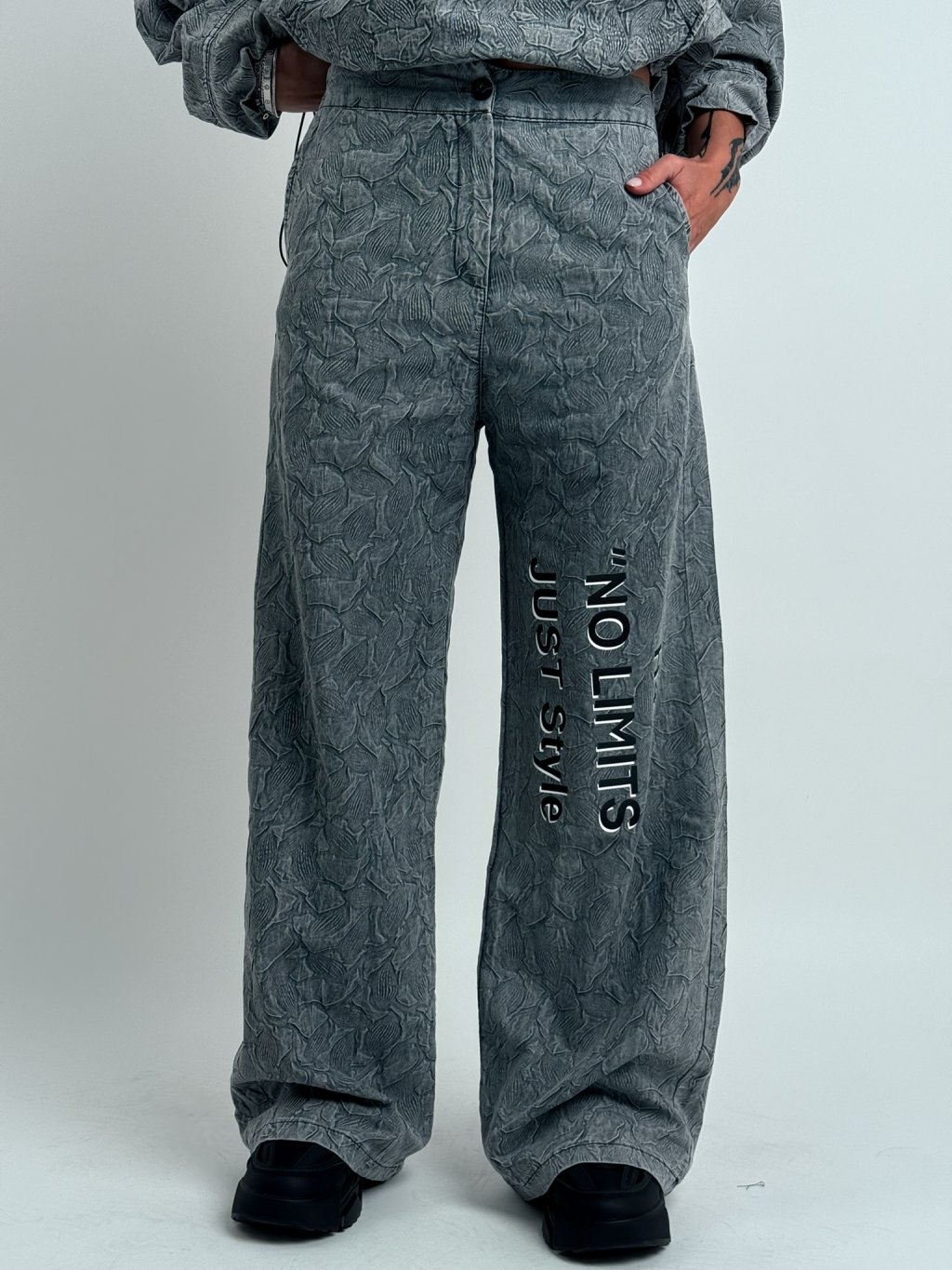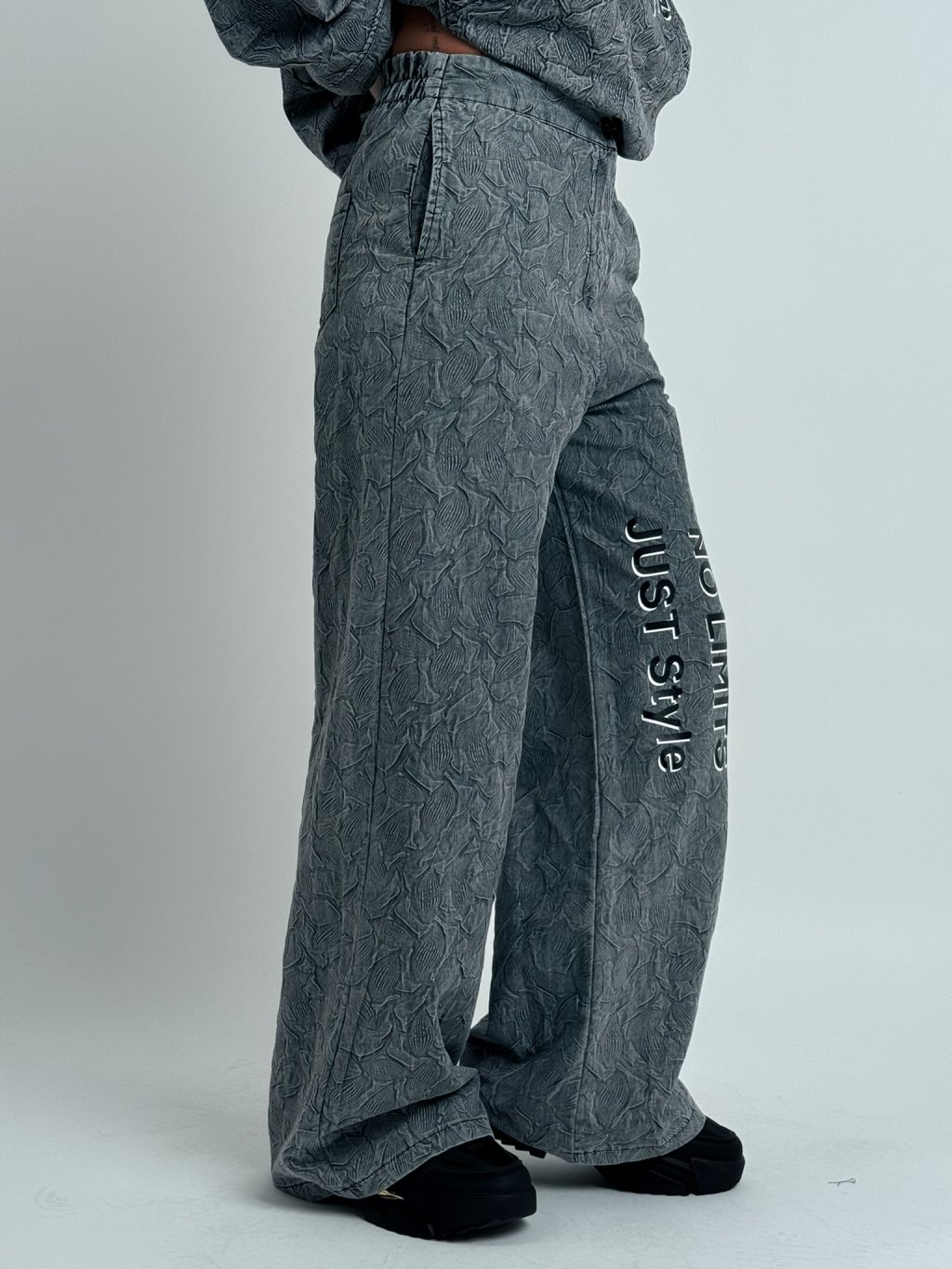 Parádne širšie nohavice s reliéfnym vzorom, logom na jednej nohavici, zapínaním na zips, elastickým pásom vzadu a bočnými vreckami.
