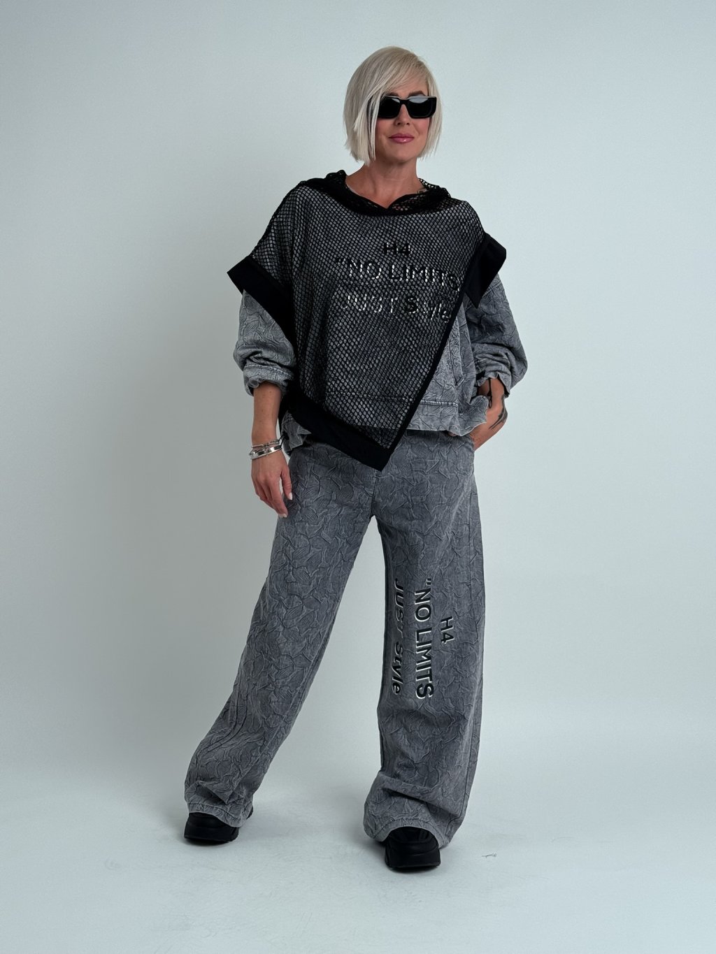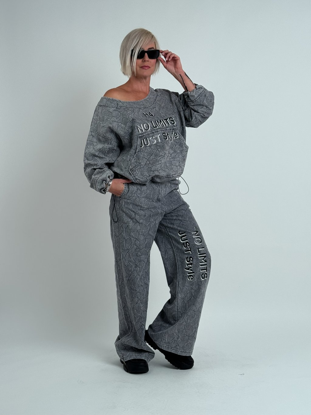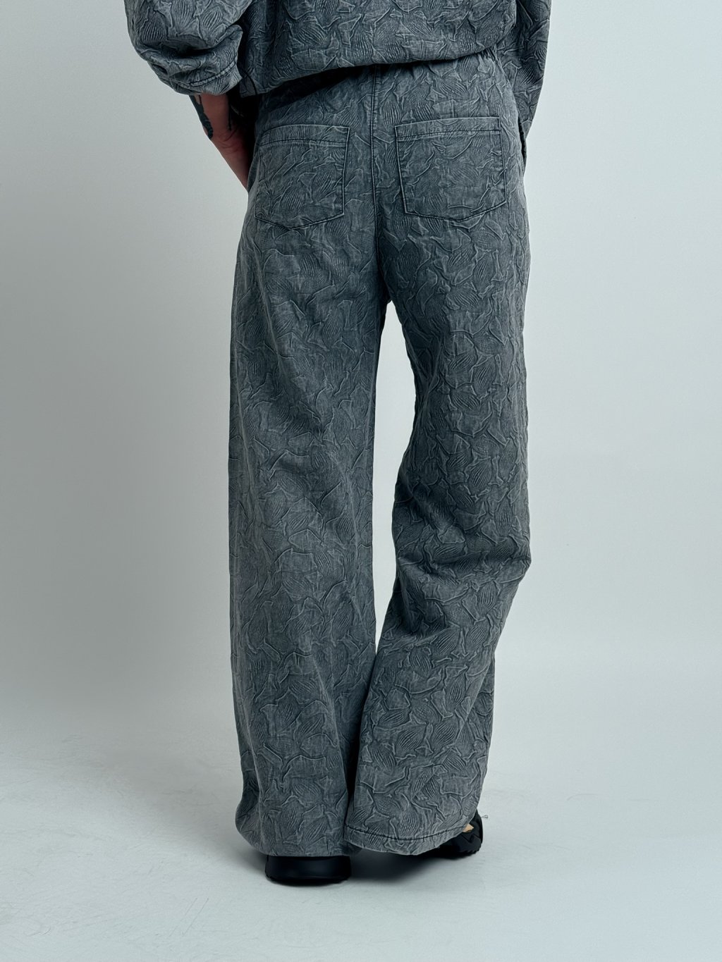 Parádne širšie nohavice s reliéfnym vzorom, logom na jednej nohavici, zapínaním na zips, elastickým pásom vzadu a bočnými vreckami.