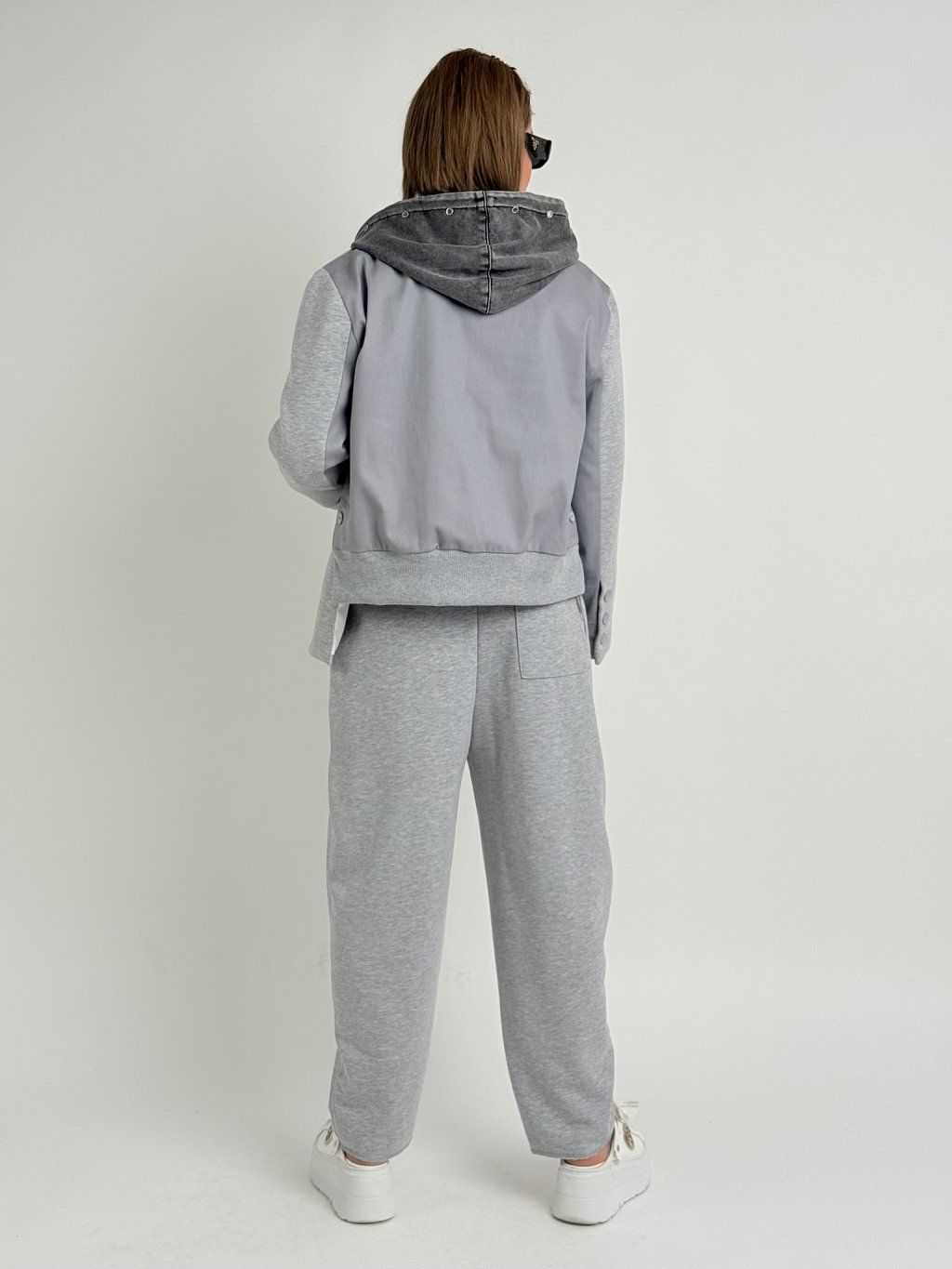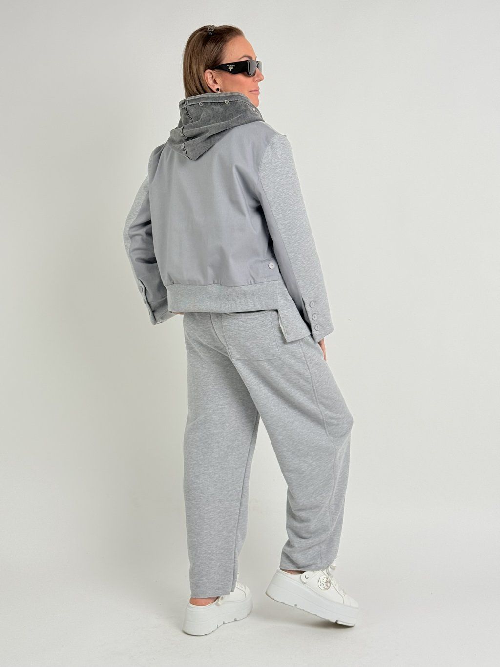 Luxusná nadrozmerná bunda s podšívkou, v kombinácii úpletu a džínsoviny, s dlhými rukávmi ukončenými tromi gombíkmi a rozparky na bokoch bundy, ktoré sa dajú zmenšiť zapnutím jedného gombíka.