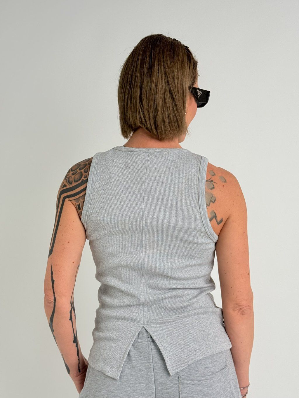 Jednoduché tielko s okrúhlym výstrihom, švom prechádzajúcim stredom chrbta a zakončeným rozparkom.