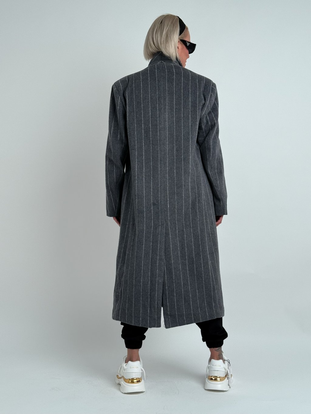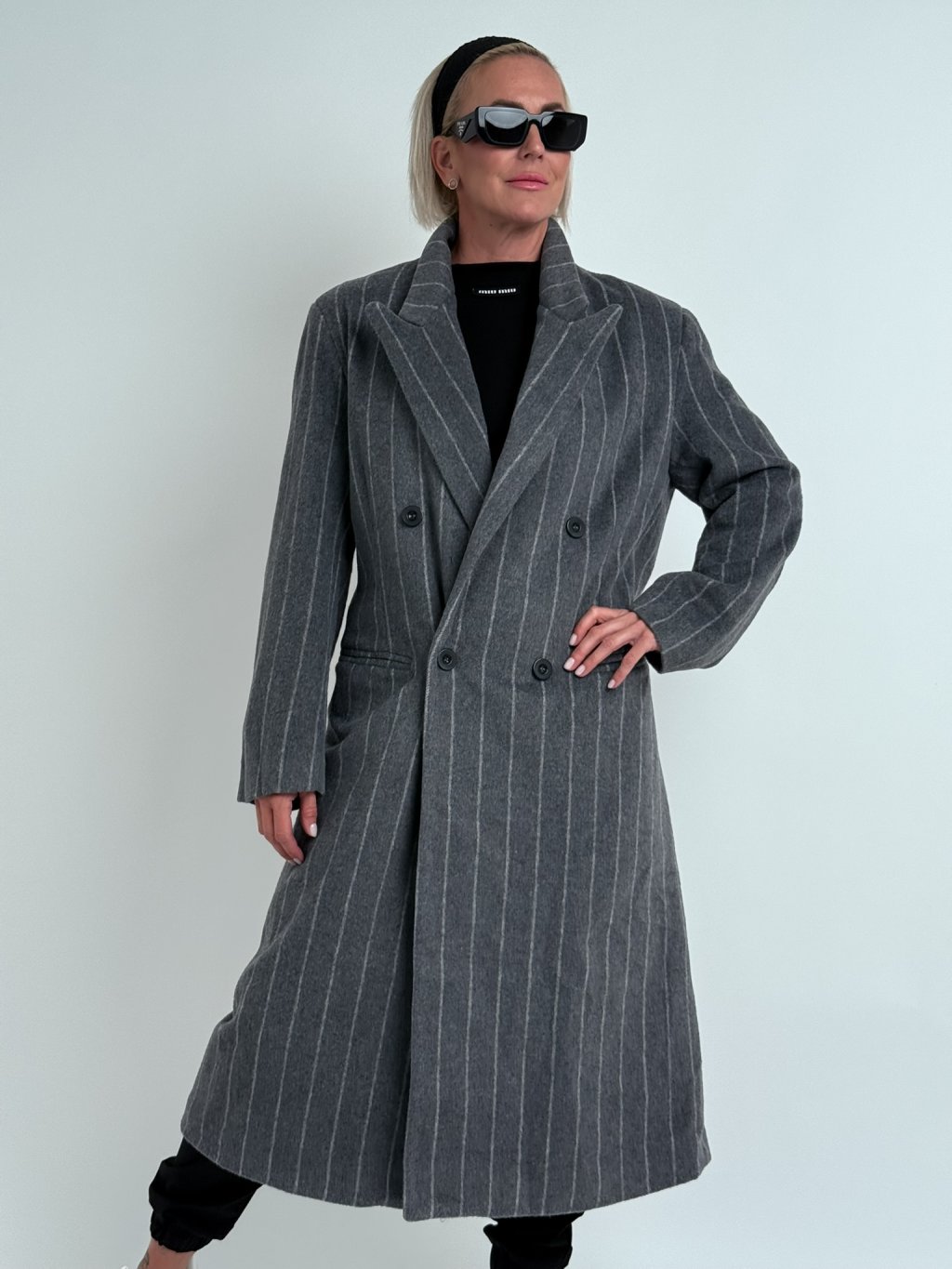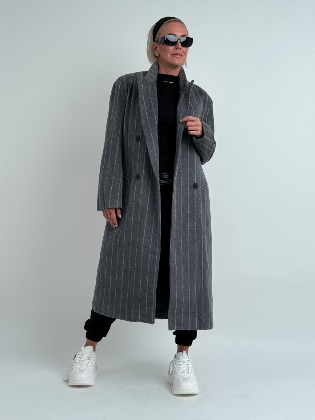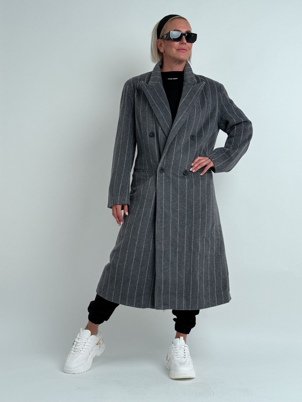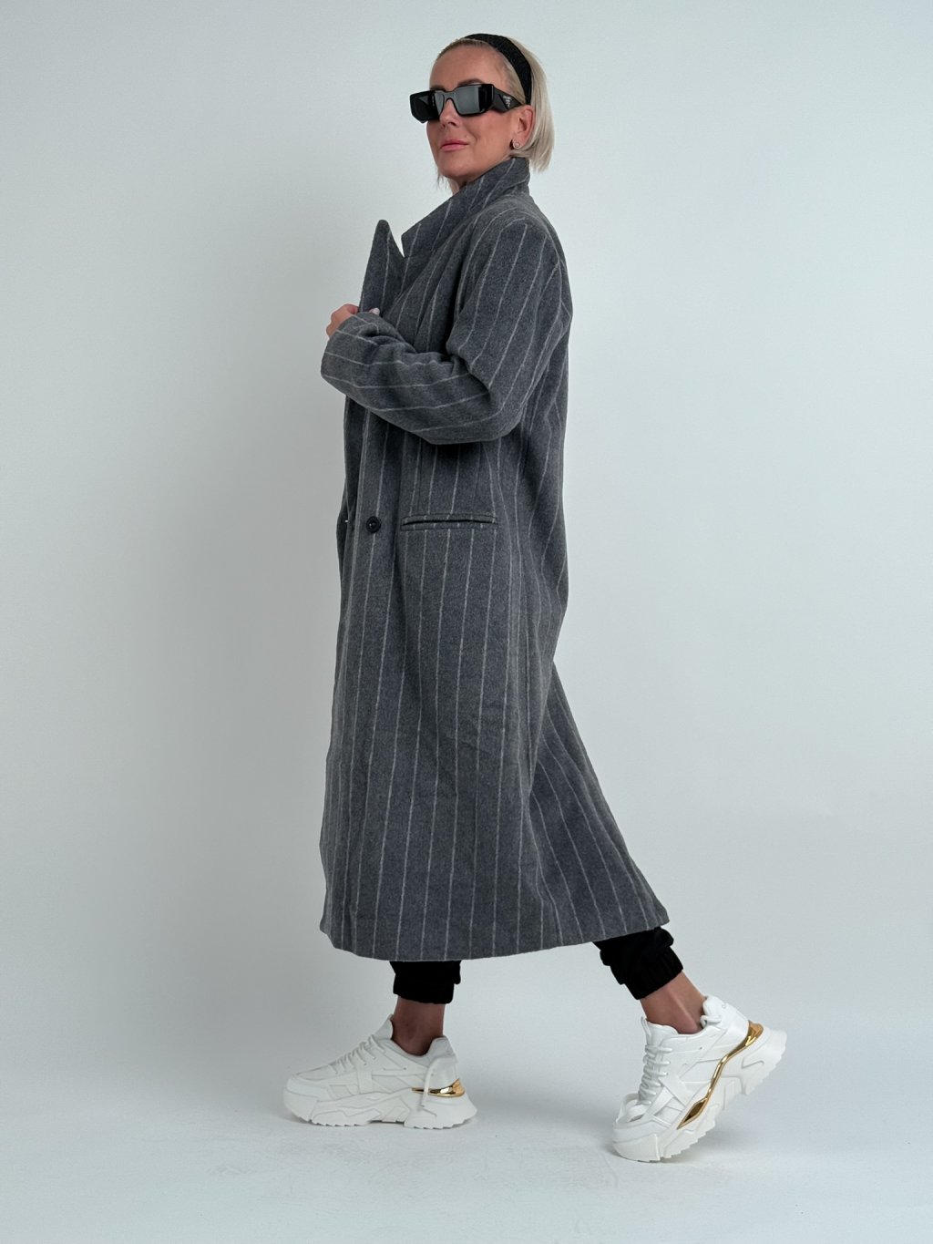 Krásny, nadčasový, extravagantný kabát s jemným prúžkom, podšitý, so zapínaním na gombíky. Budete neprehliadnuteľný!!!