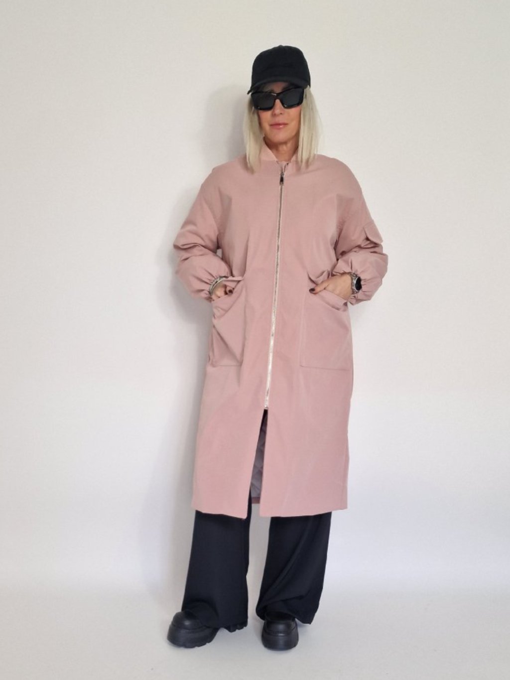 Skvelý bomber kabát s prešívanou podšívkou, zapínaním na zips, rukávmi ukončenými gumou, nášivkou vo výstrihu a veľkými vreckami s nášivkami.